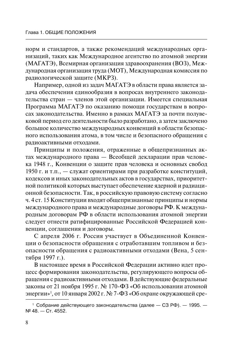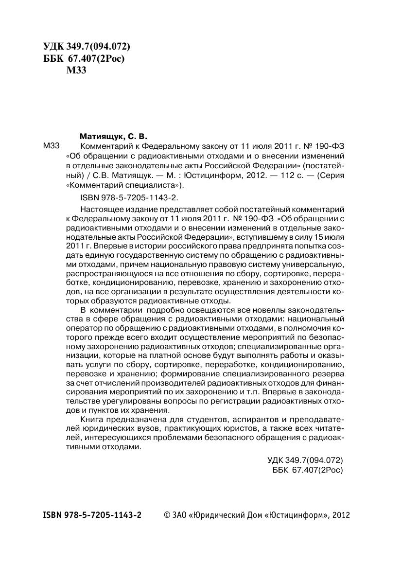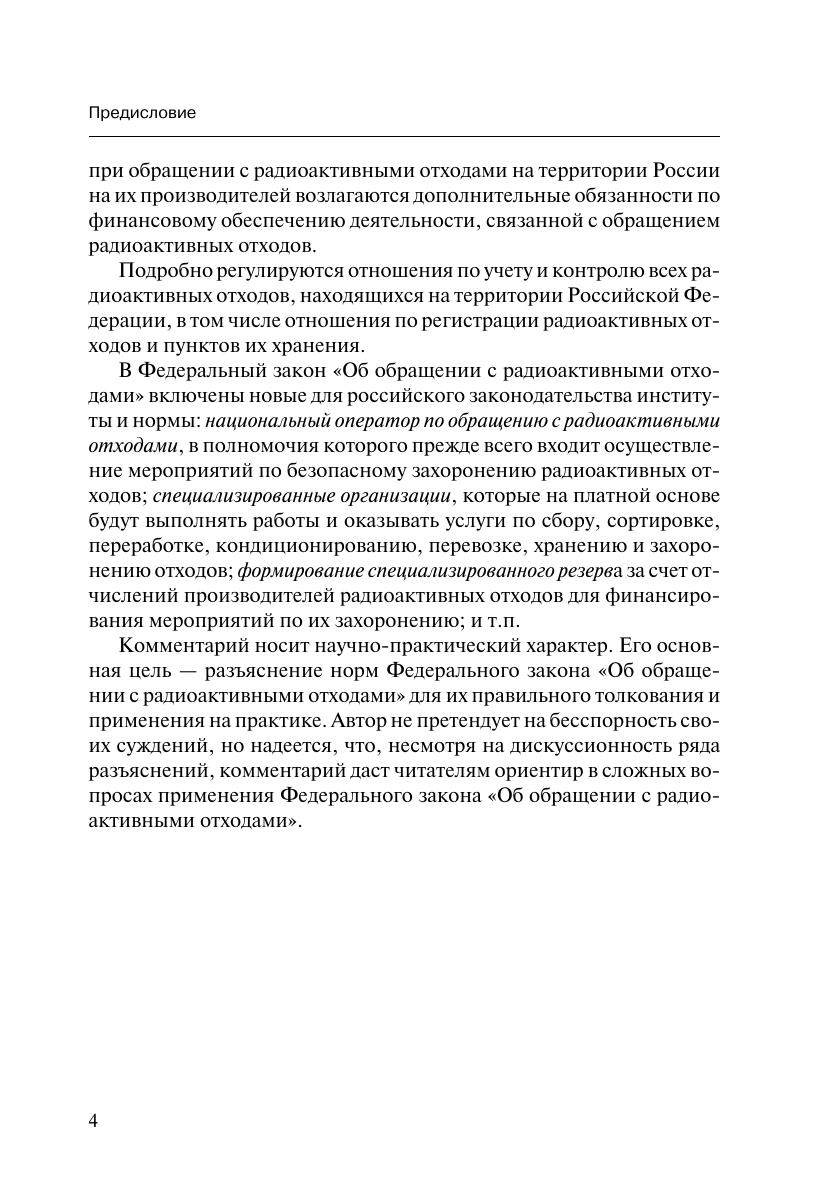 Настоящее издание представляет собой постатейный комментарий к Федеральному закону от 11 июля 2011 г. № 190-ФЗ «Об обращении с радиоактивными отходами и о внесении изменений в отдельные законодательные акты Российской Федерации», вступившему в силу 15 июля 2011 г. Впервые в истории российского права предпринята попытка создать единую государственную систему по обращению с радиоактивными отходами, причем национальную правовую систему универсальную, распространяющуюся на все отношения по сбору, сортировке, переработке, кондиционированию, перевозке, хранению и захоронению отходов, на все организации в результате осуществления деятельности которых образуются радиоактивные отходы.