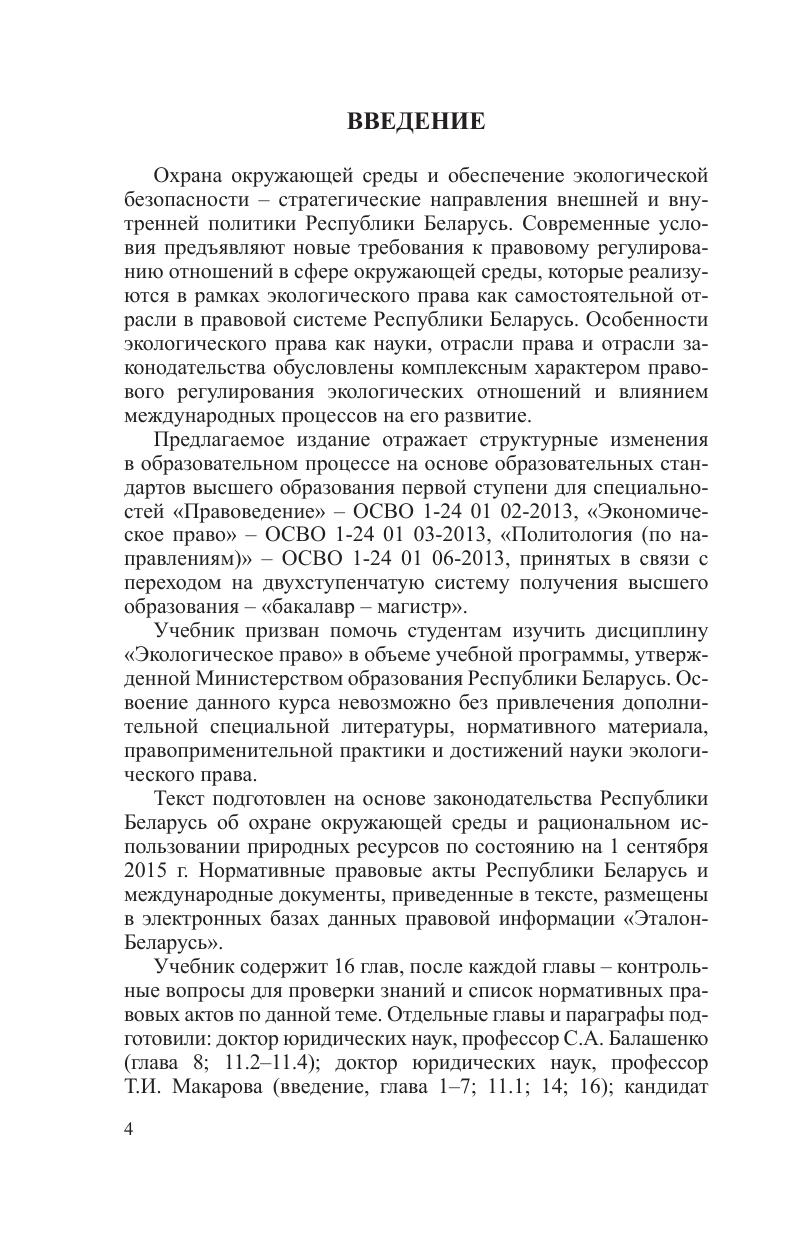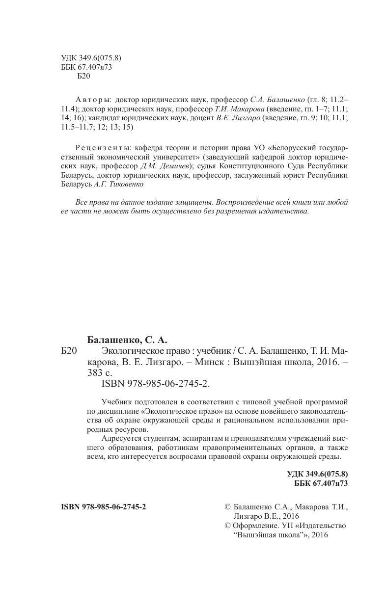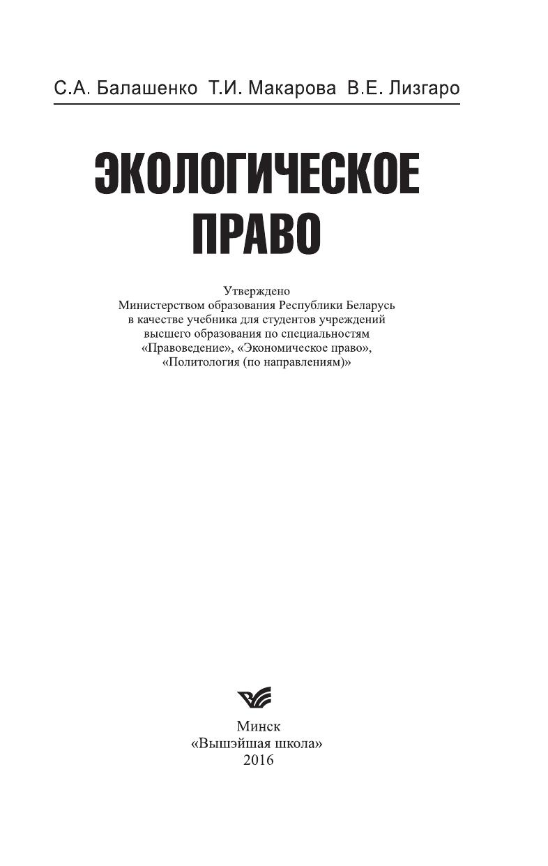 Учебник подготовлен в соответствии с типовой учебной программой по дисциплине «Экологическое право» на основе новейшего законодательства об охране окружающей среды и рациональном использовании природных ресурсов. Адресуется студентам, аспирантам и преподавателям учреждений высшего образования, работникам правоприменительных органов, а также всем, кто интересуется вопросами правовой охраны окружающей среды.