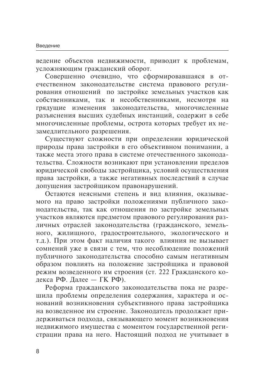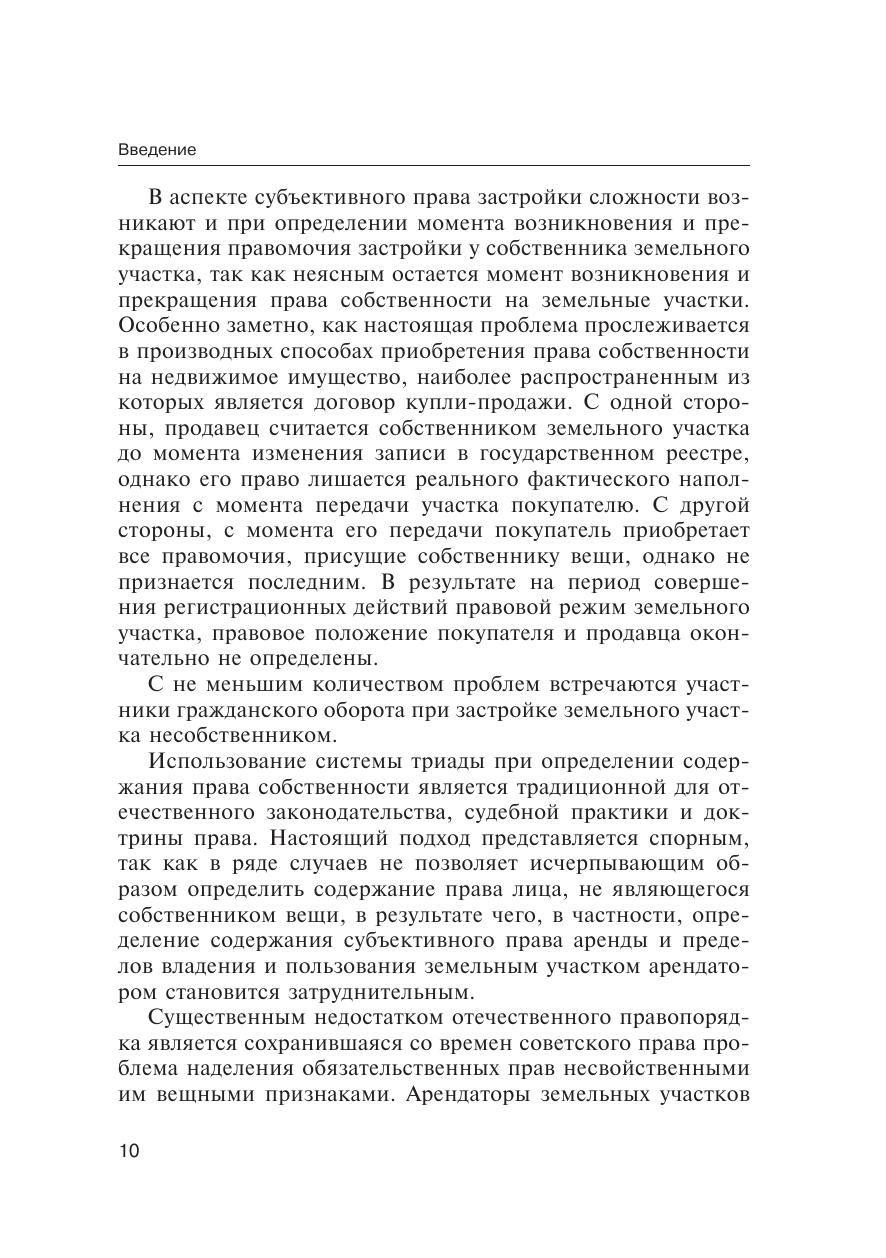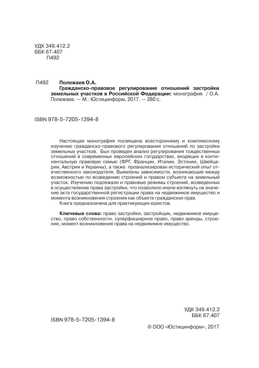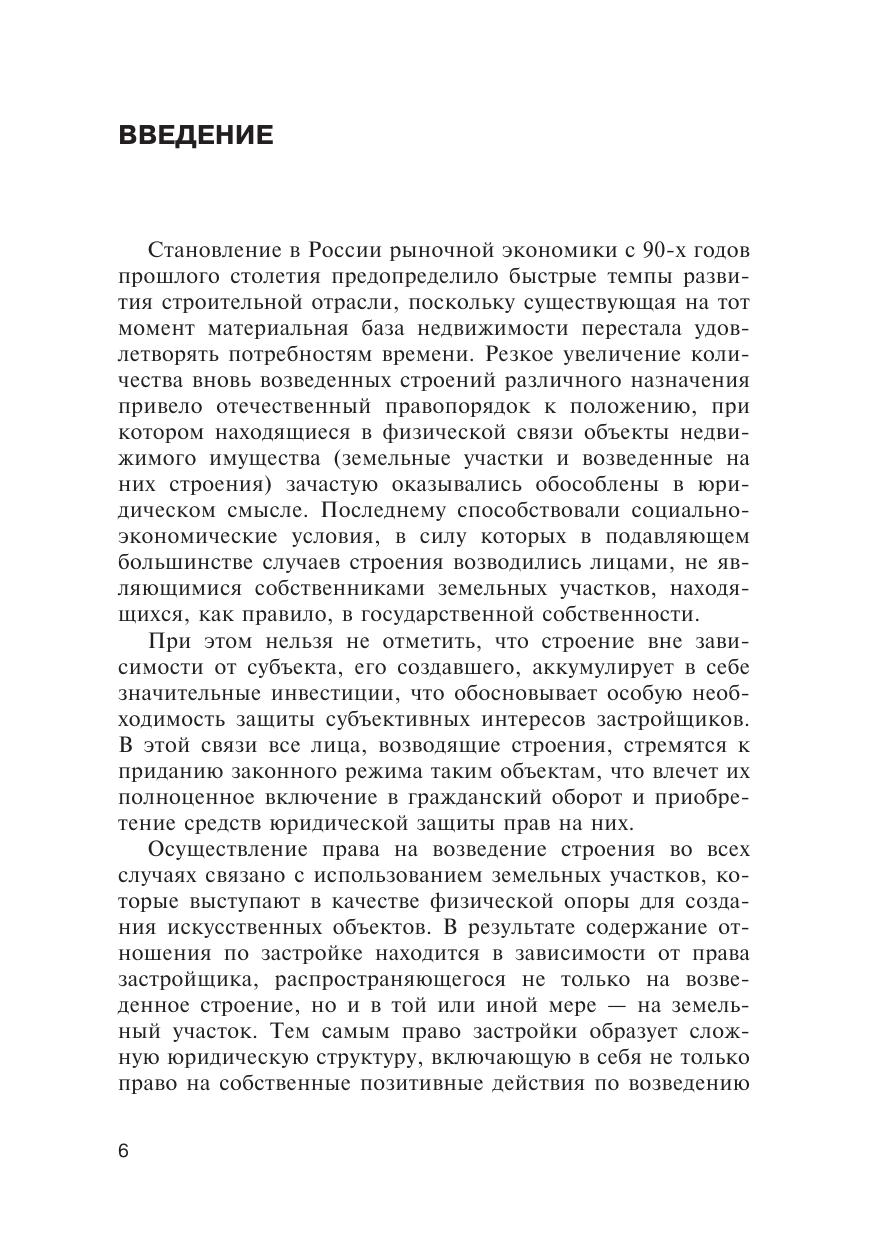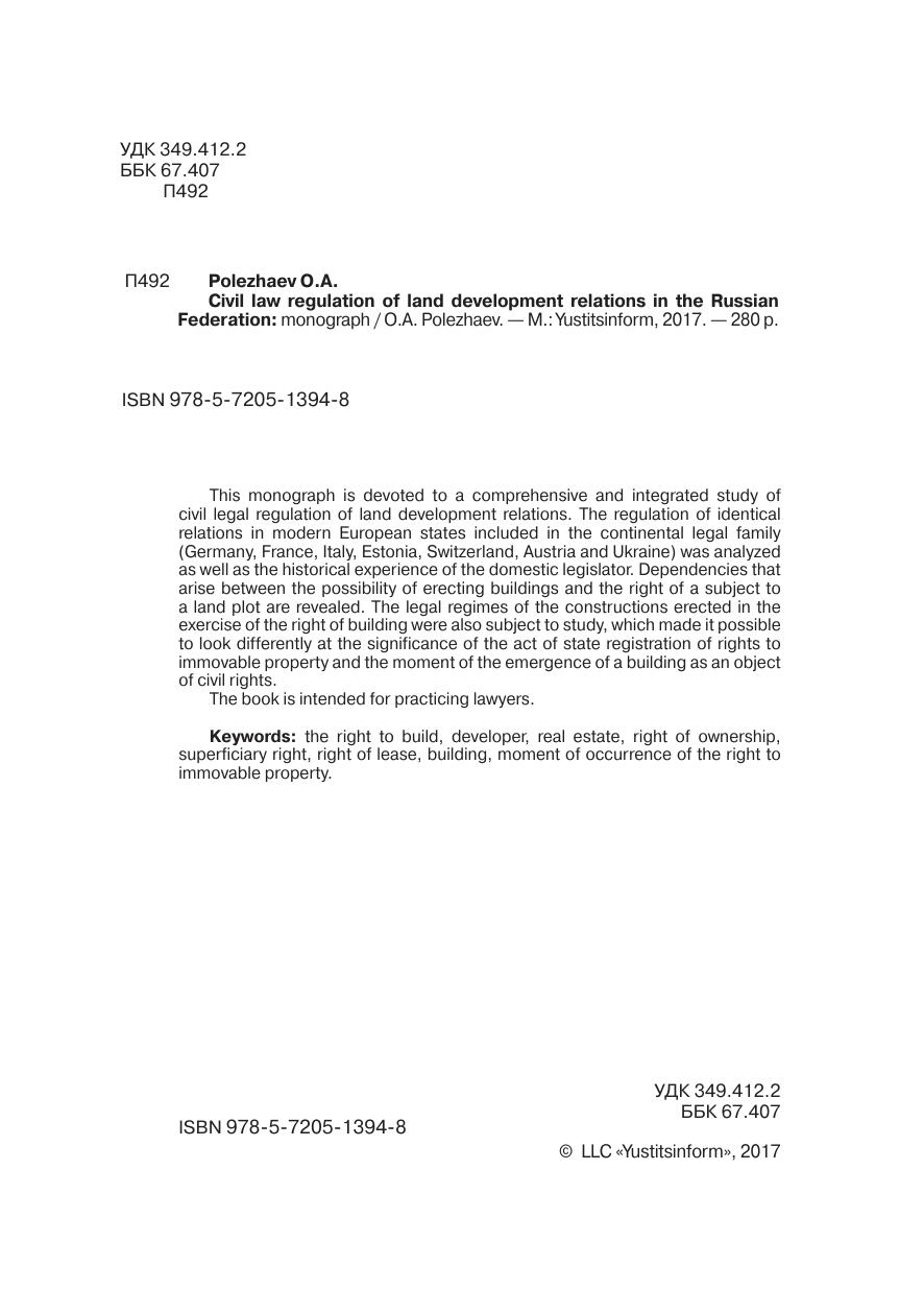 Настоящая монография посвящена всестороннему и комплексному изучению гражданско-правового регулирования отношений по застройке земельных участков. Был проведен анализ регулирования тождественных отношений в современных европейских государствах, входящих в континентальную правовую семью (ФРГ, Франции, Италии, Эстонии, Швейцарии, Австрии и Украины), а также проанализирован исторический опыт отечественного законодателя. Выявлены зависимости, возникающие между возможностью по возведению строений и правом субъекта на земельный участок. Изучению подлежали и правовые режимы строений, возведенных в осуществление права застройки, что позволило иначе взглянуть на значение акта государственной регистрации права на недвижимое имущество и момента возникновения строения как объекта гражданских прав.