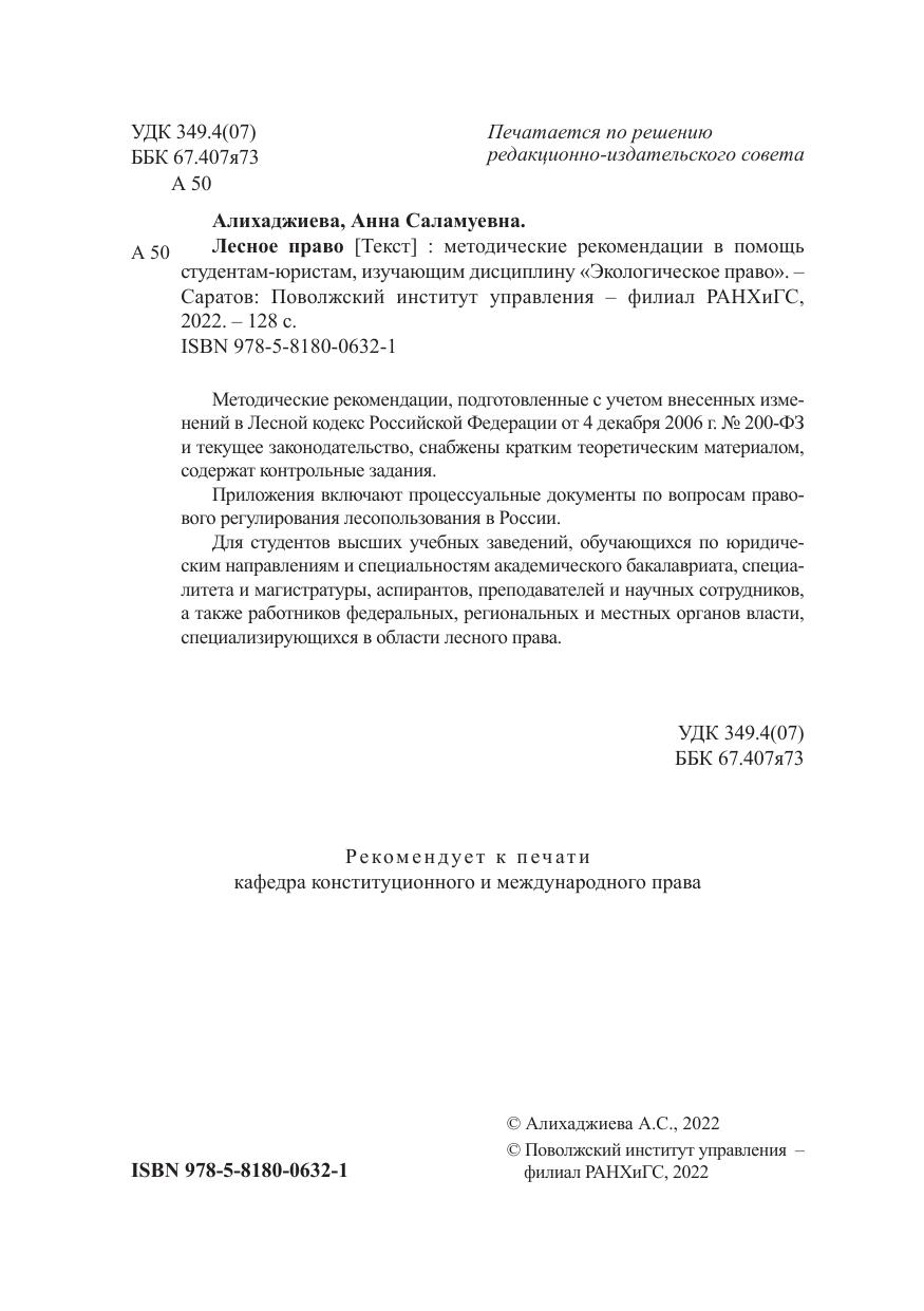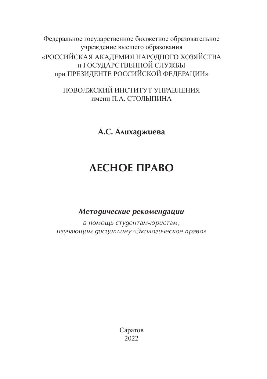 Методические рекомендации, подготовленные с учетом внесенных изменений в Лесной кодекс Российской Федерации от 4 декабря 2006 г. № 200-ФЗ и текущее законодательство, снабжены кратким теоретическим материалом, содержат контрольные задания. Приложения включают процессуальные документы по вопросам правового регулирования лесопользования в России. Для студентов высших учебных заведений, обучающихся по юридическим направлениям и специальностям академического бакалавриата, cпециалитета и магистратуры, аспирантов, преподавателей и научных сотрудников, а также работников федеральных, региональных и местных органов власти, специализирующихся в области лесного права.