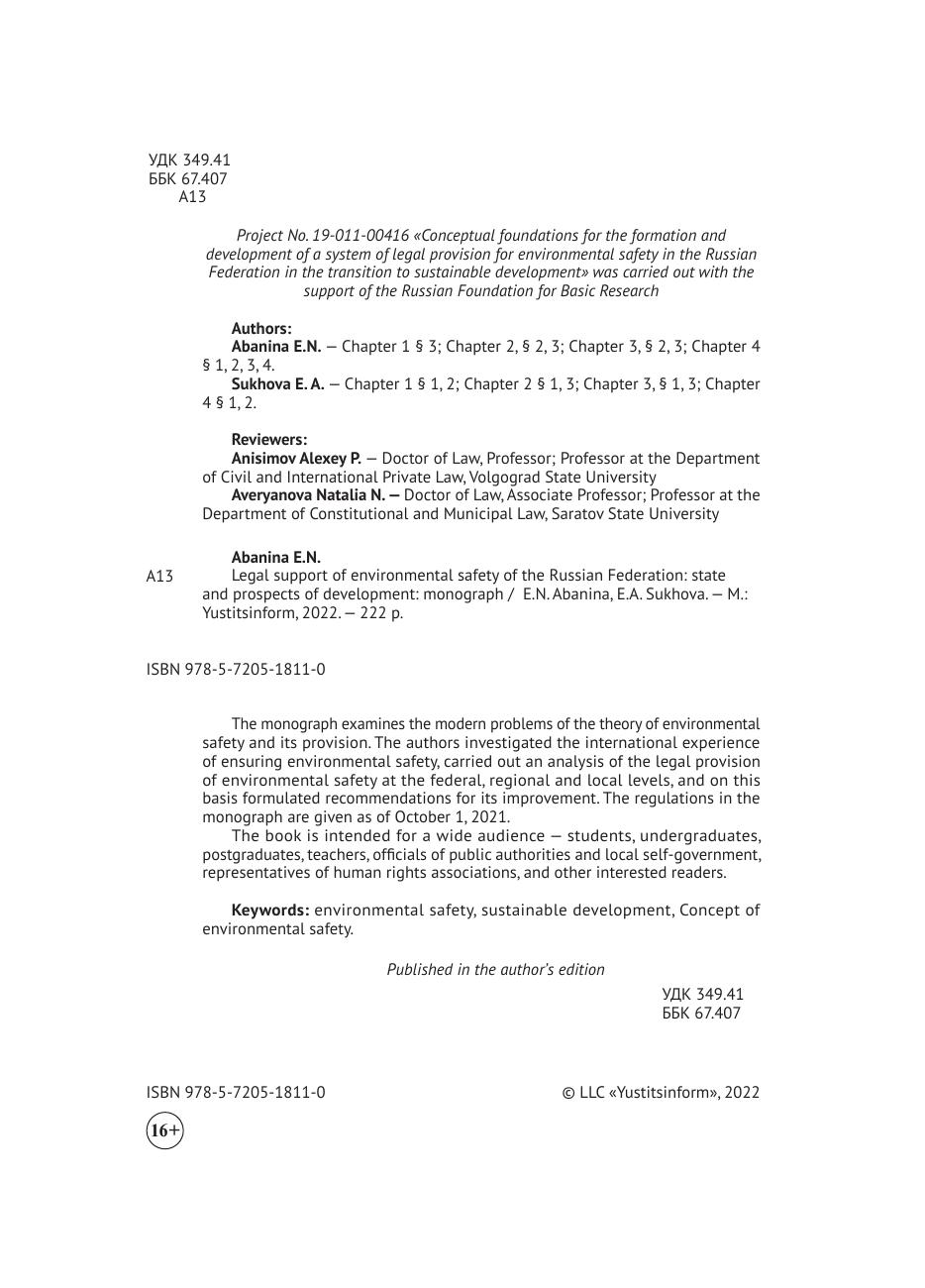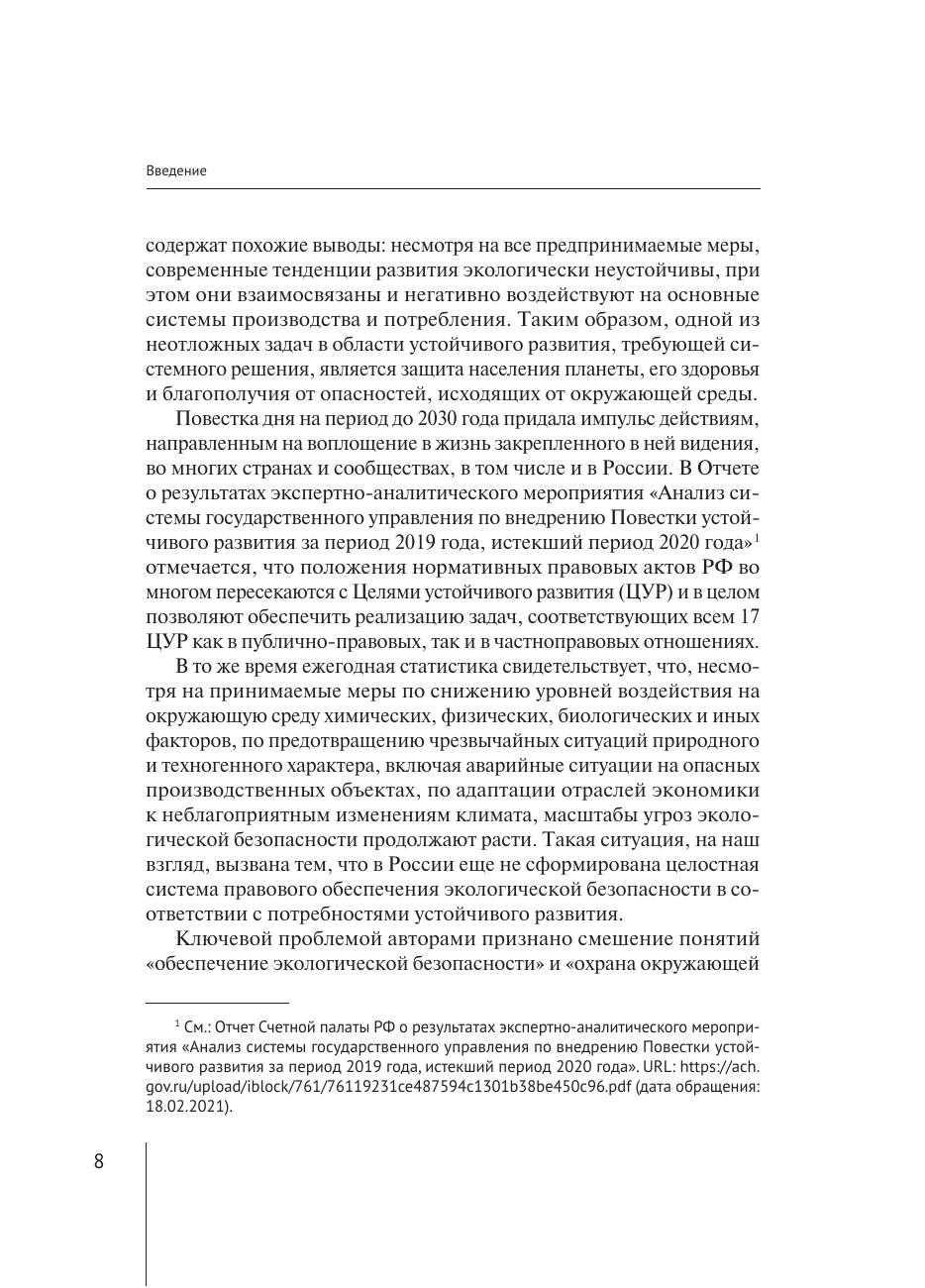 В монографии рассматриваются современные проблемы теории экологической безопасности и ее обеспечения. Авторами исследован международный опыт обеспечения экологической безопасности, осуществлен анализ правового обеспечения экологической безопасности на федеральном, региональном и местном уровнях, и на этой основе сформулированы рекомендации по его совершенствованию. Нормативные акты в монографии приведены по состоянию на 1 октября 2021 г.