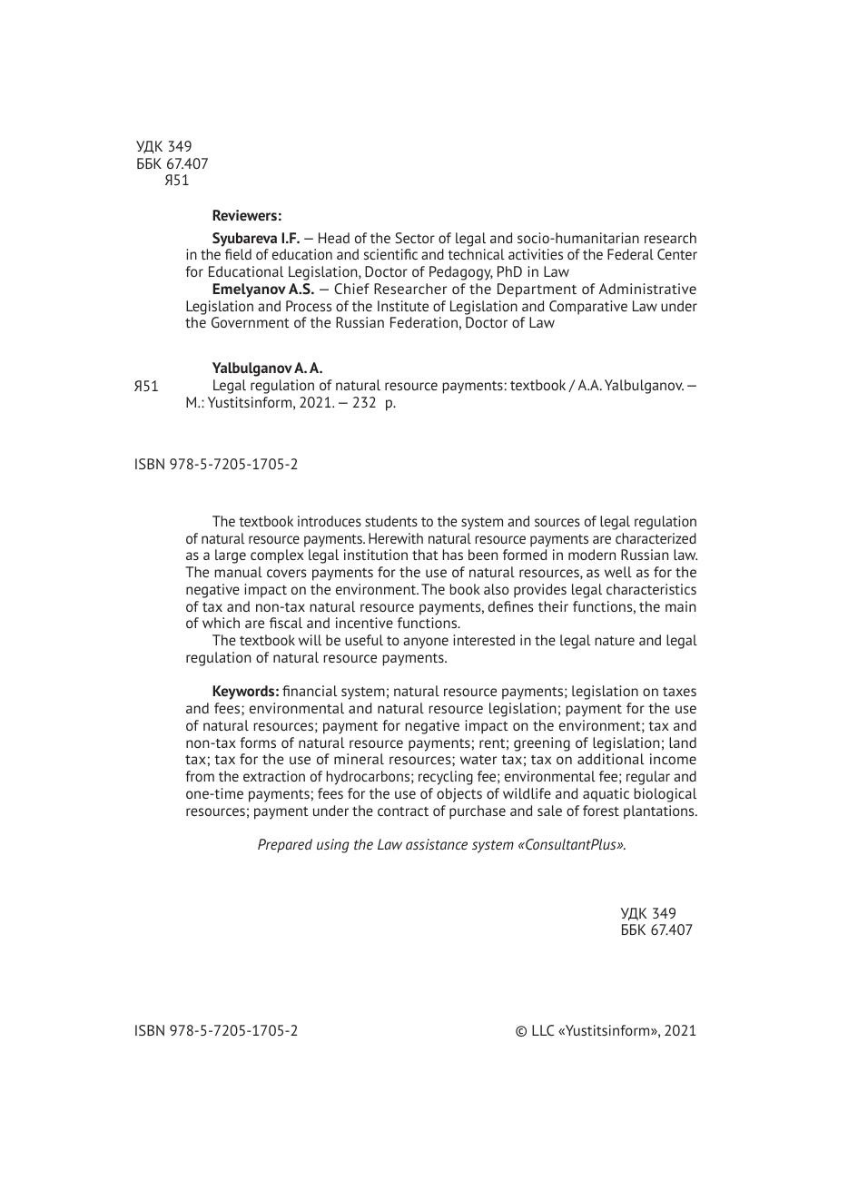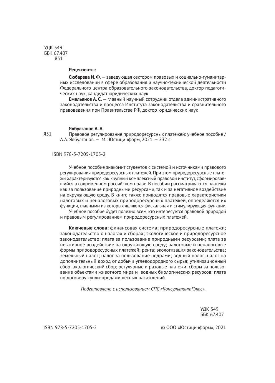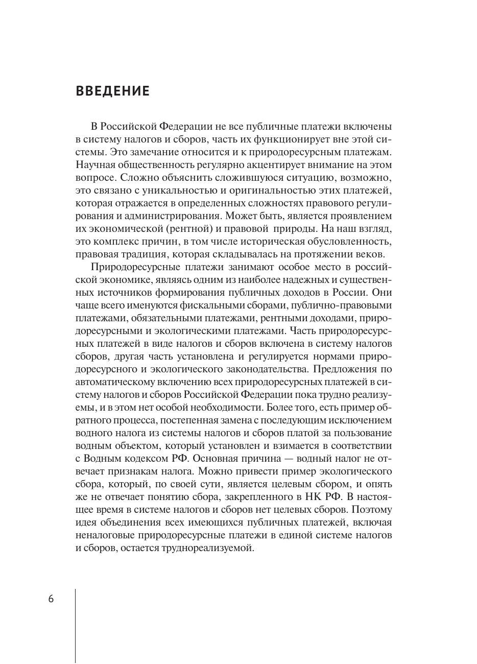 Учебное пособие знакомит студентов с системой и источниками правового регулирования природоресурсных платежей. При этом природоресурсные платежи характеризуются как крупный комплексный правовой институт, сформировавшийся в современном российском праве. В пособии рассматриваются платежи как за пользование природными ресурсами, так и за негативное воздействие на окружающую среду. В книге также приводятся правовые характеристики налоговых и неналоговых природоресурсных платежей, определяются их функции, главными из которых являются фискальная и стимулирующая функции. Учебное пособие будет полезно всем, кто интересуется правовой природой и правовым регулированием природоресурсных платежей.