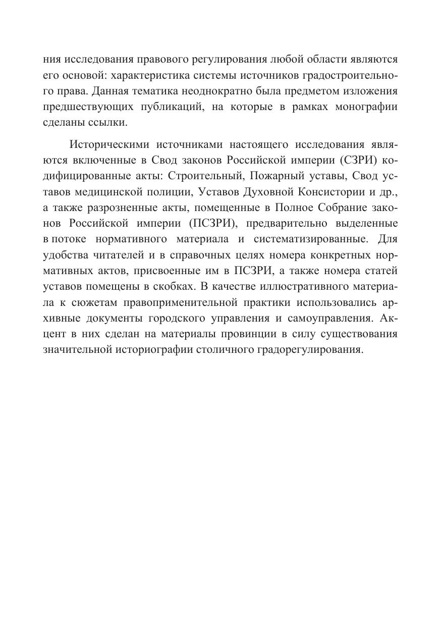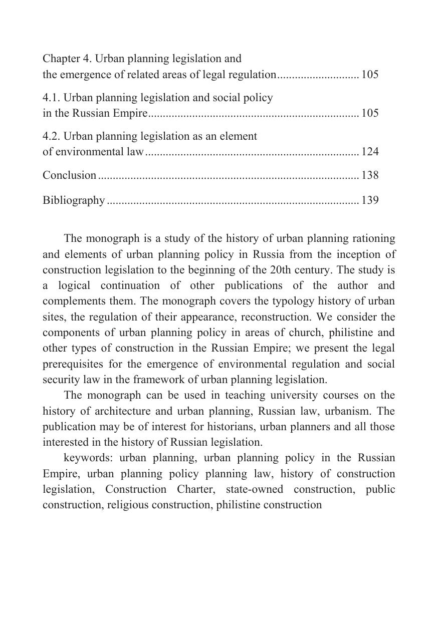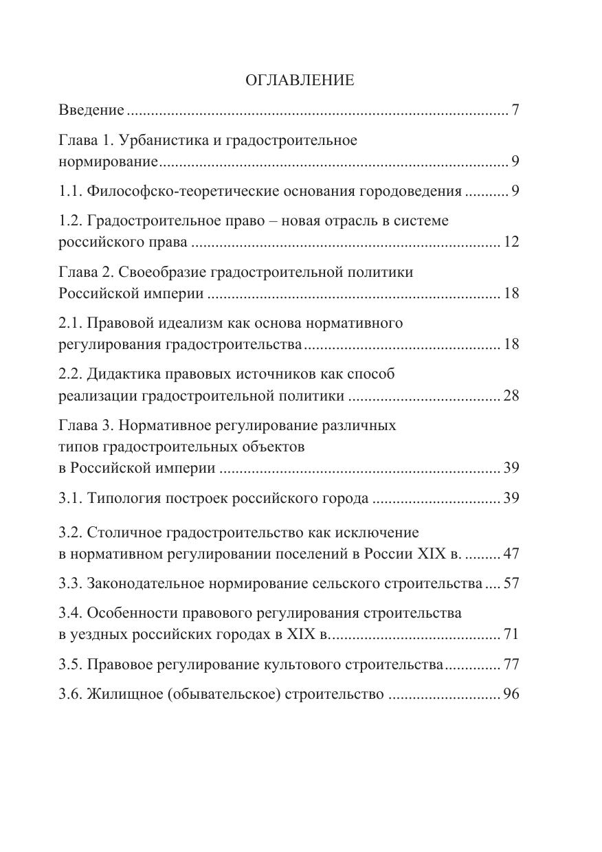 Монография представляет собой исследование истории градостроительного нормирования и элементов градостроительной политики в России с момента зарождения строительного законодательства до начала XX в. Исследование является логическим продолжением других публикаций автора и дополняет их. Монография охватывает историю складывания типологии градостроительных объектов, регулирования их появления, реконструкции. Рассматриваются составляющие градостроительной политики по направлениям церковного, обывательского и др. видов строительства в Российской империи, представлены правовые предпосылки появления экологического нормирования и права социального обеспечения в рамках градостроительного законодательства.