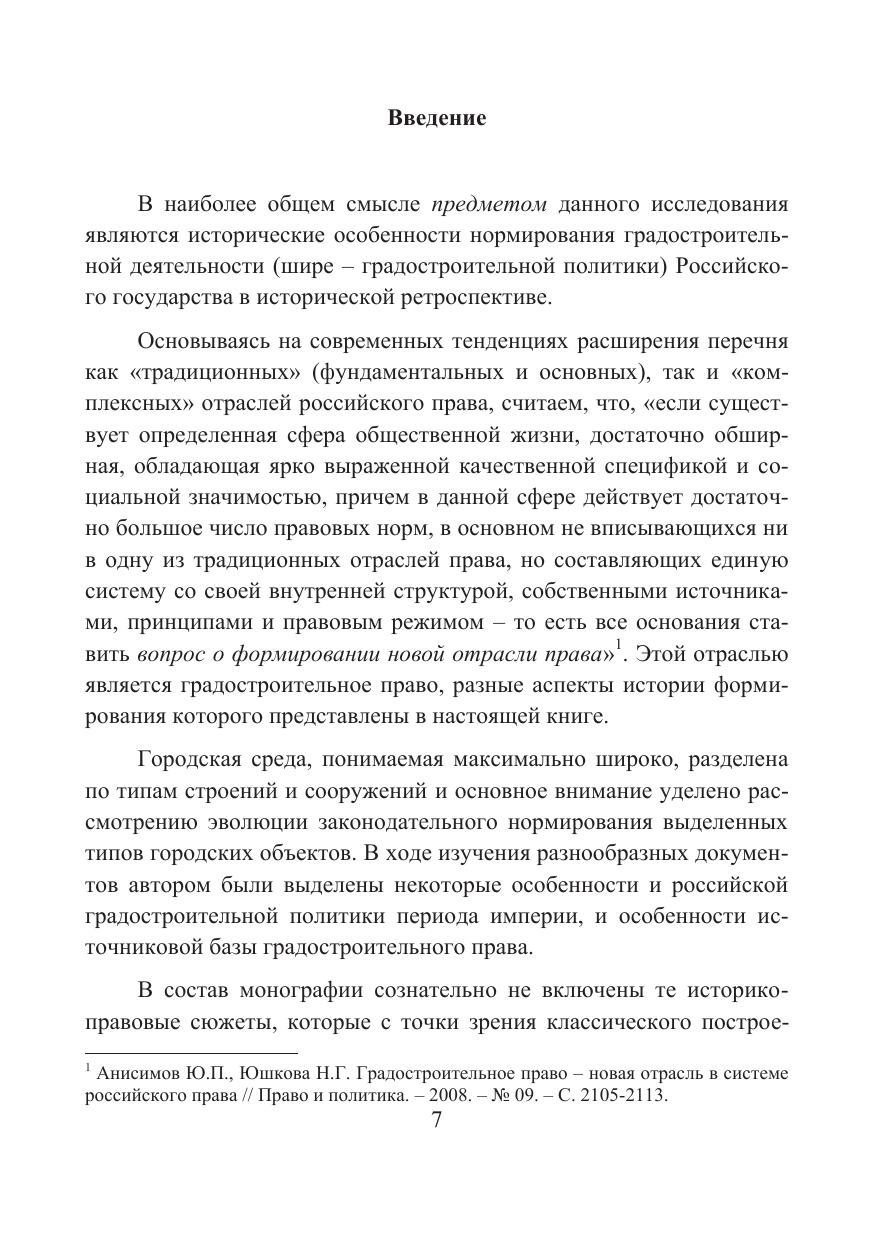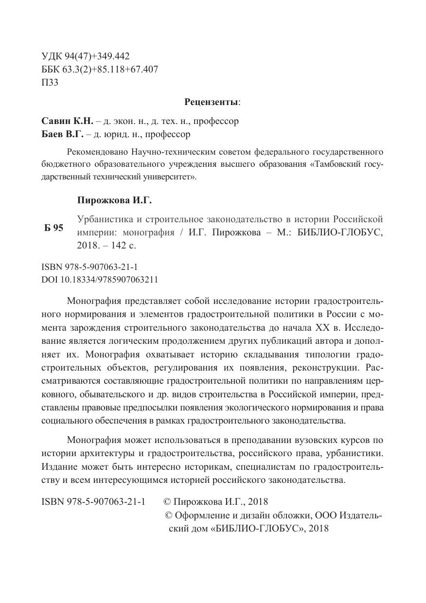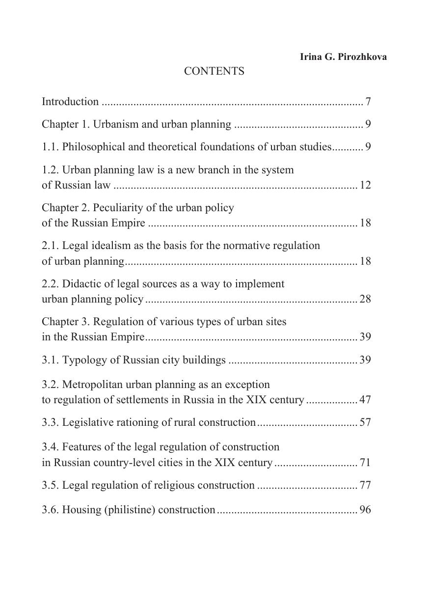 Монография представляет собой исследование истории градостроительного нормирования и элементов градостроительной политики в России с момента зарождения строительного законодательства до начала XX в. Исследование является логическим продолжением других публикаций автора и дополняет их. Монография охватывает историю складывания типологии градостроительных объектов, регулирования их появления, реконструкции. Рассматриваются составляющие градостроительной политики по направлениям церковного, обывательского и др. видов строительства в Российской империи, представлены правовые предпосылки появления экологического нормирования и права социального обеспечения в рамках градостроительного законодательства.