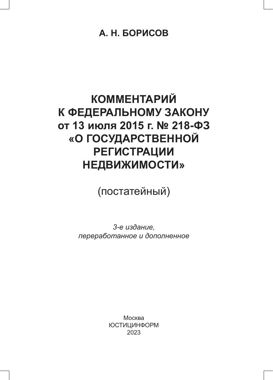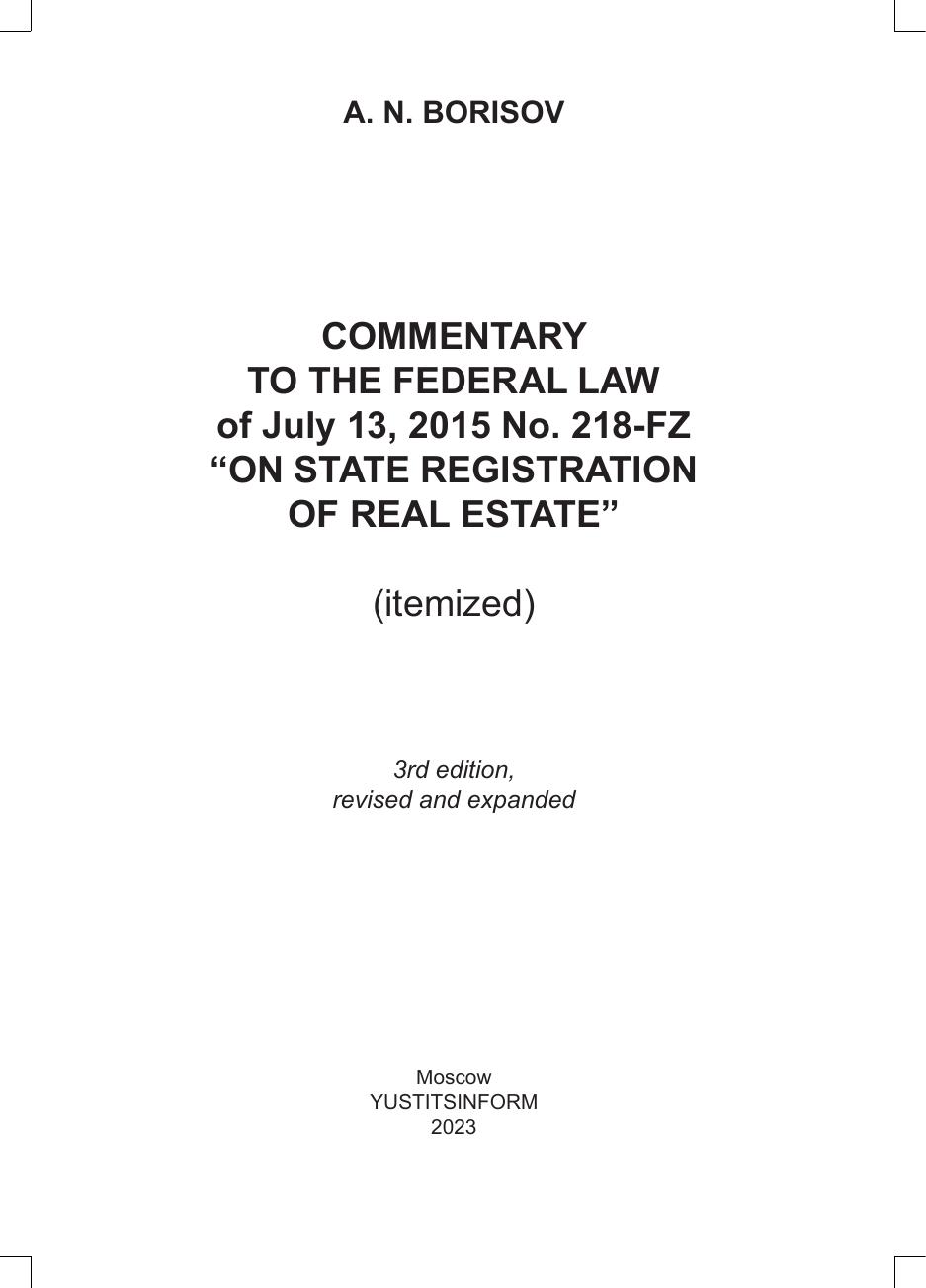 В третьем издании книги дан постатейный комментарий к Федеральному закону от 13 июля 2015 г. № 218‑ФЗ «О государственной регистрации недвижимости» в редакции внесенных в него изменений, в т.ч. Федеральным законом от 20 октября 2022 г. №
