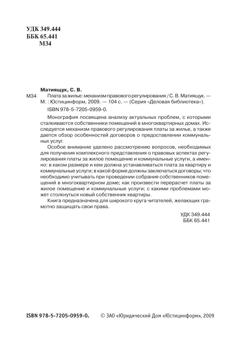 Монография посвящена анализу актуальных проблем, с которыми сталкиваются собственники помещений в многоквартирных домах. Исследуется механизм правового регулирования платы за жилье, а также дается обзор особенностей договоров о предоставлении коммунальных услуг. Особое внимание уделено рассмотрению вопросов, необходимых для получения комплексного представления о правовых аспектах регулирования платы за жилое помещение и коммунальные услуги, а именно: в каком размере и кем должна устанавливаться плата за квартиру и коммунальные услуги в какой форме должны заключаться договоры чтонеобходимо учитывать при проведении собрания собственников помещений в многоквартирном доме как произвести перерасчет платы за жилое помещение и коммунальные услуги с какими проблемами может столкнуться новый собственник квартиры. Книга предназначена для широкого круга читателей, желающих грамотно защищать свои права.