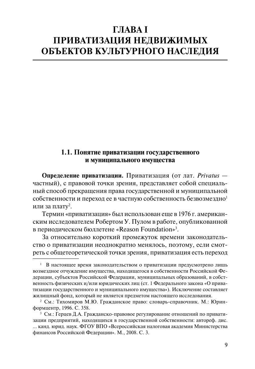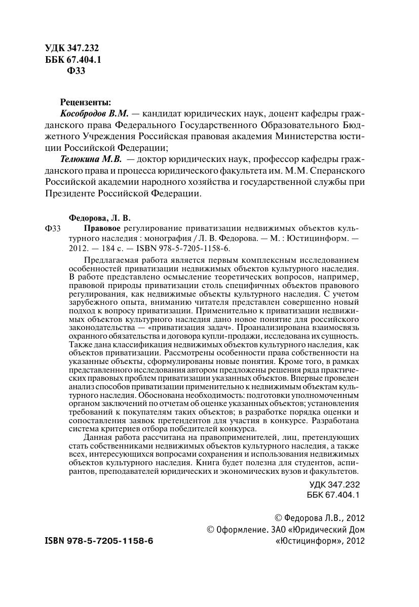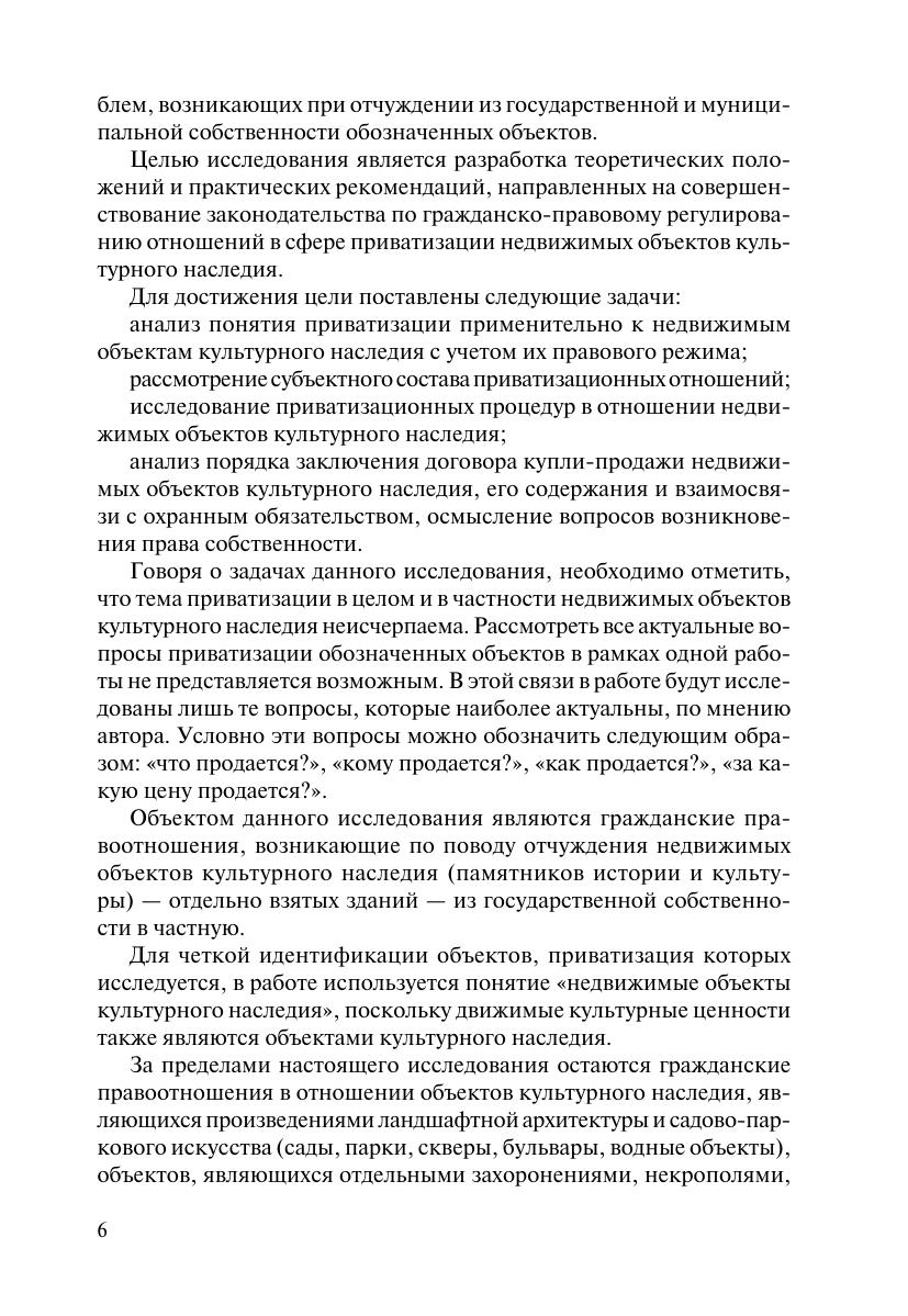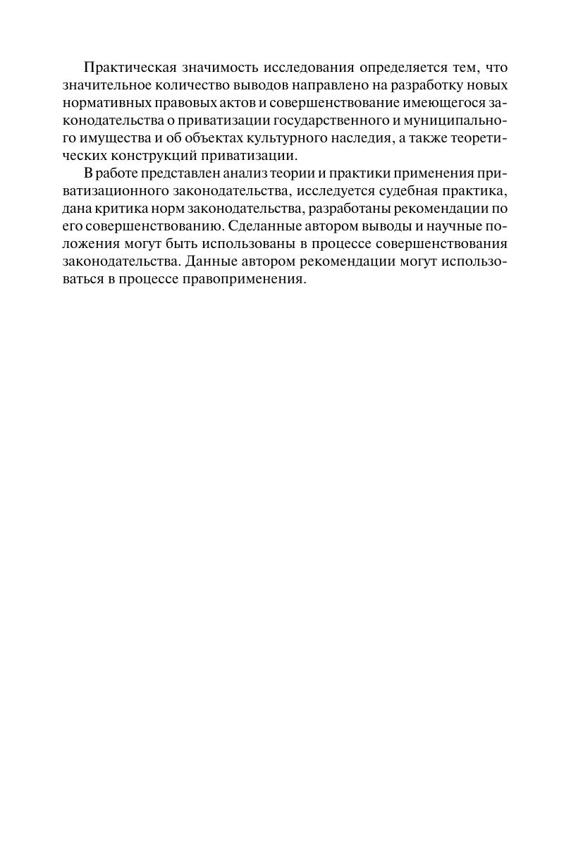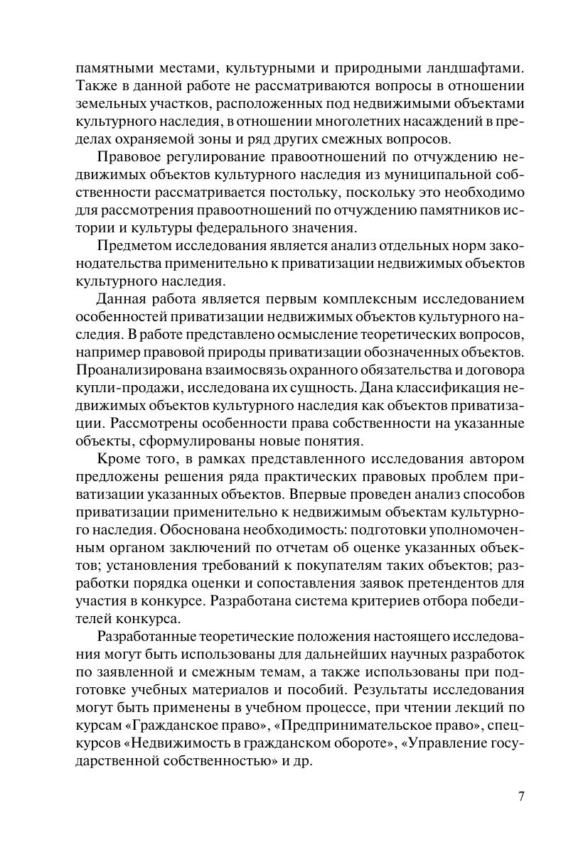 Предлагаемая работа является первым комплексным исследованием особенностей приватизации недвижимых объектов культурного наследия. В работе представлено осмысление теоретических вопросов, например, правовой природы приватизации столь специфичных объектов правового регулирования, как недвижимые объекты культурного наследия. С учетом зарубежного опыта, вниманию читателя представлен совершенно новый подход к вопросу приватизации. Применительно к приватизации недвижимых объектов культурного наследия дано новое понятие для российского законодательства — «приватизация задач». Проанализирована взаимосвязь охранного обязательства и договора купли-продажи, исследована их сущность. Также дана классификация недвижимых объектов культурного наследия, как объектов приватизации. Рассмотрены особенности права собственности на указанные объекты, сформулированы новые понятия. Кроме того, в рамках представленного исследования автором предложены решения ряда практических правовых проблем приватизации указанных объектов. Впервые проведен анализ способов приватизации применительно к недвижимым объектам культурного наследия. Обоснована необходимость: подготовки уполномоченным органом заключений по отчетам об оценке указанных объектов установления требований к покупателям таких объектов в разработке порядка оценки и сопоставления заявок претендентов для участия в конкурсе. Разработана система критериев отбора победителей конкурса.Данная работа рассчитана на правоприменителей, лиц, претендующих стать собственниками недвижимых объектов культурного наследия, а также всех, интересующихся вопросами сохранения и использования недвижимых объектов культурного наследия. Книга будет полезна для студентов, аспирантов, преподавателей юридических и экономических вузов и факультетов.