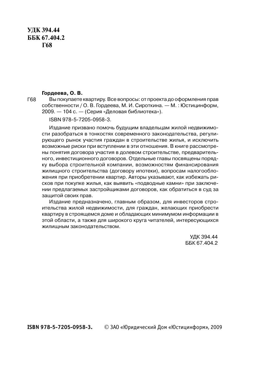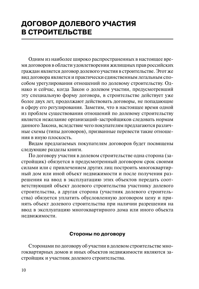 Издание призвано помочь будущим владельцам жилой недвижимости разобраться в тонкостях современного законодательства, регулирующего рынок участия граждан в строительстве жилья, и исключить возможные риски при вступлении в эти отношения. В книге рассмотрены понятия договора участия в долевом строительстве, предварительного, инвестиционного договоров. Отдельные главы посвящены порядку выбора строительной компании, возможностям финансирования жилищного строительства (договору ипотеки), вопросам налогообложения при приобретении квартир. Авторы указывают, как избежать рисков при покупке жилья, как выявить «подводные камни» при заключении предлагаемых застройщиками договоров, как обратиться в суд за защитой своих прав.
