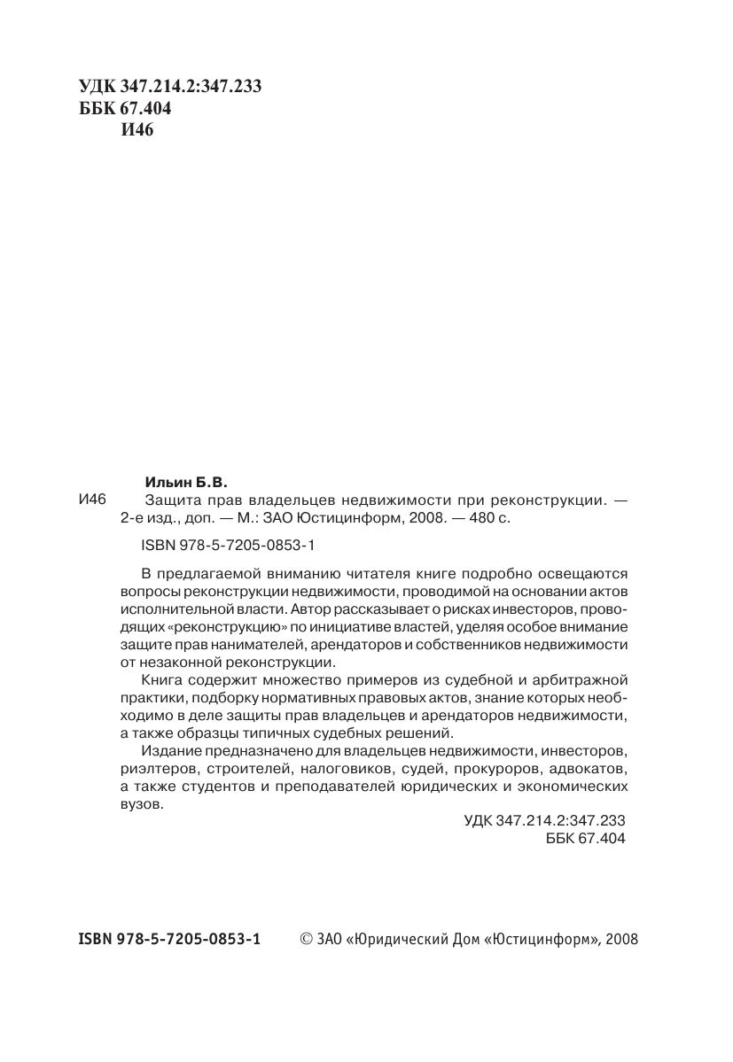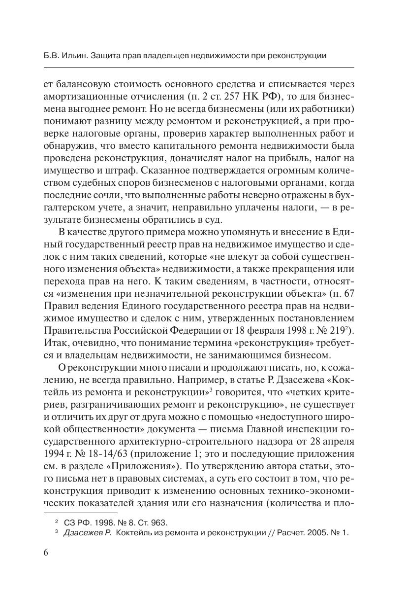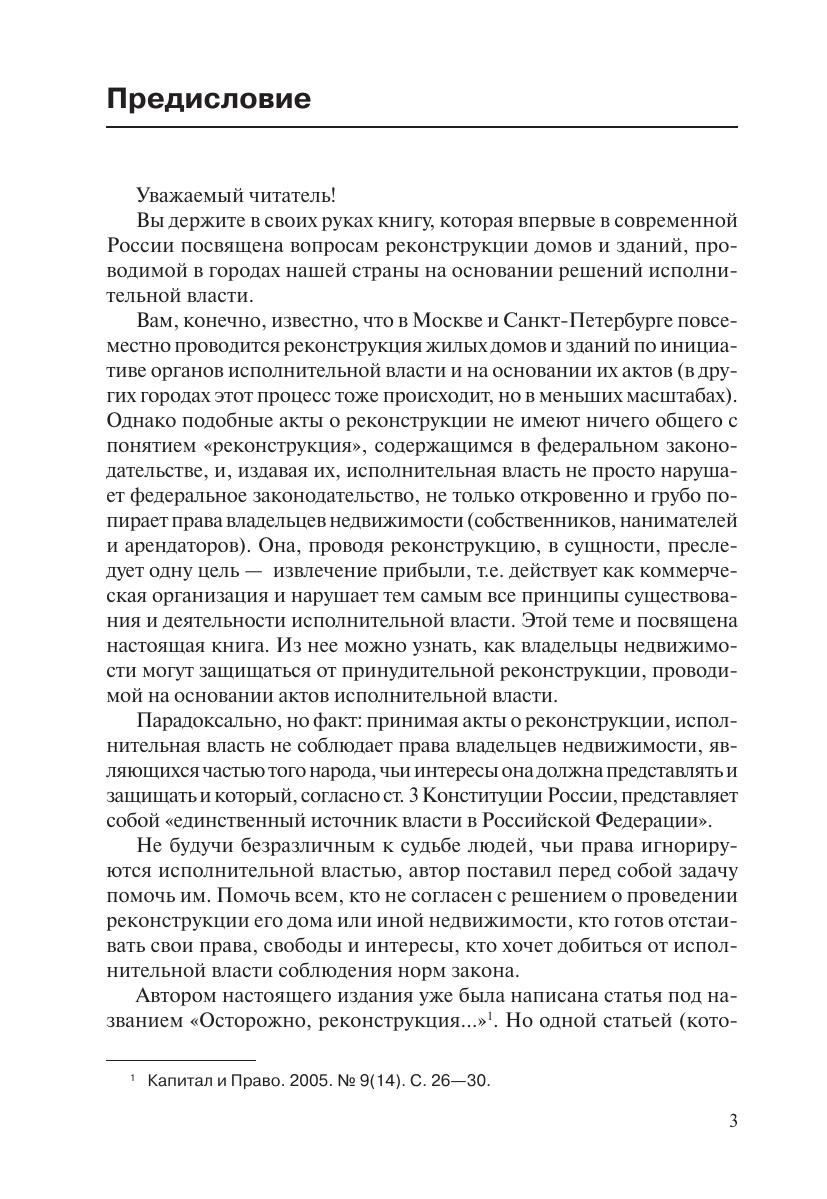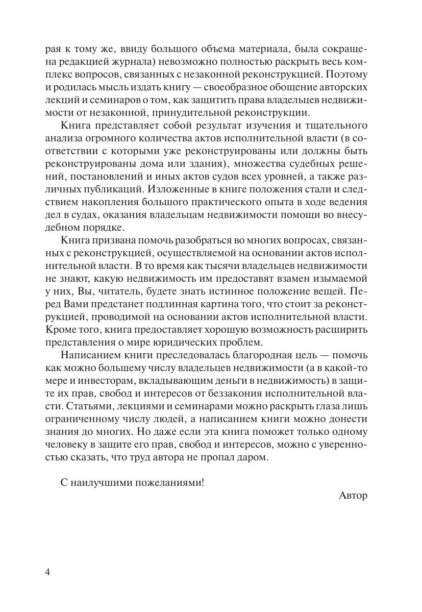 В предлагаемой вниманию читателя книге подробно освещаются вопросы реконструкции недвижимости, проводимой на основании актов исполнительной власти. Автор рассказывает о рисках инвесторов, проводящих «реконструкцию» по инициативе властей, уделяя особое внимание защите прав нанимателей, арендаторов и собственников недвижимости от незаконной реконструкции. Книга содержит множество примеров из судебной и арбитражной практики, подборку нормативных правовых актов, знание которых необходимо в деле защиты прав владельцев и арендаторов недвижимости, а также образцы типичных судебных решений. Издание предназначено для владельцев недвижимости, инвесторов, риэлтеров, строителей, налоговиков, судей, прокуроров, адвокатов, а также студентов и преподавателей юридических и экономических вузов.