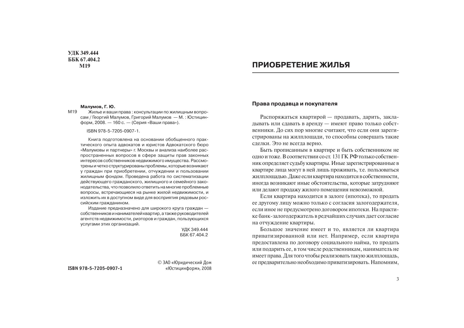 Книга подготовлена на основании обобщенного практического опыта адвокатов и юристов Адвокатского бюро «Малумовы и партнеры» г. Москвы и анализа наиболее распространенных вопросов в сфере защиты прав законных интересов собственников недвижимого имущества. Рассмотрены и четко структурированы проблемы, которые возникают у граждан при приобретении, отчуждении и пользовании жилищным фондом. Проведена работа по систематизации действующего гражданского, жилищного и семейного законодательства, что позволило ответить на многие проблемные вопросы, встречающиеся на рынке жилой недвижимости, и изложить их в доступном виде для восприятия рядовым российским гражданином.Издание предназначено для широкого круга граждан — собственников и нанимателей квартир, а также руководителей агентств недвижимости, риэторов и граждан, пользующихсяуслугами этих организаций.
