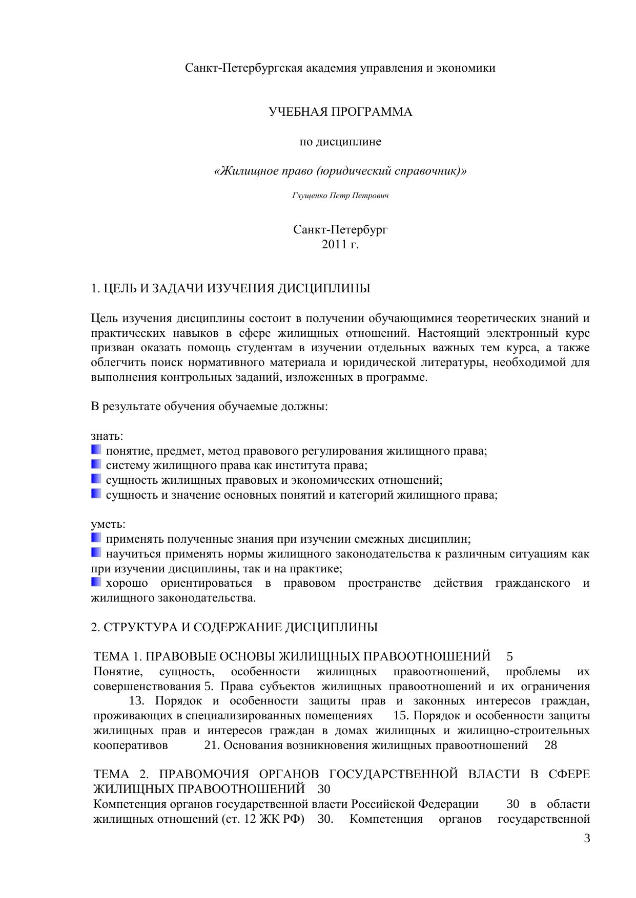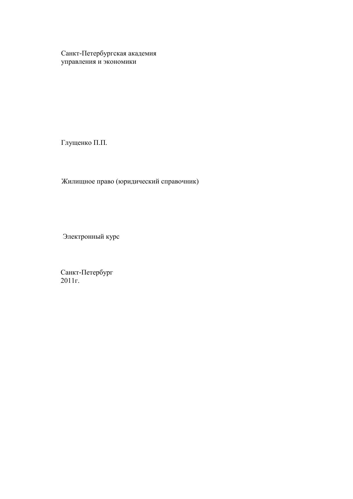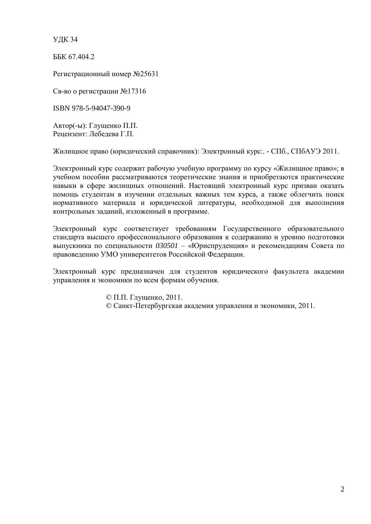 Электронный курс содержит рабочую учебную программу по курсу «Жилищное право» в учебном пособии рассматриваются теоретические знания и приобретаются практические навыки в сфере жилищных отношений. Настоящий электронный курс призван оказать помощь студентам в изучении отдельных важных тем курса, а также облегчить поиск нормативного материала и юридической литературы, необходимой для выполнения контрольных заданий, изложенный в программе. Электронный курс соответствует требованиям Государственного образовательного стандарта высшего профессионального образования к содержанию и уровню подготовки выпускника по специальности 030501 – «Юриспруденция» и рекомендациям Совета по правоведению УМО университетов Российской Федерации. Электронный курс предназначен для студентов юридического факультета академии управления и экономики по всем формам обучения.