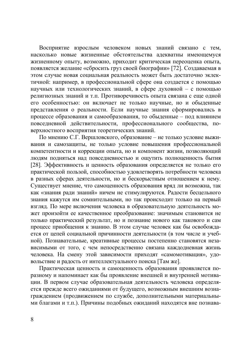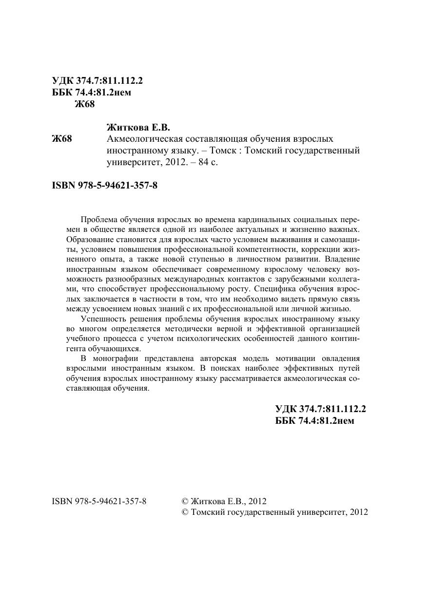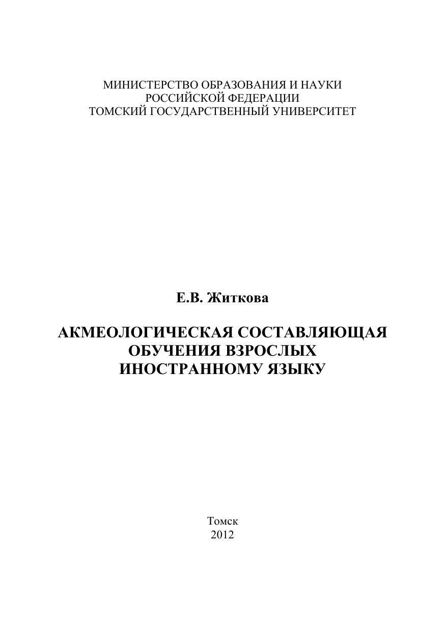 Проблема обучения взрослых во времена кардинальных социальных перемен в обществе является одной из наиболее актуальных и жизненно важных. Образование становится для взрослых часто условием выживания и самозащиты, условием повышения профессиональной компетентности, коррекции жизненного опыта, а также новой ступенью в личностном развитии. Владение иностранным языком обеспечивает современному взрослому человеку возможность разнообразных международных контактов с зарубежными коллегами, что способствует профессиональному росту. Специфика обучения взрослых заключается в частности в том, что им необходимо видеть прямую связь между усвоением новых знаний с их профессиональной или личной жизнью. Успешность решения проблемы обучения взрослых иностранному языку во многом определяется методически верной и эффективной организацией учебного процесса с учетом психологических особенностей данного контингента обучающихся. В монографии представлена авторская модель мотивации овладения взрослыми иностранным языком. В поисках наиболее эффективных путей обучения взрослых иностранному языку рассматривается акмеологическая составляющая обучения.