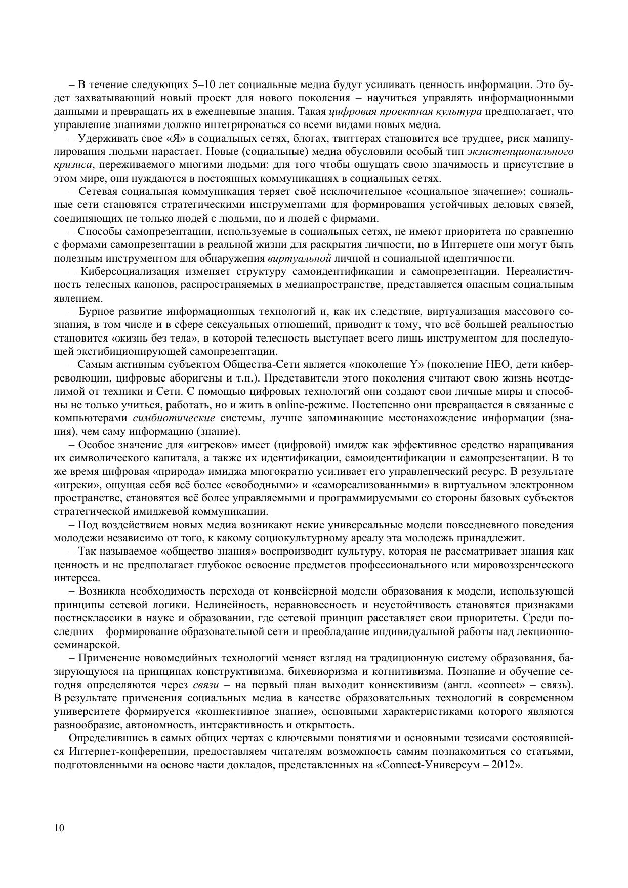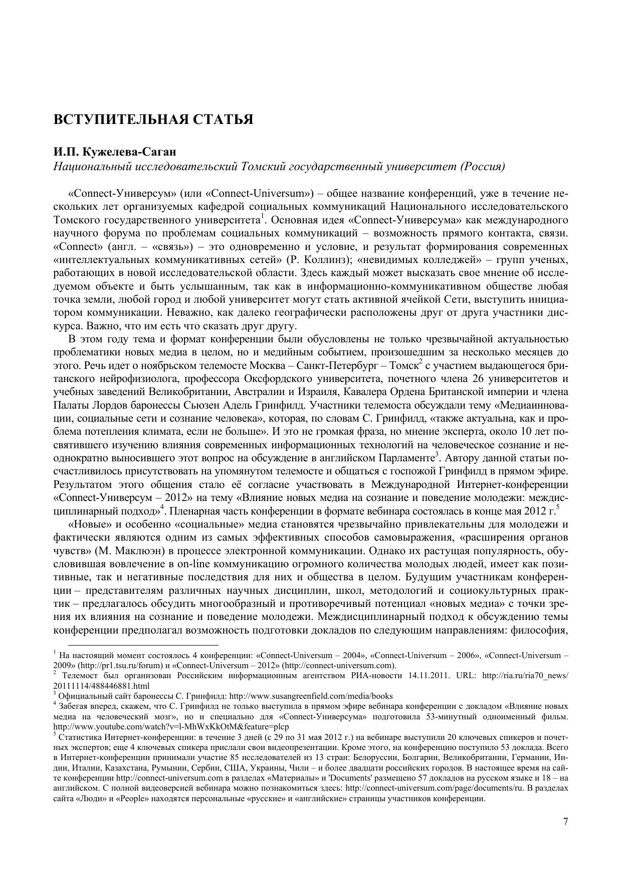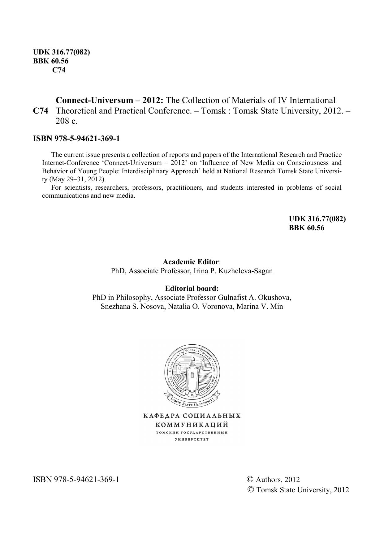 The current issue presents a collection of reports and papers of the International Research and Practice Internet-Conference ‘Connect-Universum – 2012’ on ‘Influence of New Media on Consciousness and Behavior of Young People: Interdisciplinary Approach’ held at National Research Tomsk State Universi-ty (May 29–31, 2012). For scientists, researchers, professors, practitioners, and students interested in problems of social communications and new media.