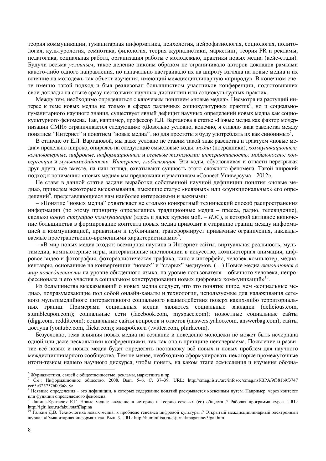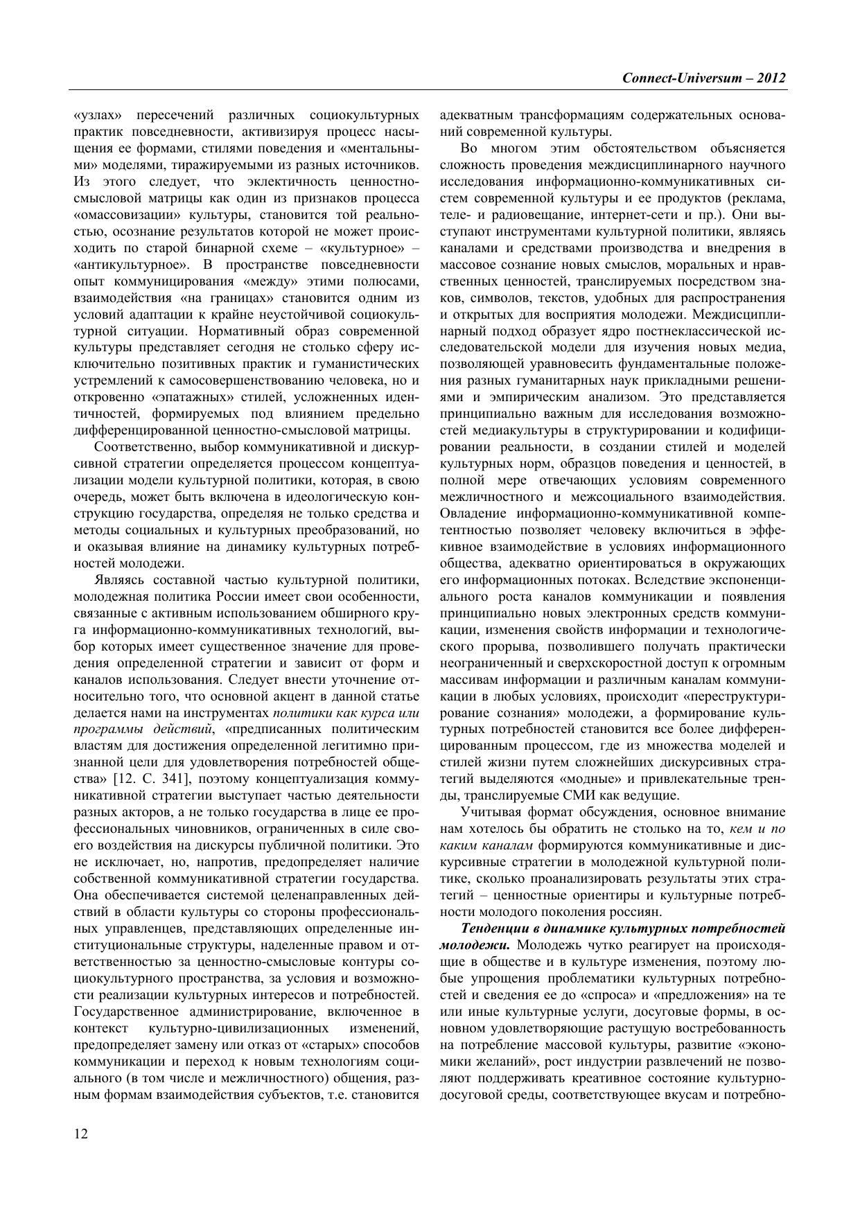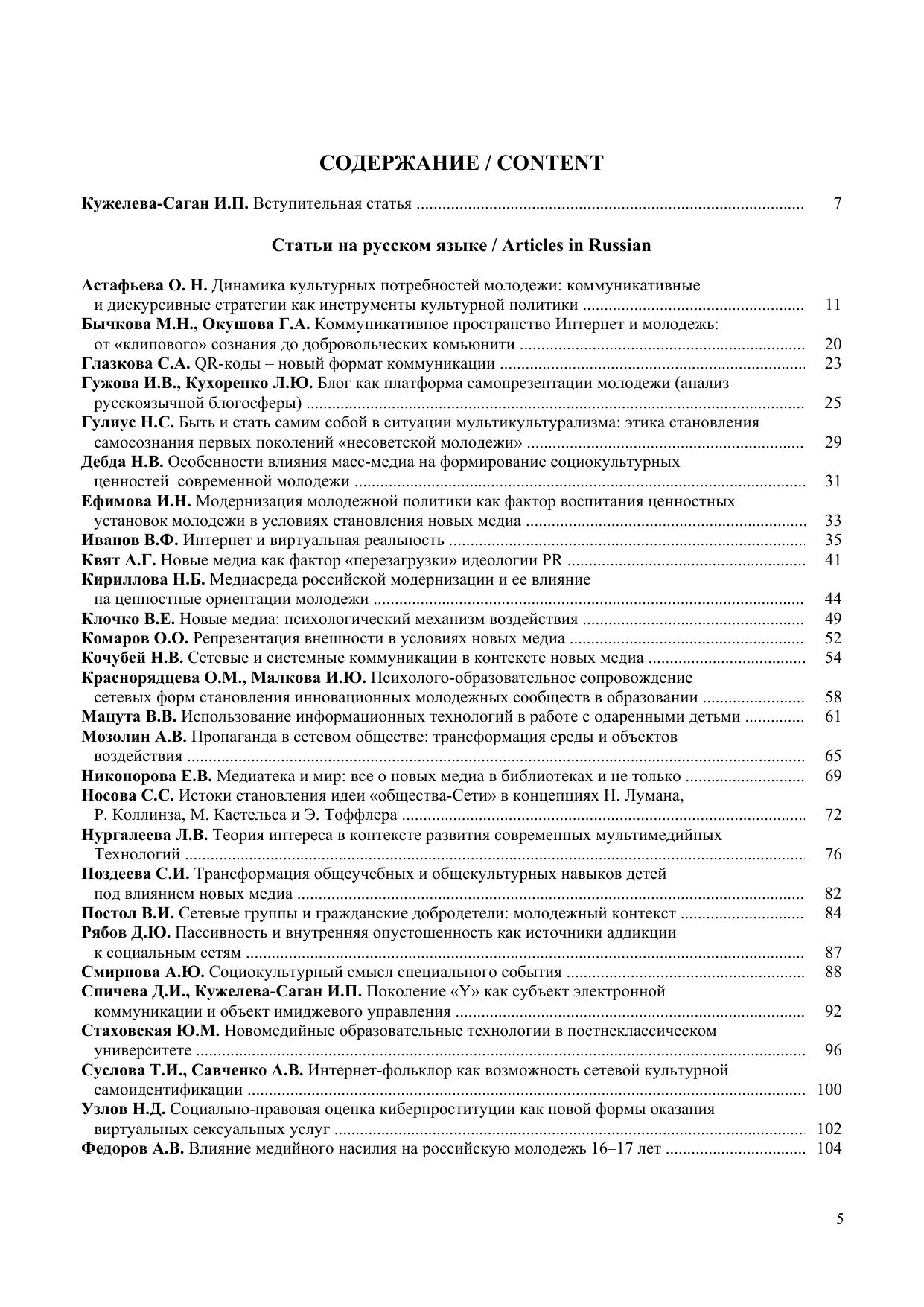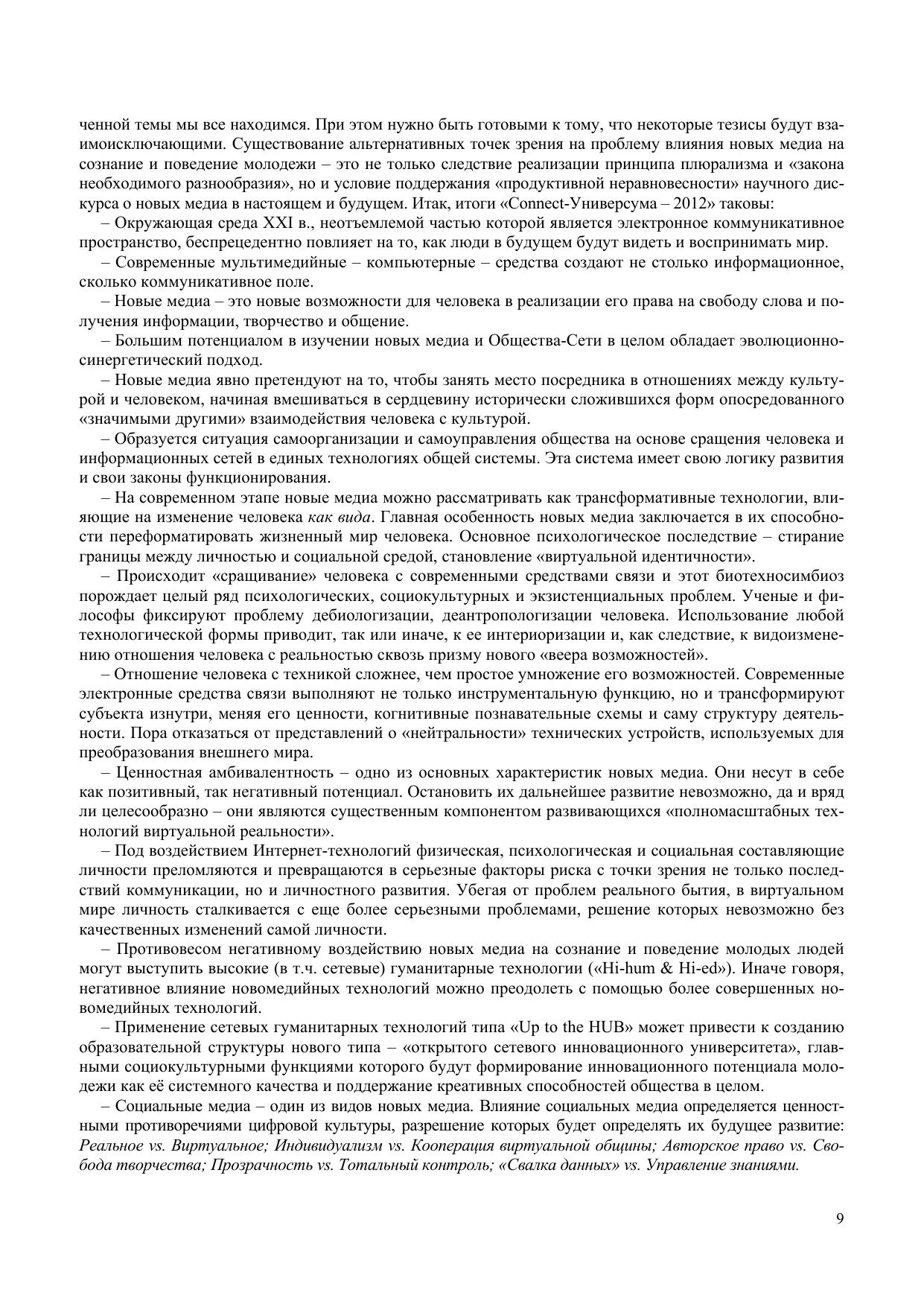 The current issue presents a collection of reports and papers of the International Research and Practice Internet-Conference ‘Connect-Universum – 2012’ on ‘Influence of New Media on Consciousness and Behavior of Young People: Interdisciplinary Approach’ held at National Research Tomsk State Universi-ty (May 29–31, 2012). For scientists, researchers, professors, practitioners, and students interested in problems of social communications and new media.