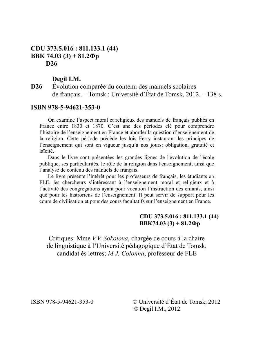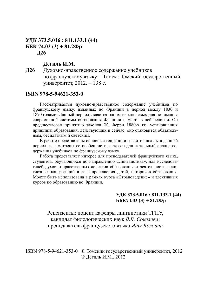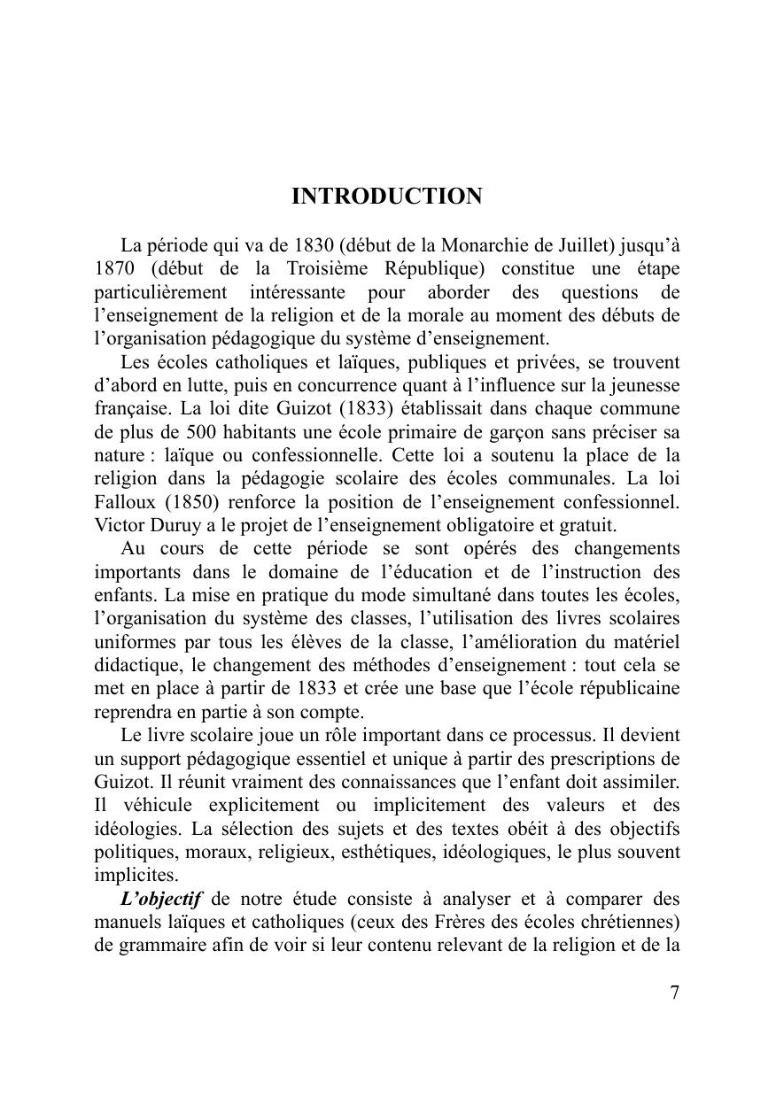 Рассматривается духовно-нравственное содержание учебников по французскому языку, изданных во Франции в период между 1830 и 1870 годами. Данный период является одним из ключевых для понимания современной системы образования Франции и места в ней религии. Он предшествовал принятию законов Ж. Ферри 1880-х гг., установивших принципы образования, действующих и сейчас: оно становится обязательным, бесплатным и светским. В работе представлены основные тенденции развития школы в данный период, рассмотрены ее особенности, а также дан детальный анализ содержания учебников по французскому языку. Работа представляет интерес для преподавателей французского языка, студентов, обучающихся по направлению «Лингвистика», для исследователей духовно-нравственных аспектов образования и деятельности религиозных конгрегаций в деле просещения детей, историков образования. Может быть использована в рамках курса «Страноведение» и элективных курсов по образованию во Франции.