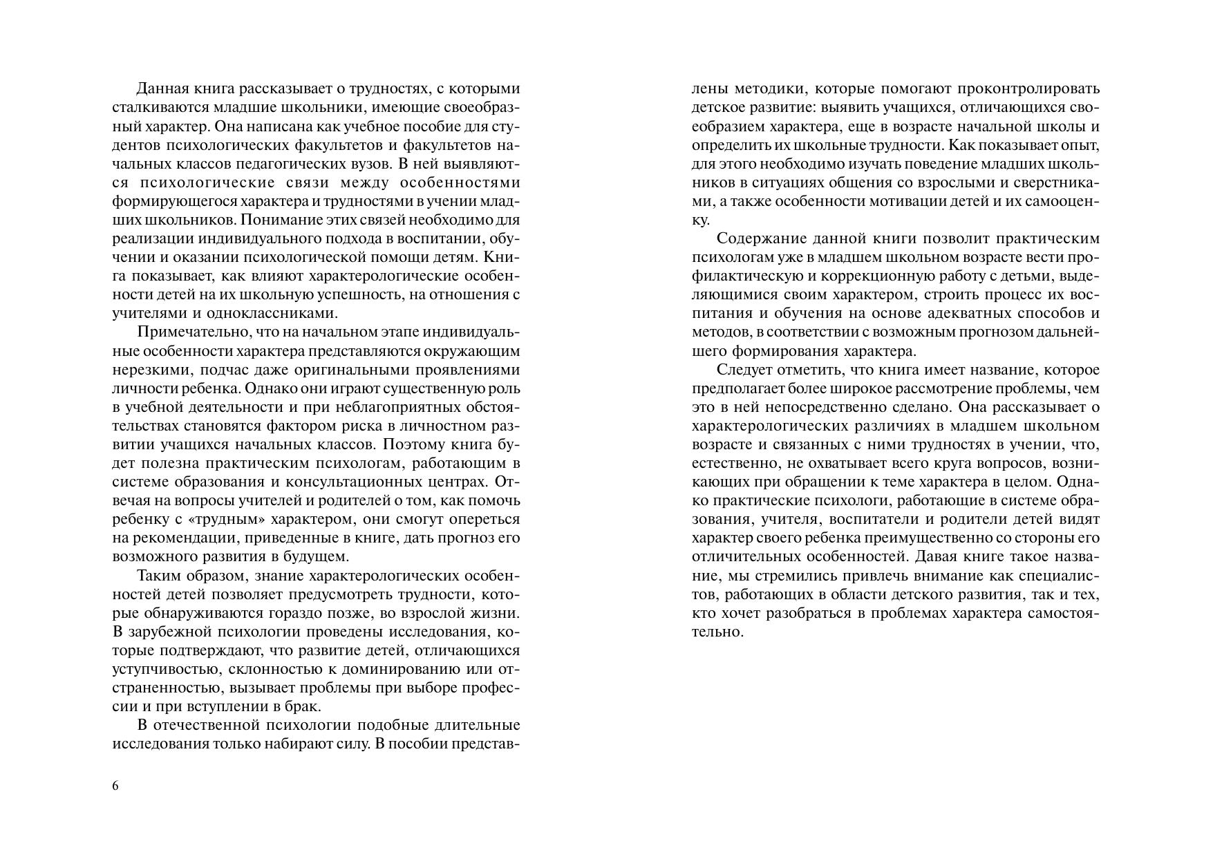 В книге рассказывается о проблемах младших школьников, отличающихся своеобразием характера. Автор анализирует современные подходы к изучению характера и возрастные особенности его формирования. Описаны три типа поведения младших школьников с различиями характера (уступчивый, доминирующий, отстраненный) и связанные с ними трудности в школе и дома. Приводятся методики, которые можно использовать в психолого0педагогической работе с младшими школьниками со своеобразием характера. Даются рекомендации их учителям и родителям, обеспечивающие индивидуальный подход к ребенку с «трудным характером».