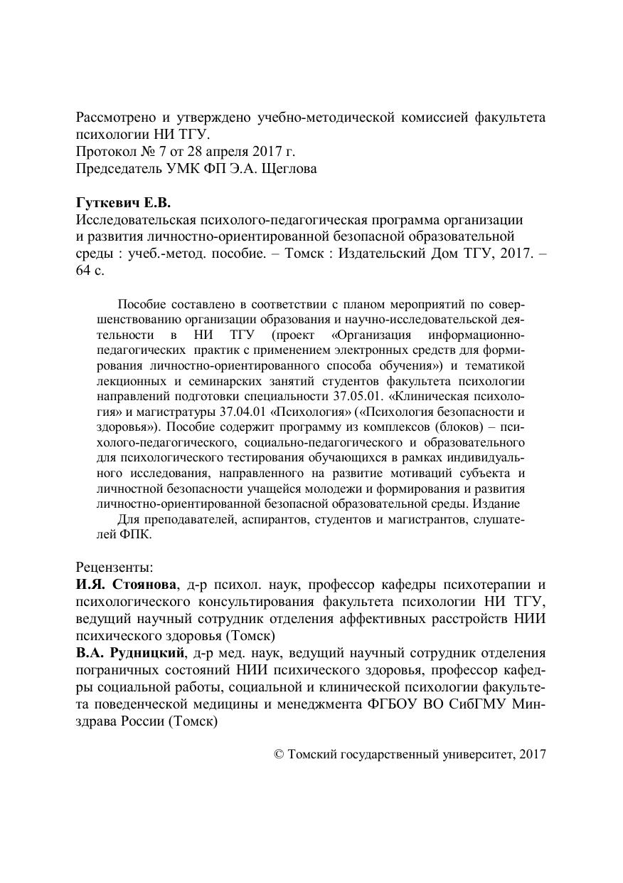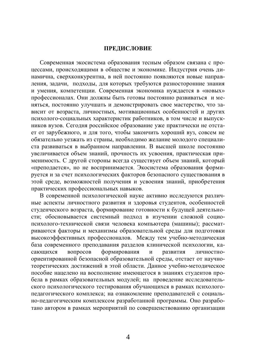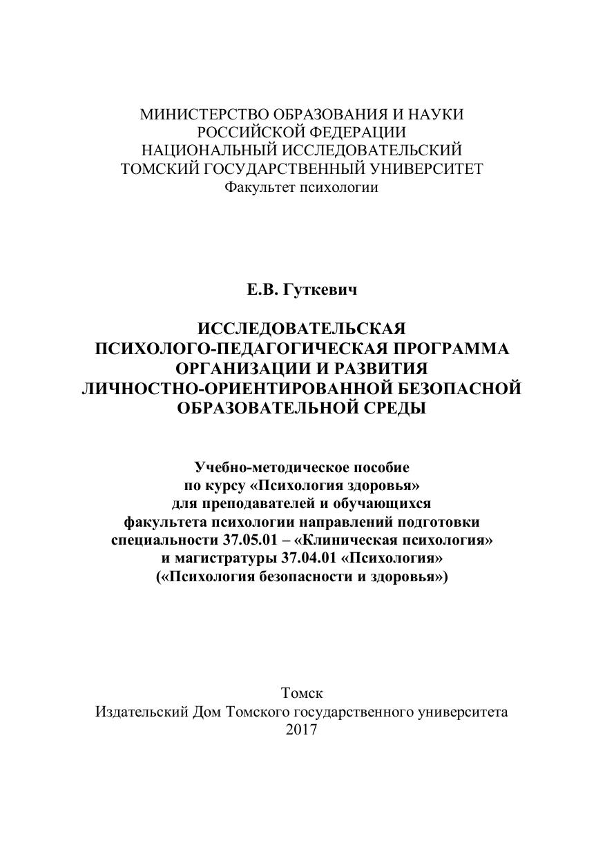 Пособие составлено в соответствии с планом мероприятий по совершенствованию организации образования и научно-исследовательской деятельности в НИ ТГУ (проект «Организация информационно-педагогических практик с применением электронных средств для формирования личностно-ориентированного способа обучения») и тематикой лекционных и семинарских занятий студентов факультета психологии направлений подготовки специальности 37.05.01. «Клиническая психология» и магистратуры 37.04.01 «Психология» («Психология безопасности и здоровья»). Пособие содержит программу из комплексов (блоков) – психолого-педагогического, социально-педагогического и образовательного для психологического тестирования обучающихся в рамках индивидуального исследования, направленного на развитие мотиваций субъекта и личностной безопасности учащейся молодежи и формирования и развития личностно-ориентированной безопасной образовательной среды. Издание Для преподавателей, аспирантов, студентов и магистрантов, слушателей ФПК.