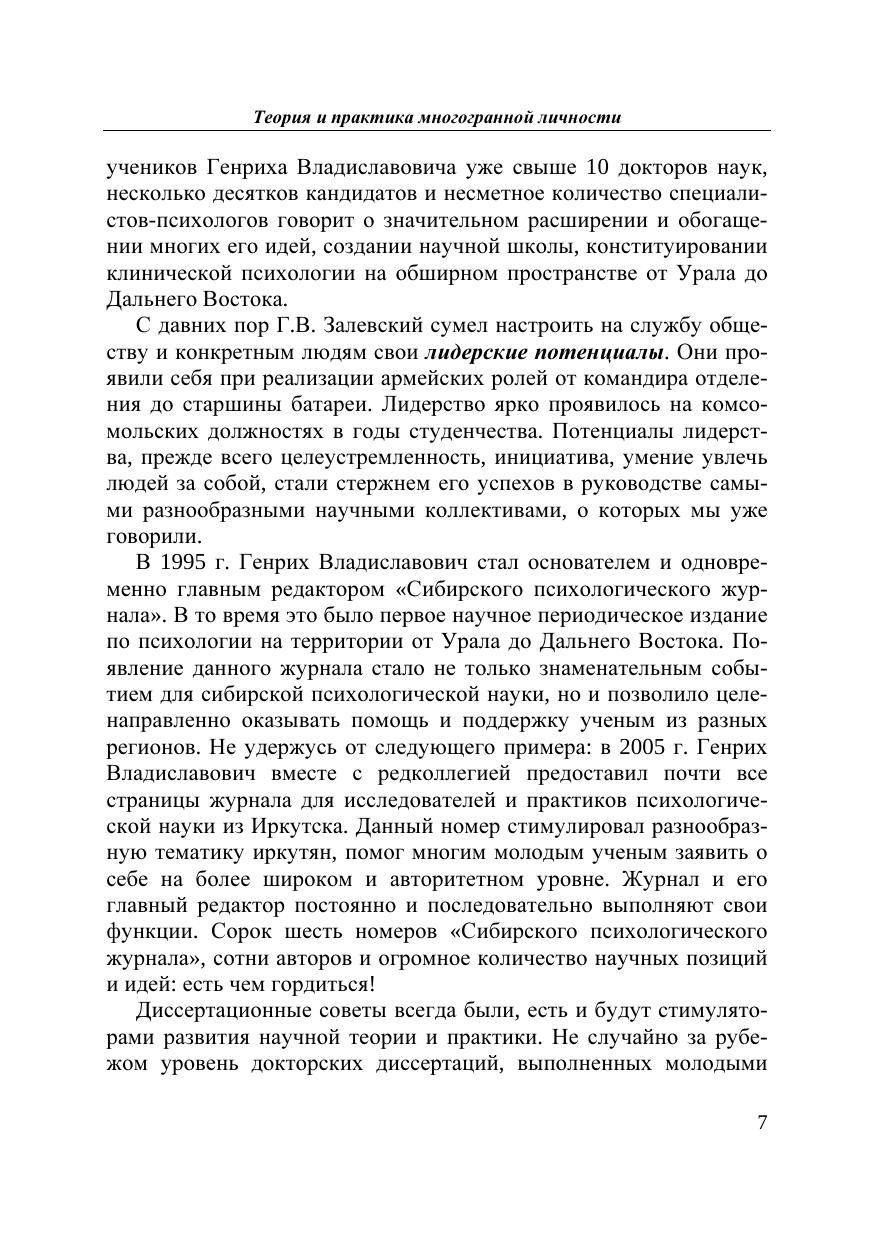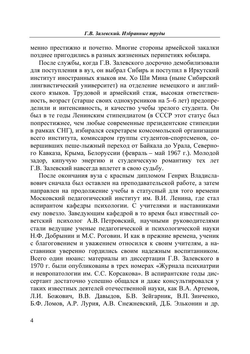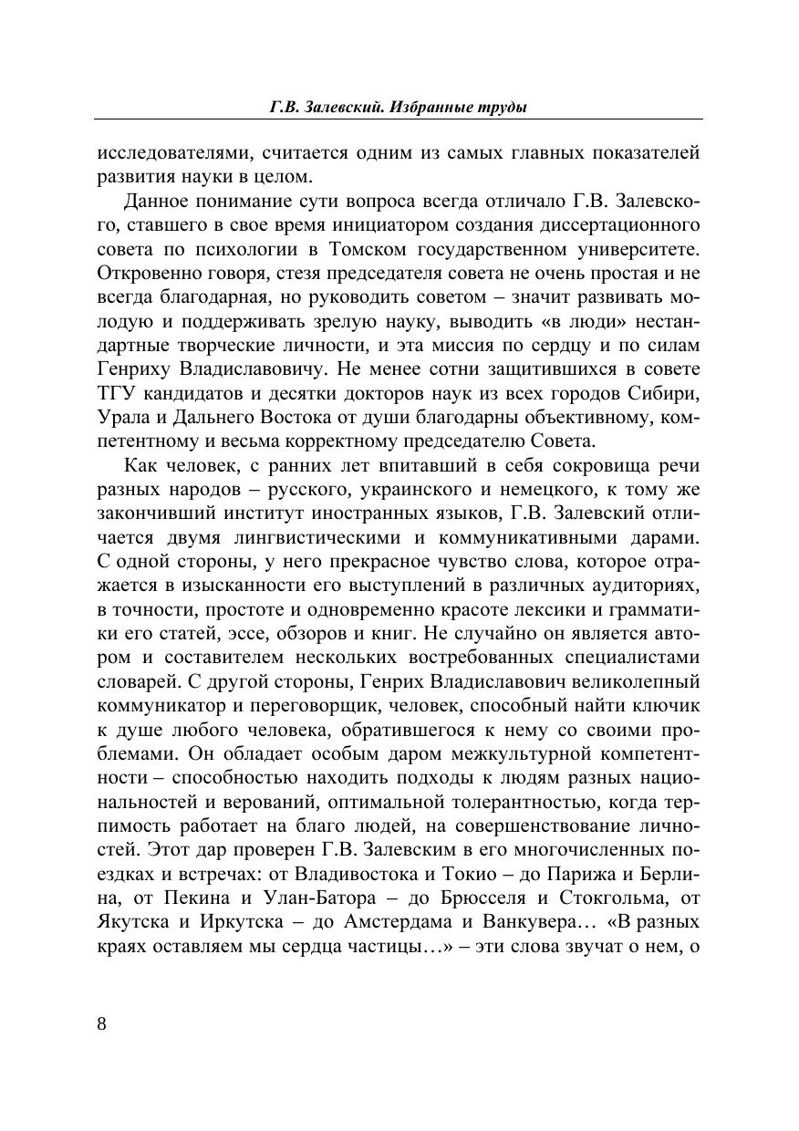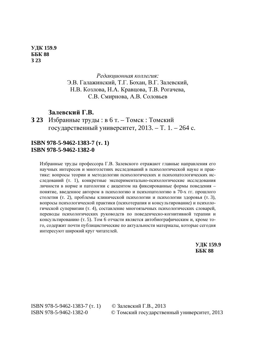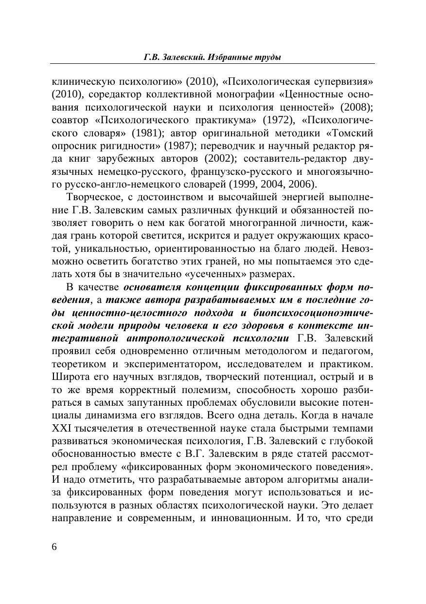 Избранные труды профессора Г.В. Залевского отражают главные направления его научных интересов и многолетних исследований в психологической науке и практике: вопросы теории и методологии психологических и психопатологических исследований (т. 1), конкретные экспериментально-психологические исследования личности в норме и патологии с акцентом на фиксированные формы поведения – понятие, введенное автором в психологию и психопатологию в 70-х гг. прошлого столетия (т. 2), проблемы клинической психологии и психологии здоровья (т. 3), вопросы психологической практики (психотерапия и консультирование) и психологической супервизии (т. 4), составление многоязычных психологических словарей, переводы психологических руководств по поведенческо-когнитивной терапии и консультированию (т. 5). Том 6 отчасти является автобиографическим и, кроме того, содержит почти публицистические по актуальности материалы, которые сегодня интересуют широкий круг читателей.