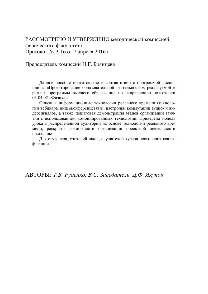 Данное пособие подготовлено в соответствии с программой дисциплины «Проектирование образовательной деятельности», реализуемой в рамках программы высшего образования по направлению подготовки 03.04.02 «Физика». Описаны информационные технологии реального времени (технологии вебинара, видеоконференцсвязи), настройки коммутации аудио- и видеосигналов, а также пошаговая демонстрация этапов организации занятий с использованием комбинированных технологий. Приведена модель урока в распределенной аудитории на основе технологий реального времени, раскрыты возможности организации проектной деятельности школьников. Для студентов, учителей школ, слушателей курсов повышения квалификации.