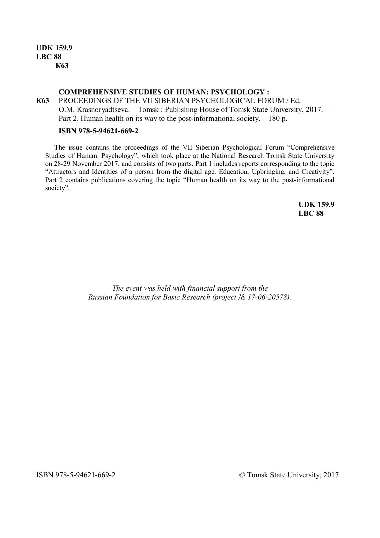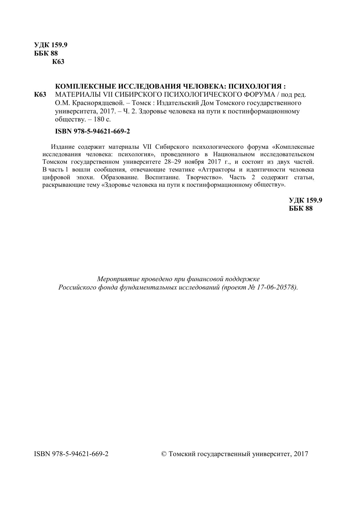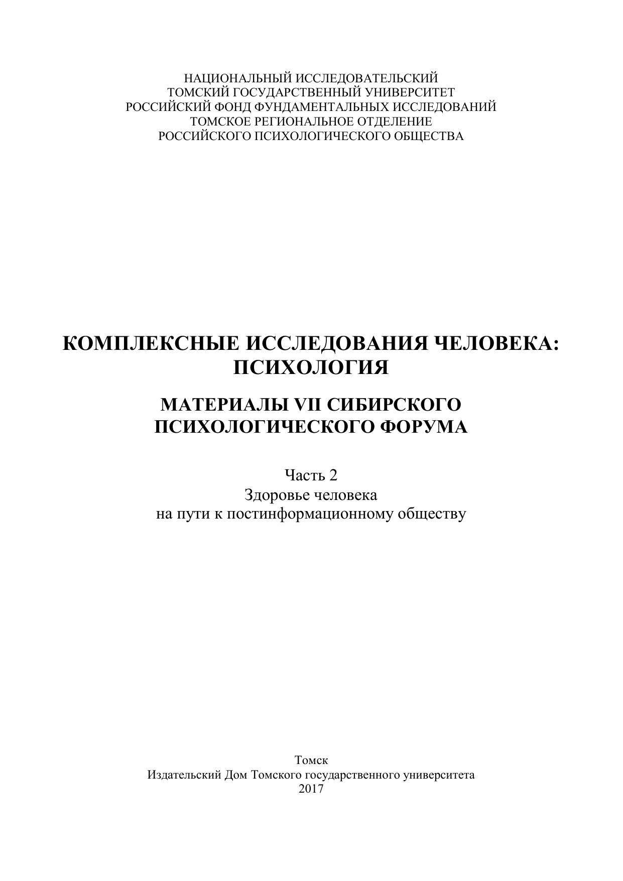 Издание содержит материалы VII Сибирского психологического форума «Комплексные исследования человека: психология», проведенного в Национальном исследовательском Томском государственном университете 28–29 ноября 2017 г., и состоит из двух частей. В часть 1 вошли сообщения, отвечающие тематике «Аттракторы и идентичности человека цифровой эпохи. Образование. Воспитание. Творчество». Часть 2 содержит статьи, раскрывающие тему «Здоровье человека на пути к постинформационному обществу».