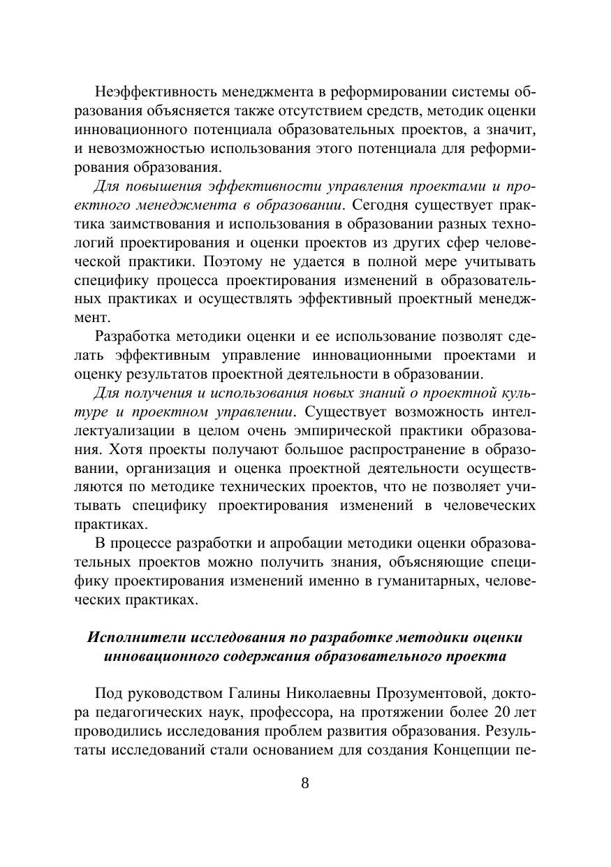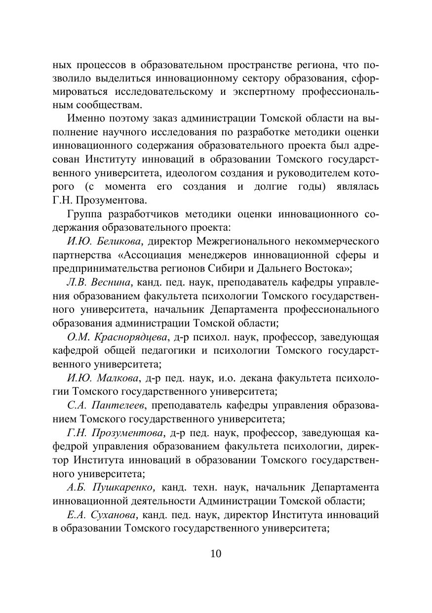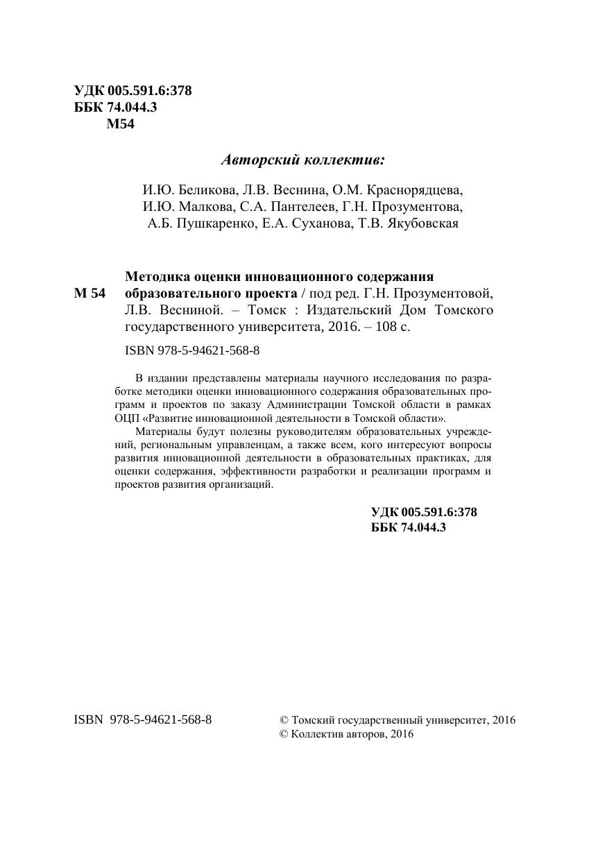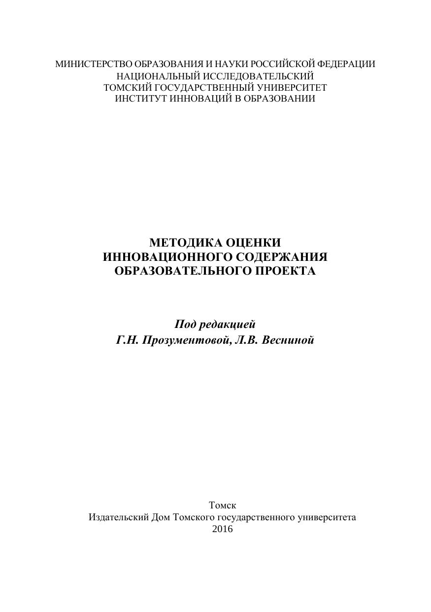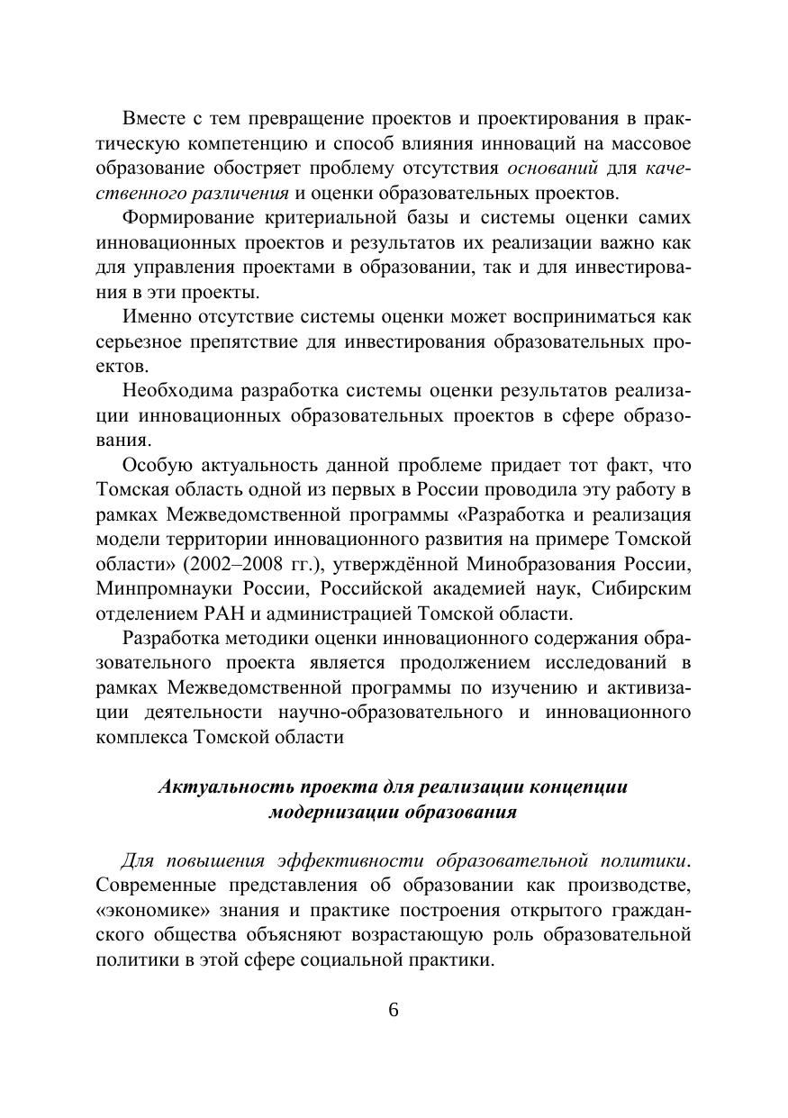 В издании представлены материалы научного исследования по разработке методики оценки инновационного содержания образовательных программ и проектов по заказу Администрации Томской области в рамках ОЦП «Развитие инновационной деятельности в Томской области». Материалы будут полезны руководителям образовательных учреждений, региональным управленцам, а также всем, кого интересуют вопросы развития инновационной деятельности в образовательных практиках, для оценки содержания, эффективности разработки и реализации программ и проектов развития организаций.