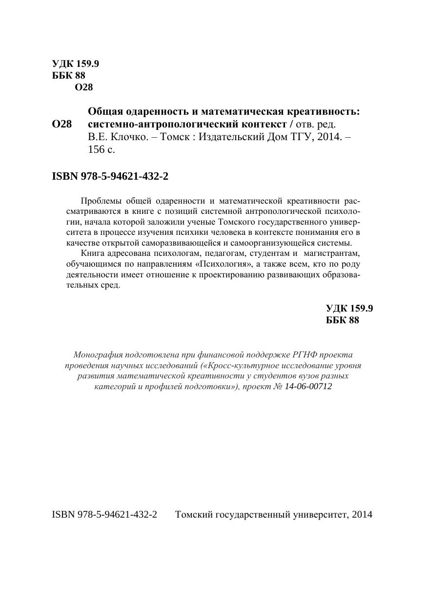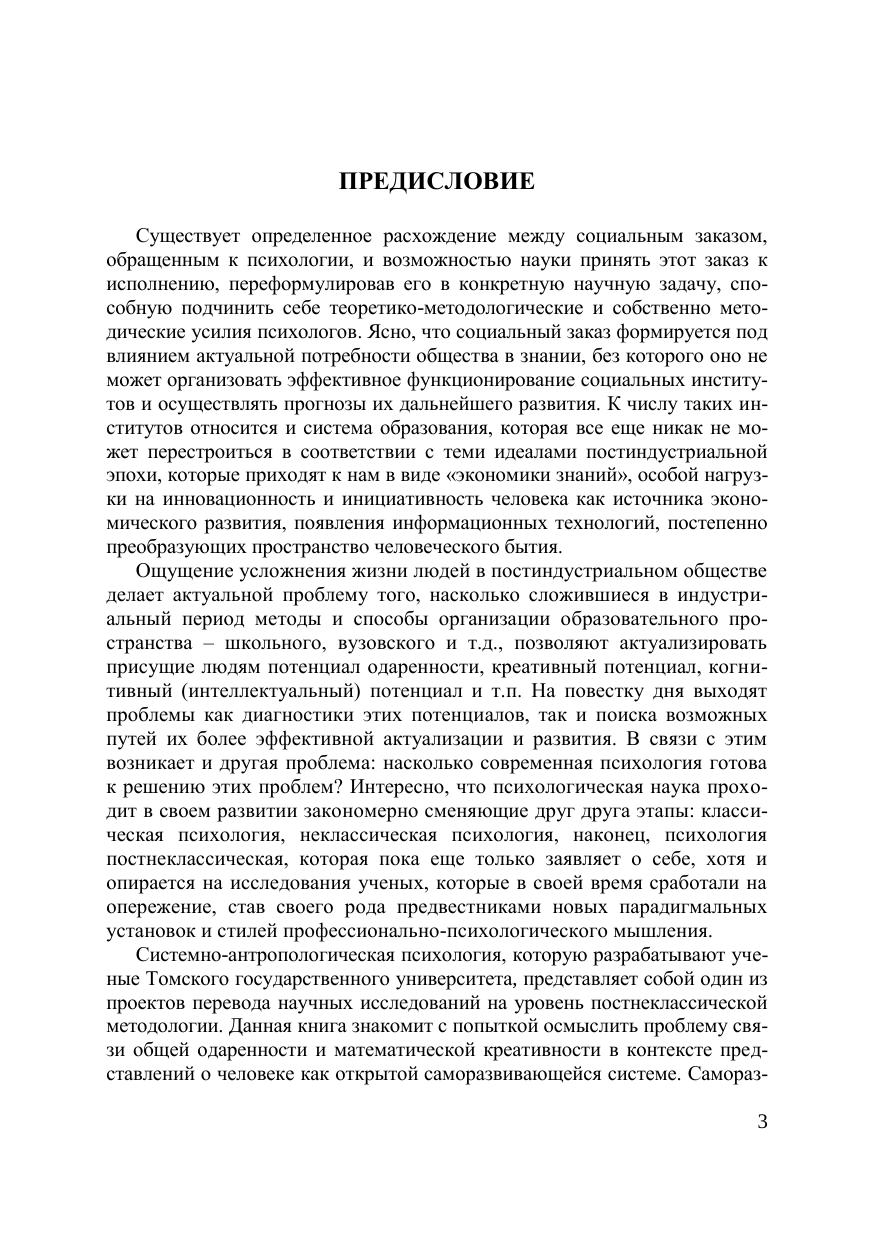 Проблемы общей одаренности и математической креативности рассматриваются в книге с позиций системной антропологической психологии, начала которой заложили ученые Томского государственного университета в процессе изучения психики человека в контексте понимания его в качестве открытой саморазвивающейся и самоорганизующейся системы. Книга адресована психологам, педагогам, студентам и магистрантам, обучающимся по направлениям «Психология», а также всем, кто по роду деятельности имеет отношение к проектированию развивающих образовательных сред.