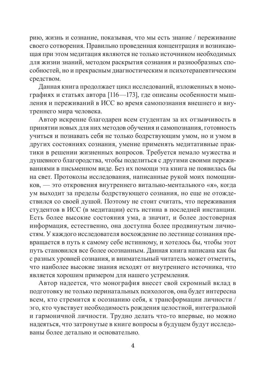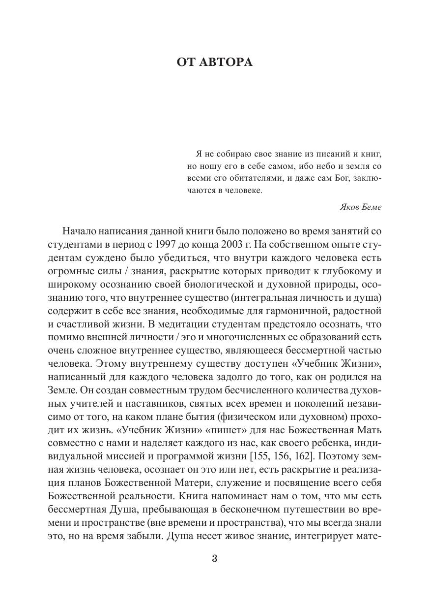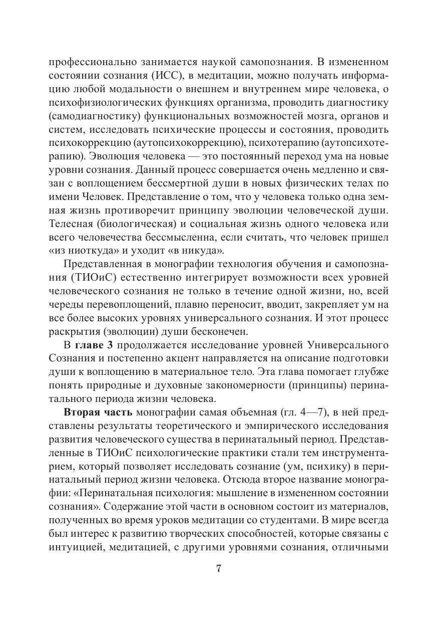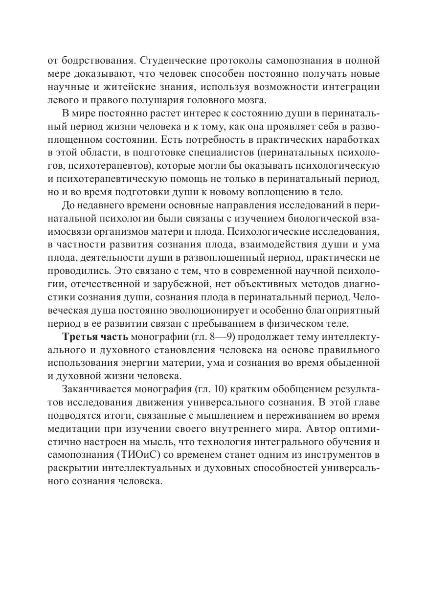 материальное тело, и в период между жизнями. Представлена авторская концепция интегральной парадигмы в психологии и технология интегрального обучения и самопознания в бодрствующем и измененном состояниях сознания (ТИОиС). Раскрываются особенности обучения, переживаний и мышления в измененном состоянии сознания. Находясь на более высоких уровнях сознания, можно получать информацию о событиях из жизни прошлого или погружаться в вероятностное будущее общества и личности, проводить психодиагностику, психокоррекцию и психотерапию.
