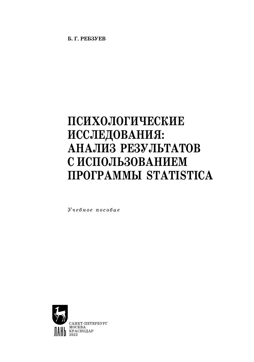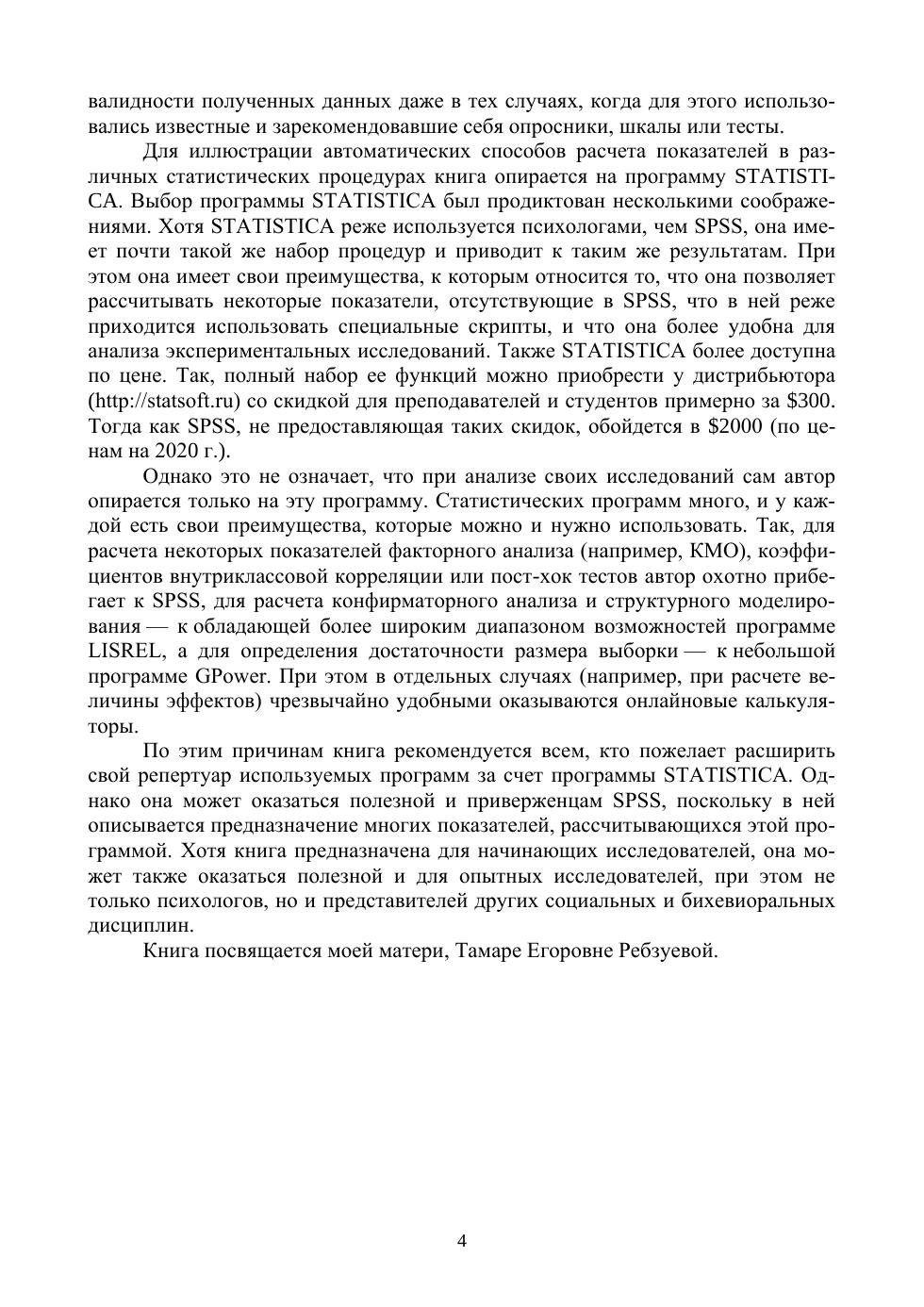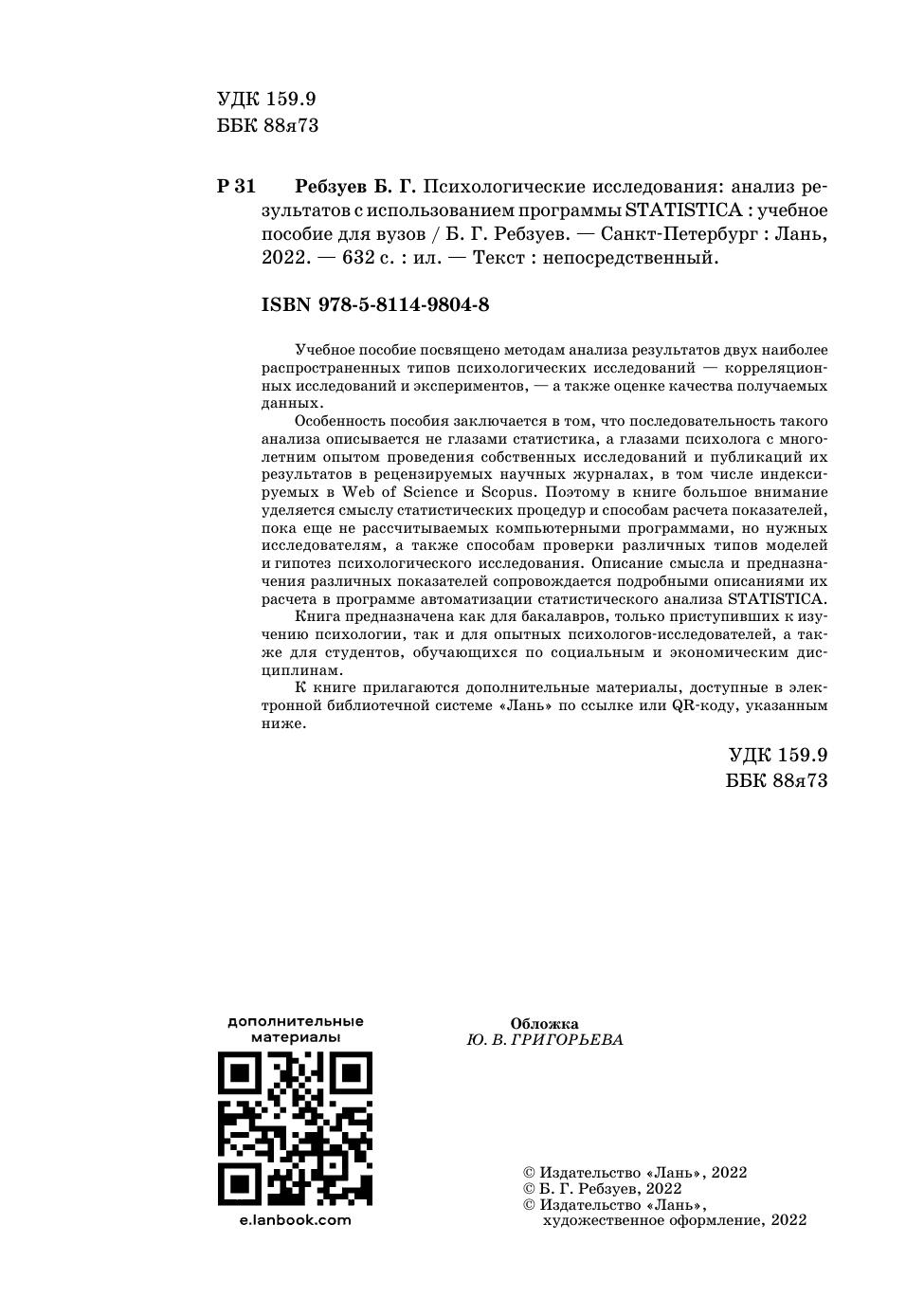Учебное пособие посвящено методам анализа результатов двух наиболее распространенных типов психологических исследований — корреляционных исследований и экспериментов, — а также оценке качества получаемых данных. Особенность пособия заключается в том, что последовательность такого анализа описывается не глазами статистика, а глазами психолога с многолетним опытом проведения собственных исследований и публикаций их результатов в рецензируемых научных журналах, в том числе индексируемых в Web of Science и Scopus. Поэтому в книге большое внимание уделяется смыслу статистических процедур и способам расчета показателей, пока еще не рассчитываемых компьютерными программами, но нужных исследователям, а также способам проверки различных типов моделей и гипотез психологического исследования. Описание смысла и предназначения различных показателей сопровождается подробными описаниями их расчета в программе автоматизации статистического анализа STATISTICA. Книга предназначена как для бакалавров, только приступивших к изучению психологии, так и для опытных психологов-исследователей, а также для студентов, обучающихся по социальным и экономическим дисциплинам. К книге прилагаются дополнительные материалы, доступные в электронной библиотечной системе «Лань» по ссылке или QR-коду, указанным ниже.
