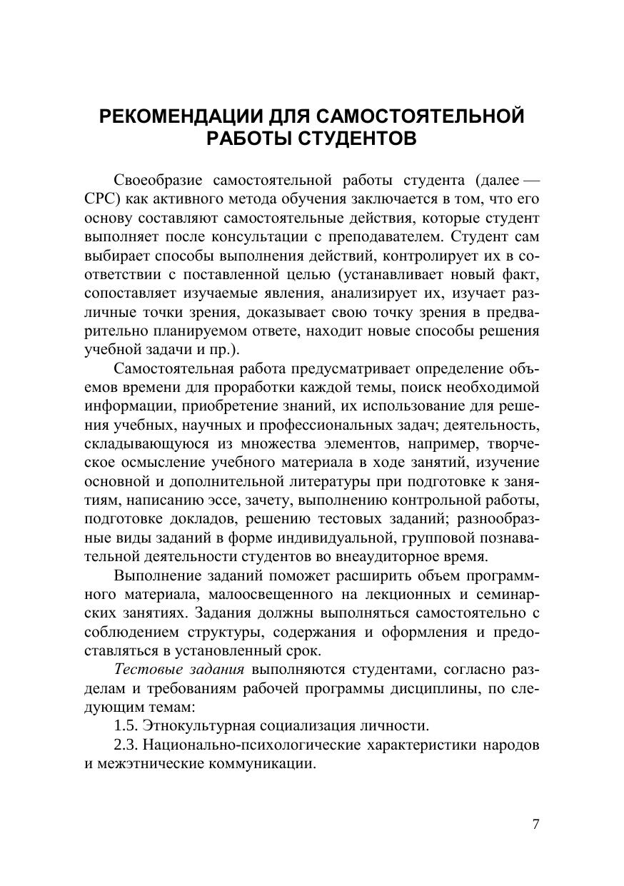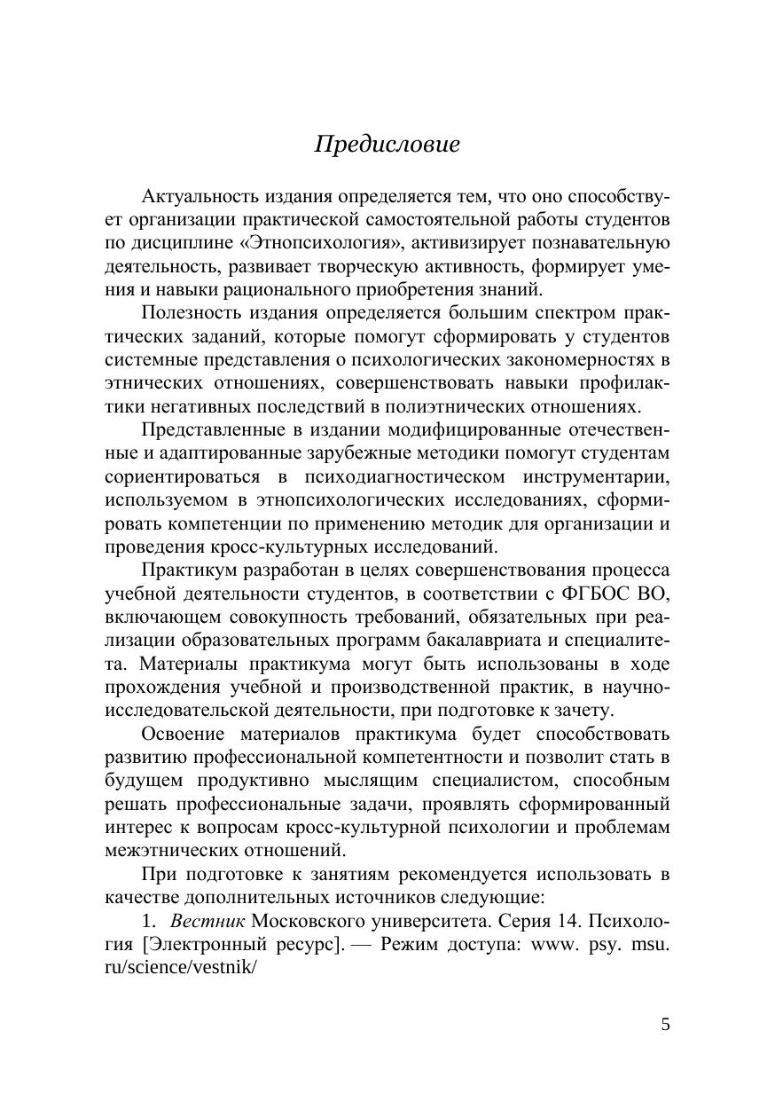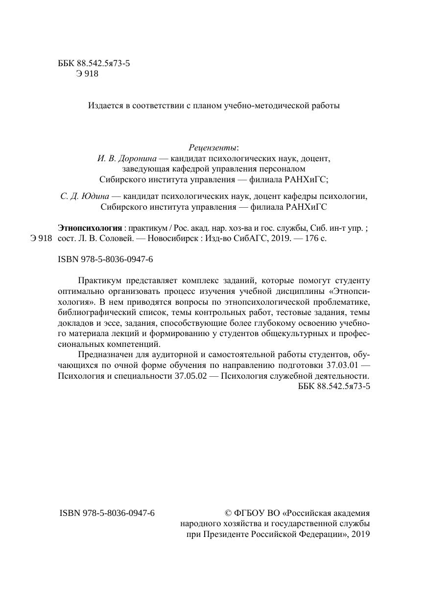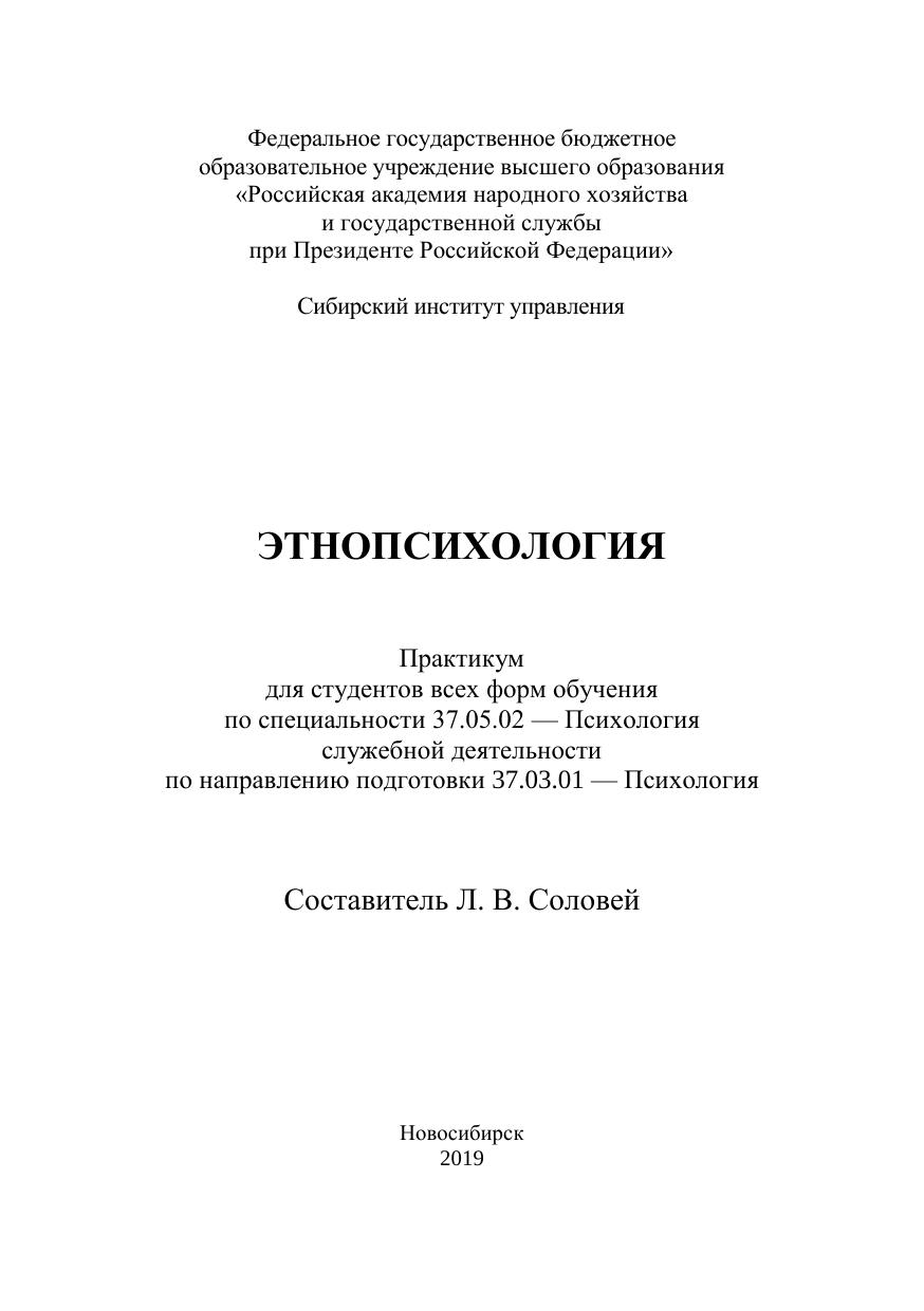 Практикум представляет комплекс заданий, которые помогут студенту оптимально организовать процесс изучения учебной дисциплины «Этнопси-хология». В нем приводятся вопросы по этнопсихологической проблематике, библиографический список, темы контрольных работ, тестовые задания, темы докладов и эссе, задания, способствующие более глубокому освоению учебно-го материала лекций и формированию у студентов общекультурных и профес-сиональных компетенций. Предназначен для аудиторной и самостоятельной работы студентов, обу-чающихся по очной форме обучения по направлению подготовки 37.03.01 — Психология и специальности 37.05.02 — Психология служебной деятельности.
