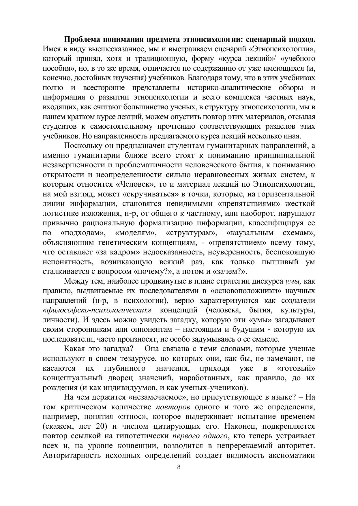 В пособии рассматриваются способы и приемы эффективного освоения дисциплины «Этнопсихология». На основе субъектного и контекстного подходов трактуются основные понятия этнопсихологии, вводятся новые темы для обсуждения и дискуссий, используется оригинальный наглядный способ усвоения материла – схемы, модели, рисунки, таблицы, к которым даны задания, помогающие понять сложные темы этнопсихологии. Развернутые конспекты лекций снабжены интересными иллюстрациями и примечаниями. Содержание лекций соответствует стремлению автора высветить дискуссионный характер современного этнопсихологического знания, обозначить новые тенденции осмысления предмета этнопсихологии.