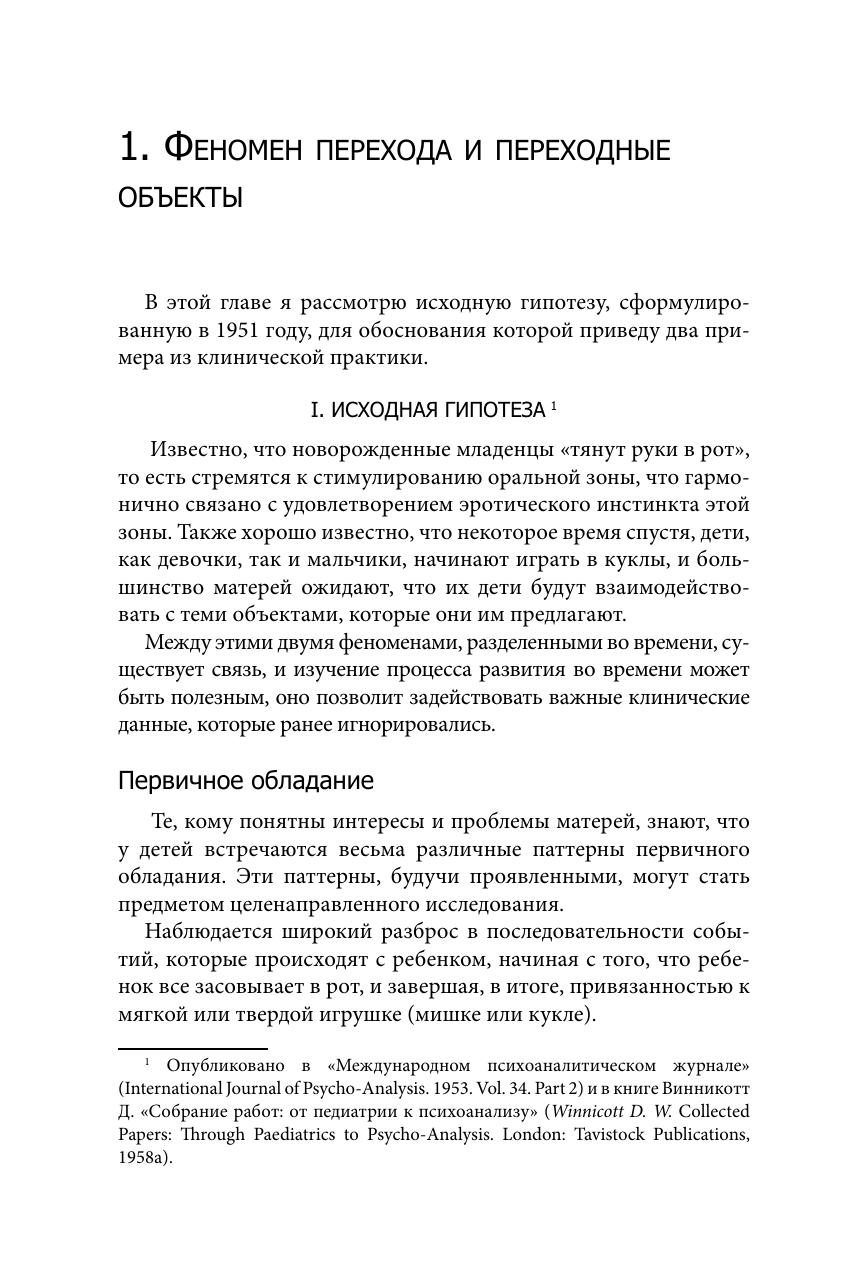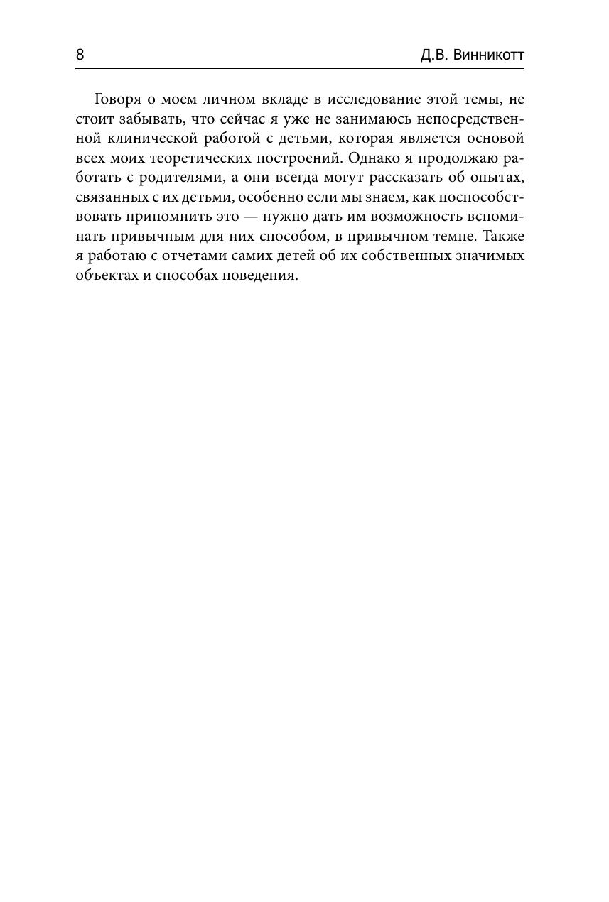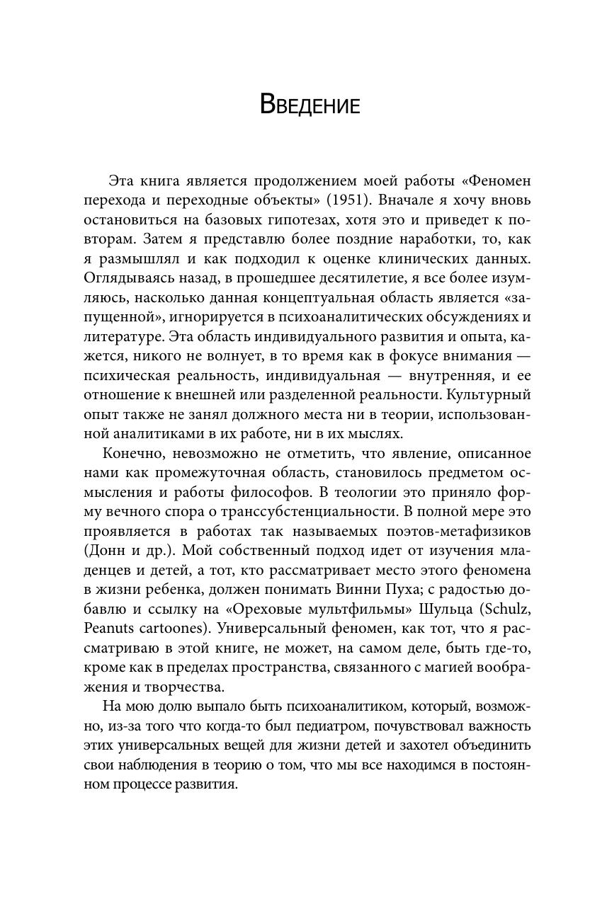Основываясь на обширном опыте клинической работы с маленькими детьми, Д.В.Винникотт внес неоценимый вклад в понимание развития человека. В данной работе Винникотт стремится исследовать истоки воображения и понять, из чего складывается способность человека жить творческой жизнью.