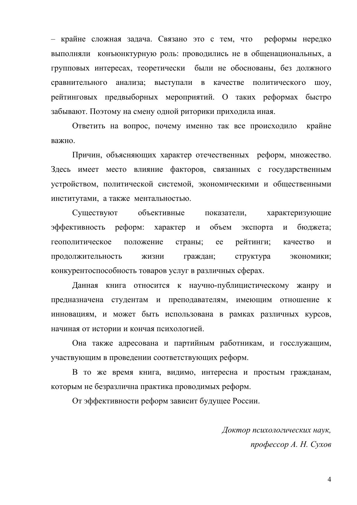 В книге раскрывается понятие, классификация, теоретические подходы к проведению реформ и модернизации в различных сферах. Большое внимание уделяется освещению истории реформ и модернизации в царской, советской и современной России. В книге также анализируются различные модели развития России в XXI веке.