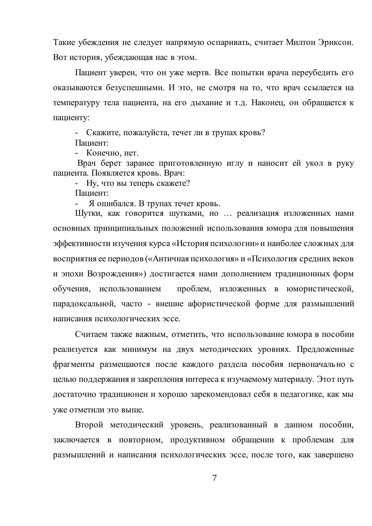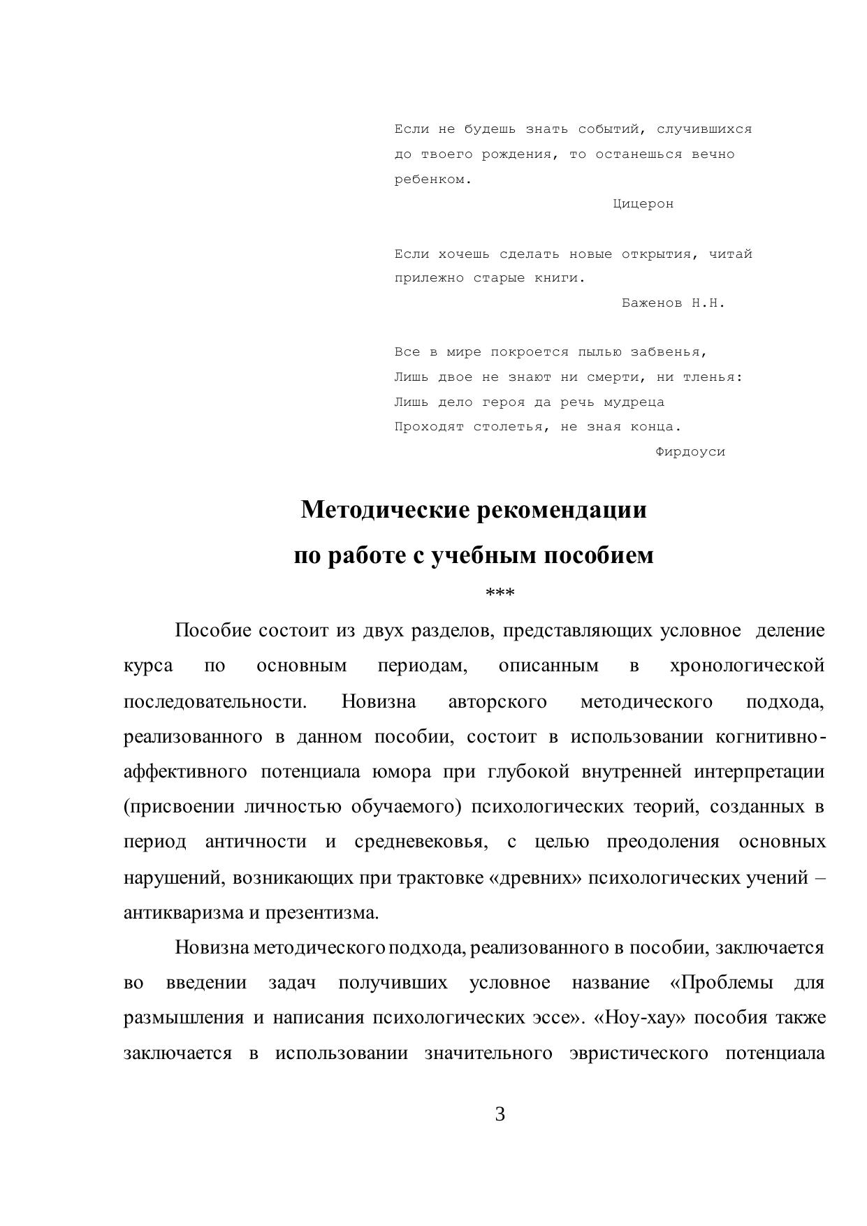 В учебном пособии представлены психологические концепции античности и средних веков и эпохи возрождения. Для повышения эффективности усвоения материала, наряду с основными теоретическими положениями, предлагаются оригинальные задания для самостоятельной работы и тестовый контроль по соответствующим периодам. Новизна авторского методического подхода, состоит в использовании когнитивно-аффективного потенциала юмора при глубокой внутренней интерпретации (присвоении личностью обучаемого) психологических теорий, созданных в период развития концепций о душе, с целью преодоления основных нарушений, возникающих при трактовке «древних» психологических учений - антикваризма и презентизма. Задания для самостоятельной работы «Проблемы для размышления и написания психологических эссе», реализуют «ноу-хау» пособия на основе использовании значительного эвристического потенциала юмора, после предварительного ознакомления с основными теоретическими концепциями рассматриваемой эпохи. Для студентов, аспирантов и преподавателей психологических факультетов вузов.