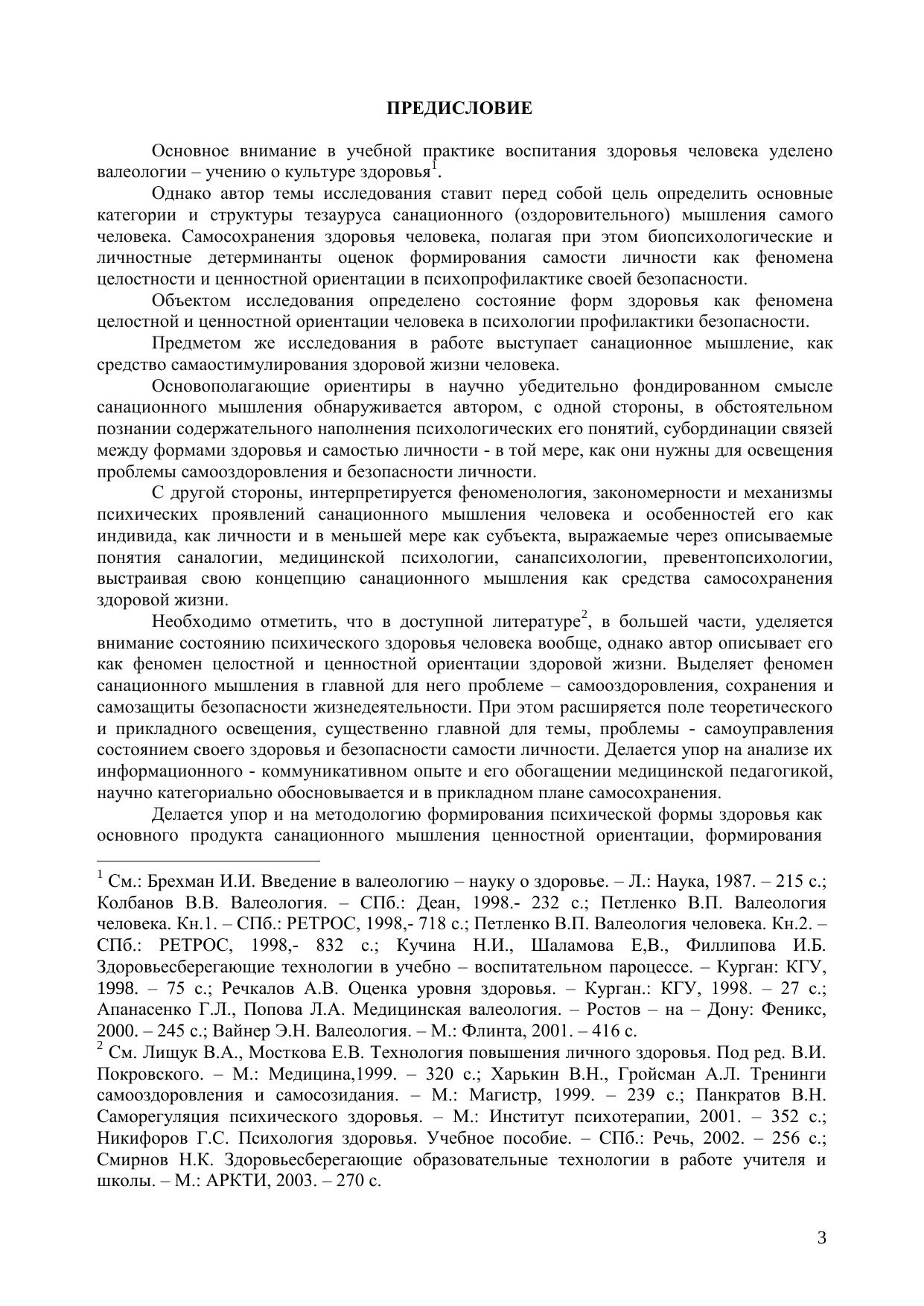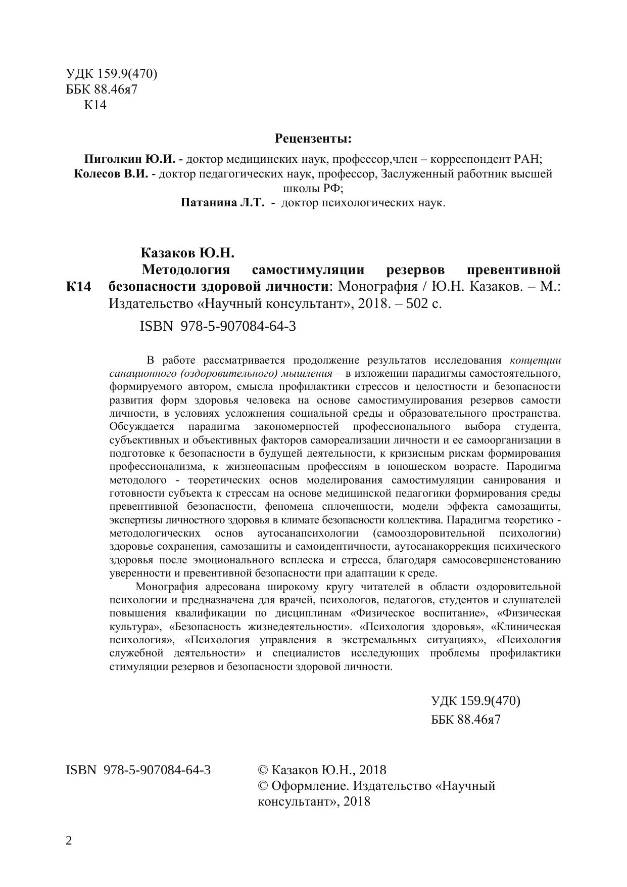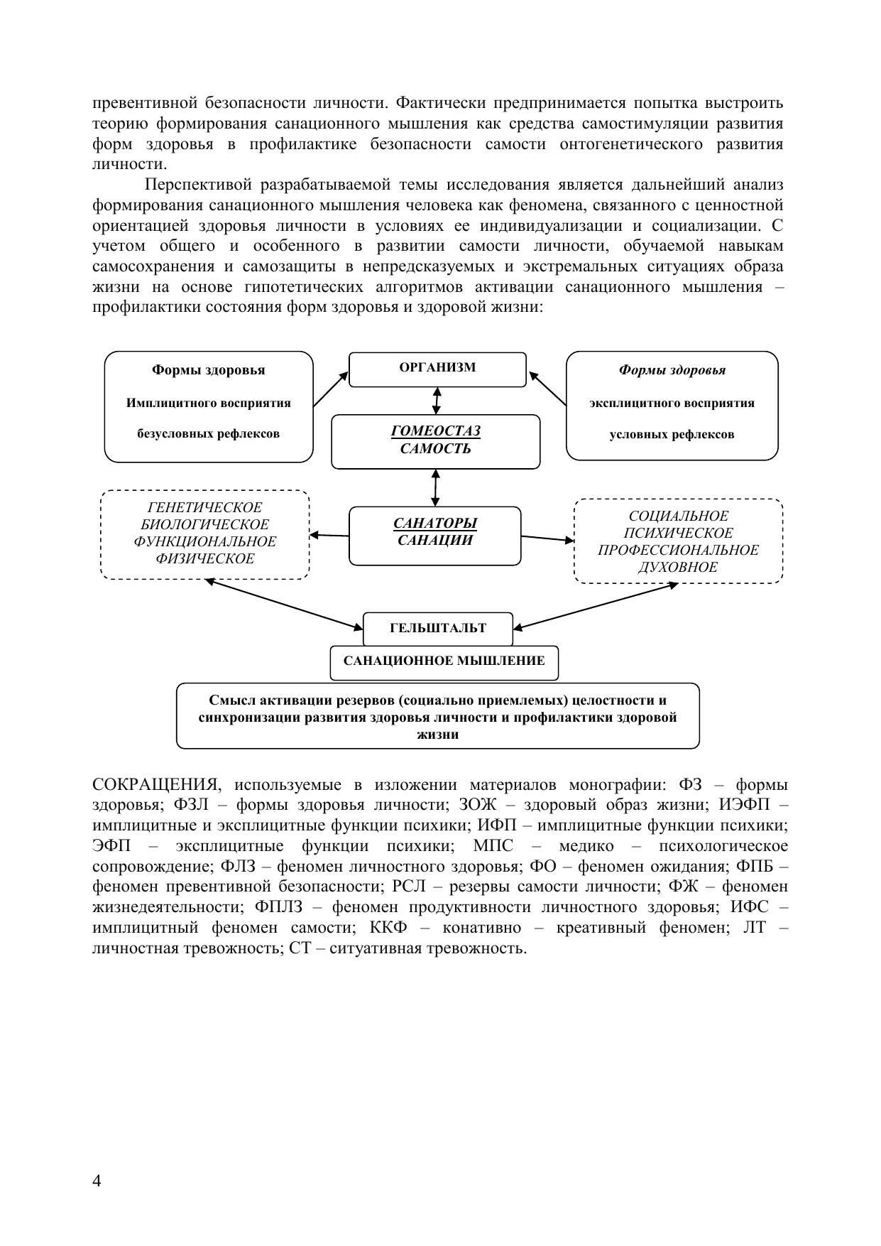 В работе рассматривается продолжение результатов исследования концепции санационного (оздоровительного) мышления – в изложении парадигмы самостоятельного, формируемого автором, смысла профилактики стрессов и целостности и безопасности развития форм здоровья человека на основе самостимулирования резервов самости личности, в условиях усложнения социальной среды и образовательного пространства. Обсуждается парадигма закономерностей профессионального выбора студента, субъективных и объективных факторов самореализации личности и ее самоорганизации в подготовке к безопасности в будущей деятельности, к кризисным рискам формирования профессионализма, к жизнеопасным профессиям в юношеском возрасте. Пародигма методолого - теоретических основ моделирования самостимуляции санирования и готовности субъекта к стрессам на основе медицинской педагогики формирования среды превентивной безопасности, феномена сплоченности, модели эффекта самозащиты, экспертизы личностного здоровья в климате безопасности коллектива. Парадигма теоретико - методологических основ аутосанапсихологии (самооздоровительной психологии) здоровье сохранения, самозащиты и самоидентичности, аутосанакоррекция психического здоровья после эмоционального всплеска и стресса, благодаря самосовершенстованию уверенности и превентивной безопасности при адаптации к среде. Монография адресована широкому кругу читателей в области оздоровительной психологии и предназначена для врачей, психологов, педагогов, студентов и слушателей повышения квалификации по дисциплинам «Физическое воспитание», «Физическая культура», «Безопасность жизнедеятельности». «Психология здоровья», «Клиническая психология», «Психология управления в экстремальных ситуациях», «Психология служебной деятельности» и специалистов исследующих проблемы профилактики стимуляции резервов и безопасности здоровой личности