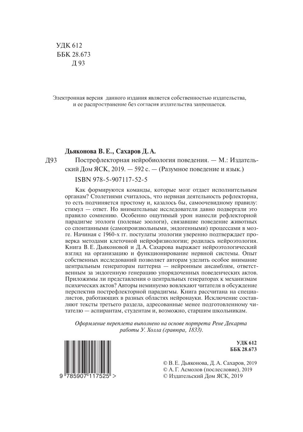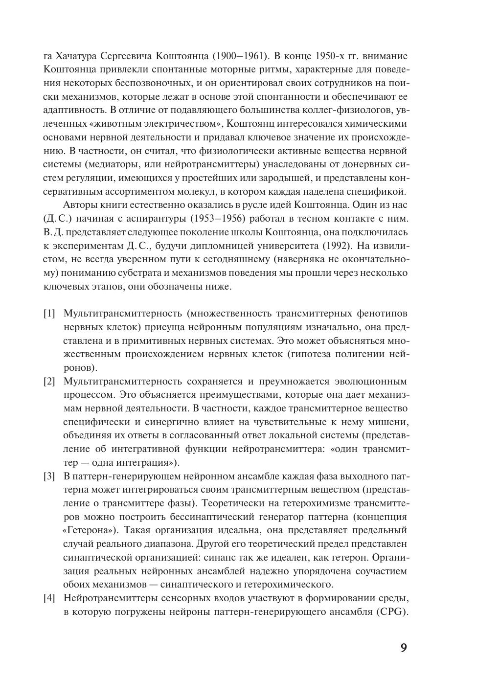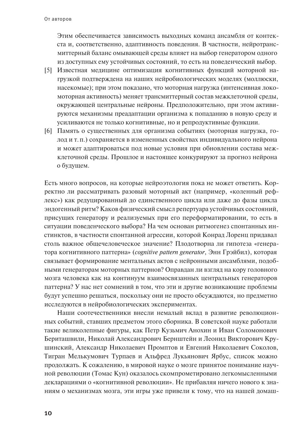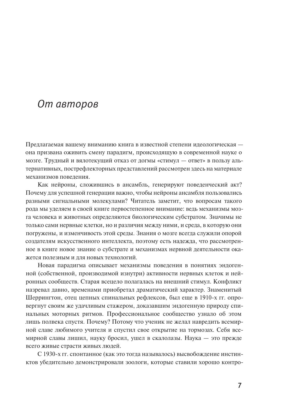Как формируются команды, которые мозг отдает исполнительным органам? Столетиями считалось, что нервная деятельность рефлекторна, то есть подчиняется простому и, казалось бы, самоочевидному правилу: стимул — ответ. Но внимательные исследователи давно подвергали это правило сомнению. Особенно ощутимый урон нанесли рефлекторной парадигме этологи (полевые зоологи), связавшие поведение животных со спонтанными (самопроизвольными, эндогенными) процессами в мозге. Начиная с 1960-х гг. постулаты этологии уверенно подтверждает проверка методами клеточной нейрофизиологии, родилась нейроэтология. Книга В. Е. Дьяконовой и Д. А. Сахарова выражает нейроэтологический взгляд на организацию и функционирование нервной системы. Опыт собственных исследований позволяет авторам уделить особое внимание центральным генераторам паттерна — нейронным ансамблям, ответственным за эндогенную генерацию упорядоченных поведенческих актов. Приложимы ли представления о центральных генераторах к механизмам психических актов? Авторы неминуемо вовлекают читателя в обсуждение перспектив пострефлекторной парадигмы. Книга рассчитана на специалистов, работающих в разных областях нейронауки. Исключение составляют тексты третьего раздела, адресованные менее подготовленному читателю — аспирантам, студентам и, возможно, старшим школьникам.
