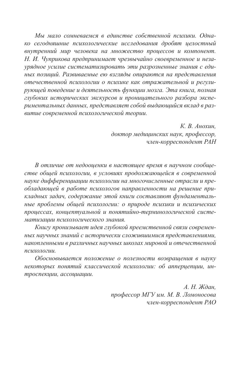 В книге обосновывается правомерность сложившегося в отечественной психологии понимания психики как отражения действительности и регулятора на этой основе поведения и деятельности. Как ответ на вопрос, что должно быть отражено в психике, чтобы поведение и деятельность были успешными, построена система основных традиционных понятий общей психологии. Выдвинуто представление о структурно-динамической функциональной системе психического отражения и регуляции поведения и деятельности, состоящей из 7 основных подсистем (когнитивной, потребностно-мотивационной, эмоциональной, мнемической, коммуникативной, активационно-энергетической, центрально-интегративной). Выдвигается представление о деятельности мозга как отражательной по своей сущности, предлагается монистическое решение психофизиологической проблемы в духе философии Спинозы. Проводится различение понятий психики и сознания, высказываются соображения о возможных физиологических механизмах сознания. Раскрывается действие в развитии психики общего универсального закона развития всех сложных систем природы и общества - от целого к частям, от общего к частному. Обосновывается принципиальное значение идеи И.П. Павлова о качественном различии высшей нервной деятельности человека и животных в связи с наличием у человека особых словесных сигналов действительности. Рассматриваются факты, свидетельствующие о высшей управляющей роли словесной системы в психике и поведении человека, предложена психофизиологическая модель вербально-смыслового управления поступающей к мозгу сенсорной афферентацией. В главах, посвященных отдельным психическим процессам, освещаются и систематизируются фактические данные их изучения. Предложен новый взгляд на природу процессов внимания, мышления, воображения, воли. Книга адресована психологам, исследователям работы мозга, философам и всем читателям, интересующимся природой психики и решением психофизиологической проблемы.