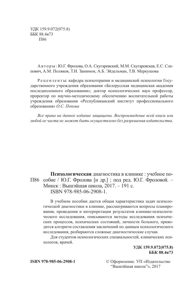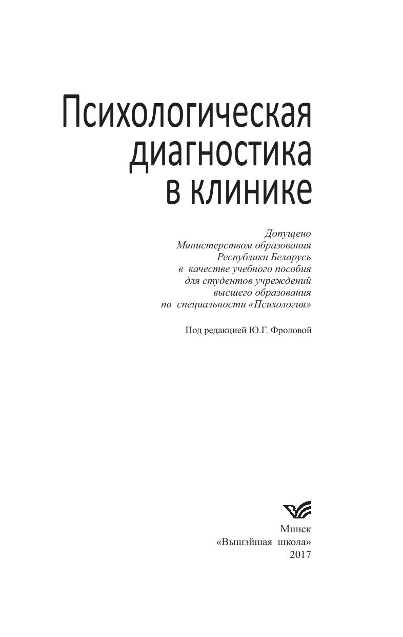 В учебном пособии дается общая характеристика задач психологической диагностики в клинике, рассматриваются вопросы планирования, проведения и интерпретации результатов клинико-психологического исследования, описываются методы исследования психических процессов, психических состояний, личности больного, приводится алгоритм составления заключений по данным психологического исследования, разбираются сложные диагностические случаи.