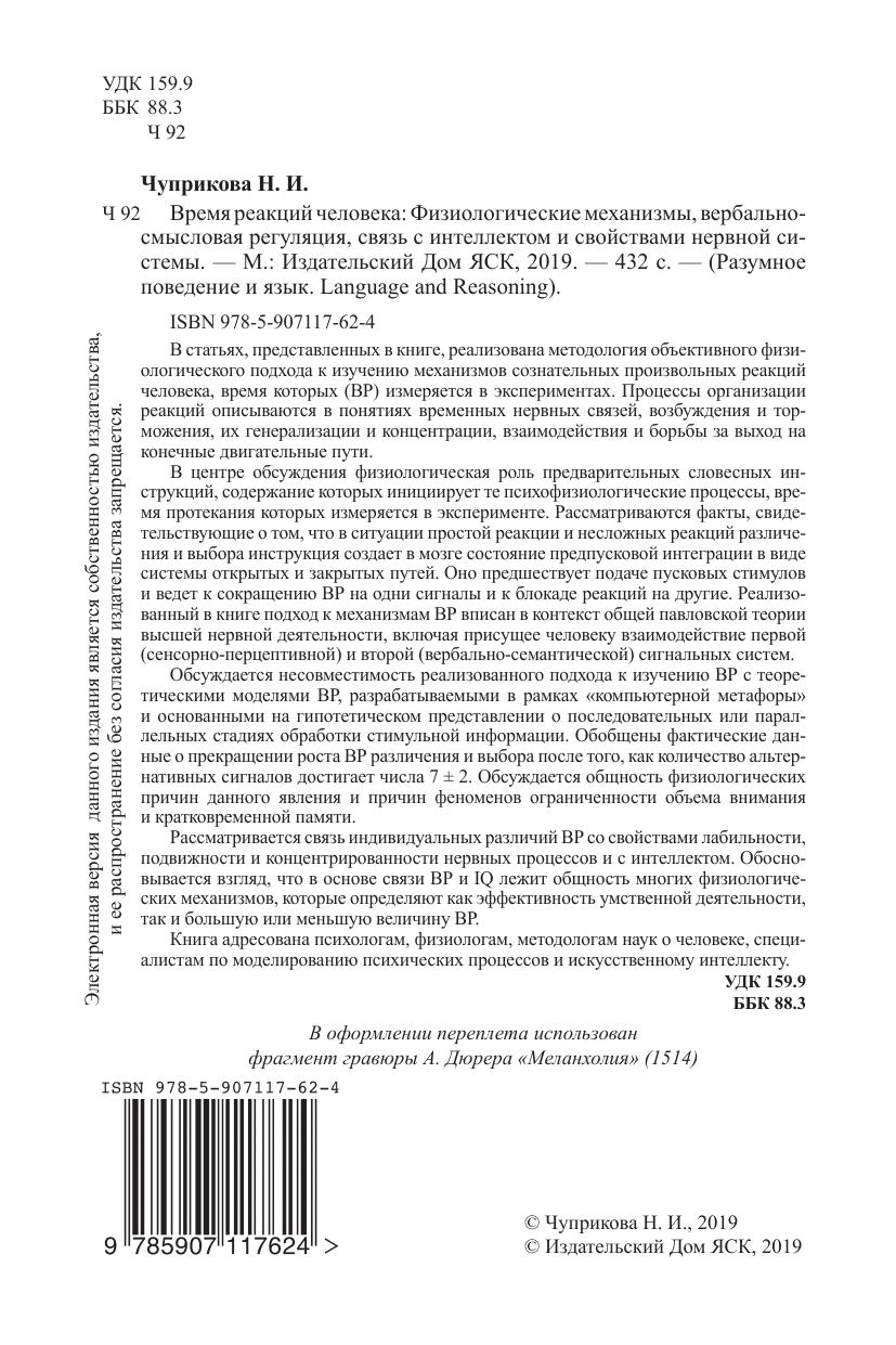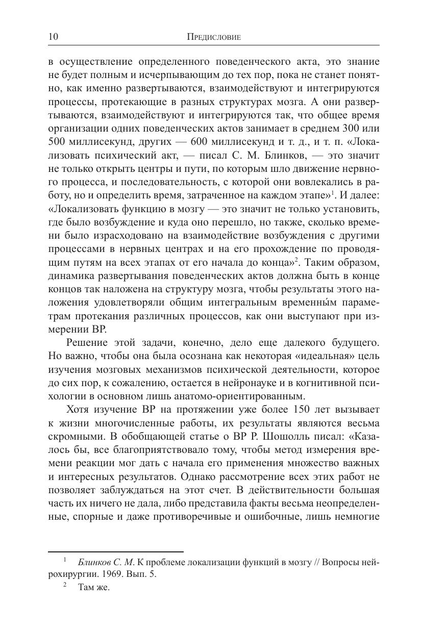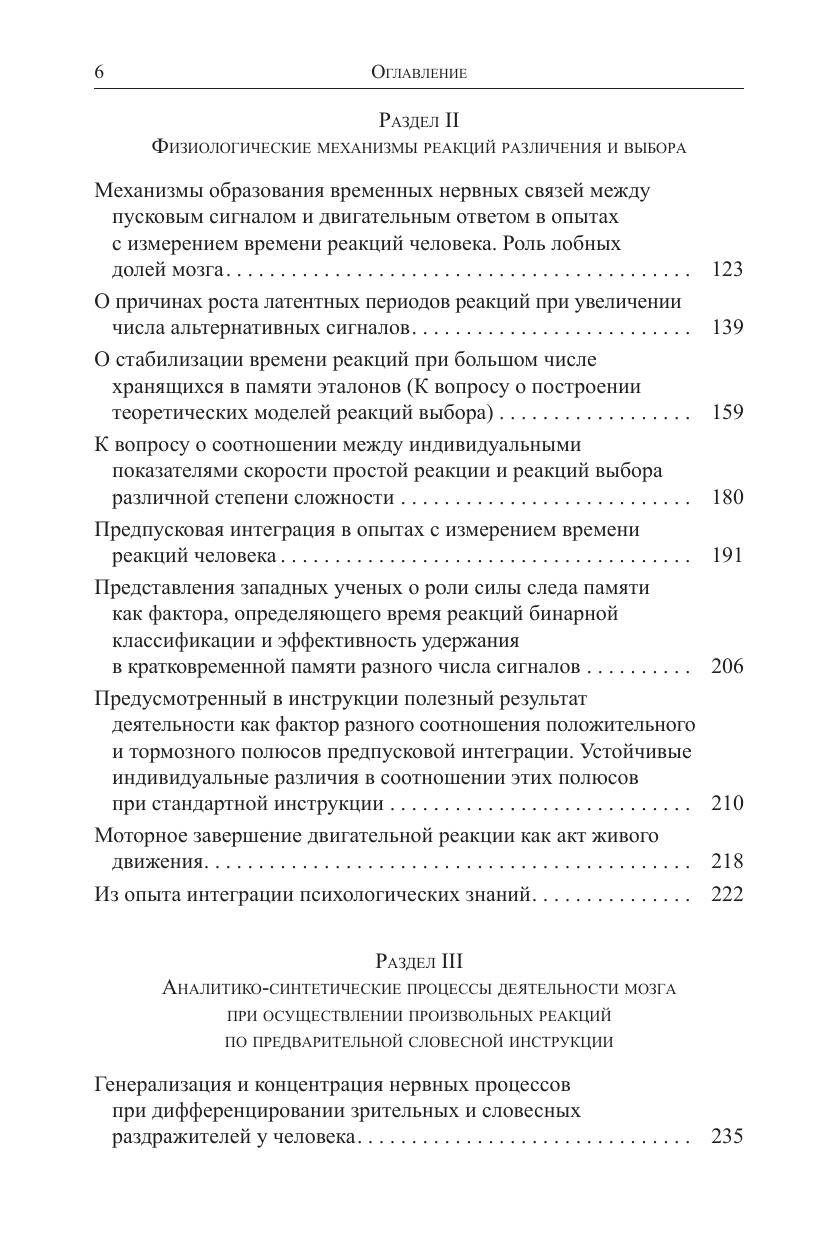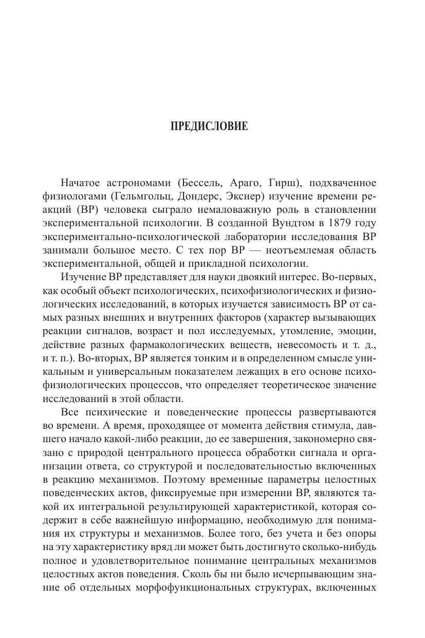 В статьях, представленных в книге, реализована методология объективного физиологического подхода к изучению механизмов сознательных произвольных реакций человека, время которых (ВР) измеряется в экспериментах. Процессы организации реакций описываются в понятиях временных нервных связей, возбуждения и торможения, их генерализации и концентрации, взаимодействия и борьбы за выход на конечные двигательные пути. В центре обсуждения физиологическая роль предварительных словесных инструкций, содержание которых инициирует те психофизиологические процессы, время протекания которых измеряется в эксперименте. Рассматриваются факты, свидетельствующие о том, что в ситуации простой реакции и несложных реакций различения и выбора инструкция создает в мозге состояние предпусковой интеграции в виде системы открытых и закрытых путей. Оно предшествует подаче пусковых стимулов и ведет к сокращению ВР на одни сигналы и к блокаде реакций на другие. Реализованный в книге подход к механизмам ВР вписан в контекст общей павловской теории высшей нервной деятельности, включая присущее человеку взаимодействие первой (сенсорно-перцептивной) и второй (вербально-семантической) сигнальных систем. Обсуждается несовместимость реализованного подхода к изучению ВР с теоретическими моделями ВР, разрабатываемыми в рамках «компьютерной метафоры» и основанными на гипотетическом представлении о последовательных или параллельных стадиях обработки стимульной информации. Обобщены фактические данные о прекращении роста ВР различения и выбора после того, как количество альтернативных сигналов достигает числа 7 ± 2. Обсуждается общность физиологических причин данного явления и причин феноменов ограниченности объема внимания и кратковременной памяти. Рассматривается связь индивидуальных различий ВР со свойствами лабильности, подвижности и концентрированности нервных процессов и с интеллектом. Обосновывается взгляд, что в основе связи ВР и IQ лежит общность многих физиологических механизмов, которые определяют как эффективность умственной деятельности, так и большую или меньшую величину ВР. Книга адресована психологам, физиологам, методологам наук о человеке, специалистам по моделированию психических процессов и искусственному интеллекту.