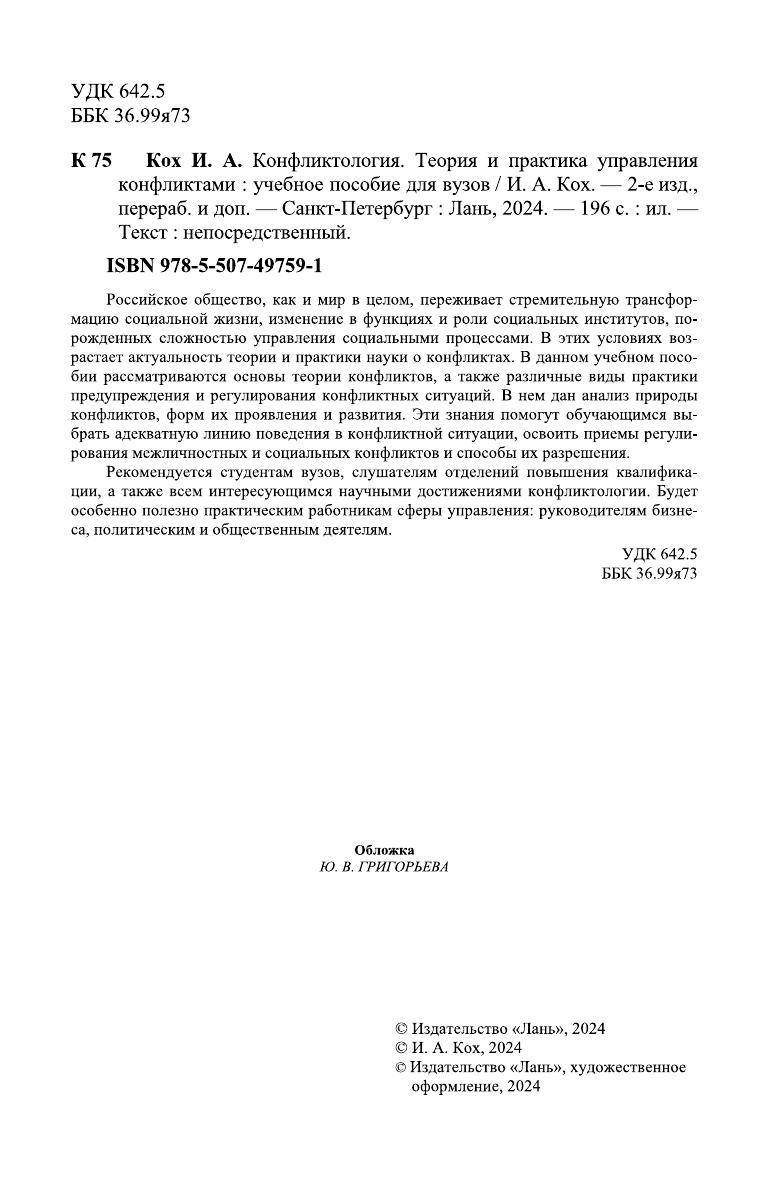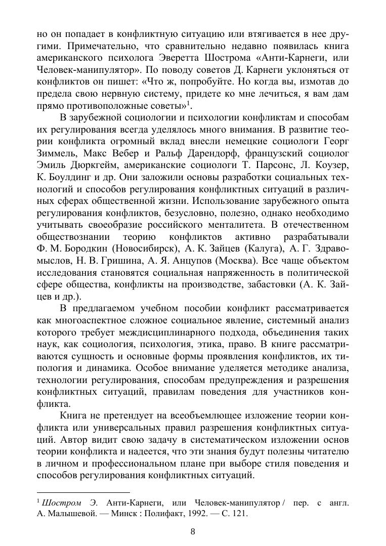Российское общество, как и мир в целом, переживает стремительную трансформацию социальной жизни, изменение в функциях и роли социальных институтов, порожденных сложностью управления социальными процессами. В этих условиях возрастает актуальность теории и практики науки о конфликтах. В данном учебном пособии рассматриваются основы теории конфликтов, а также различные виды практики предупреждения и регулирования конфликтных ситуаций. В нем дан анализ природы конфликтов, форм их проявления и развития. Эти знания помогут обучающимся выбрать адекватную линию поведения в конфликтной ситуации, освоить приемы регулирования межличностных и социальных конфликтов и способы их разрешения. Рекомендуется студентам вузов, слушателям отделений повышения квалификации, а также всем интересующимся научными достижениями конфликтологии. Будет особенно полезно практическим работникам сферы управления: руководителям бизнеса, политическим и общественным деятелям.