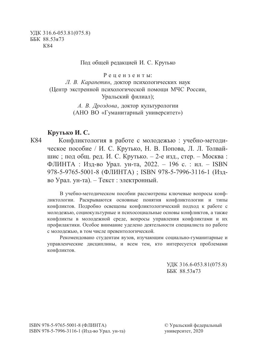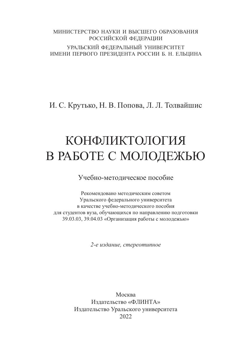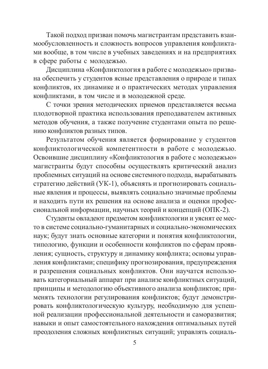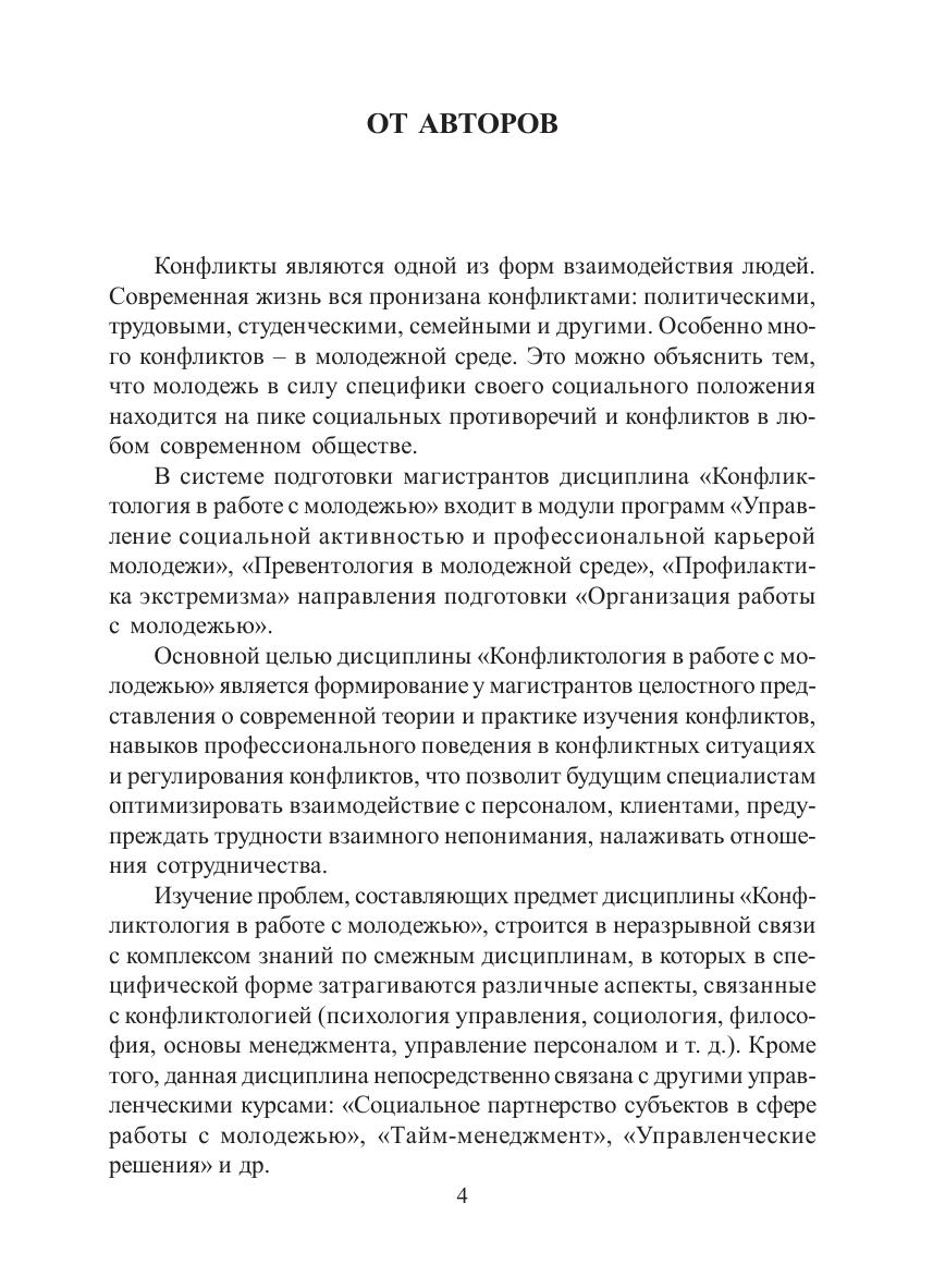 В учебно-методическом пособии рассмотрены ключевые вопросы конфликтологии. Раскрываются основные понятия конфликтологии и типы конфликтов. Подробно освещены конфликтологический подход к работе с молодежью, социокультурные и психосоциальные основы конфликтов, а также конфликты в молодежной среде, вопросы управления конфликтами и их профилактики. Особое внимание уделено деятельности специалиста по работе с молодежью, в том числе превентологической.