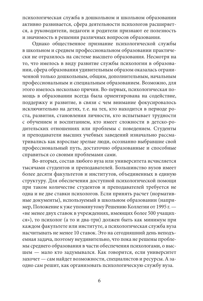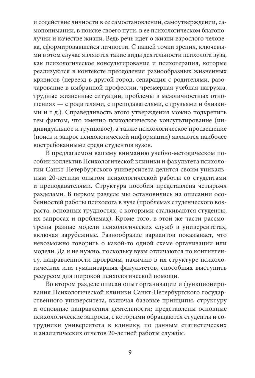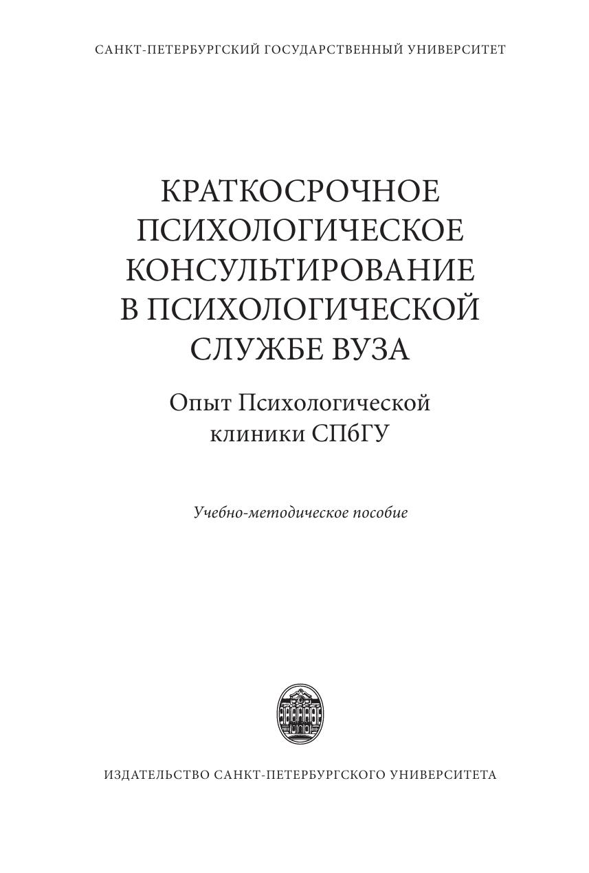 Учебно-методическое пособие обобщает 20-летний опыт работы Психологической клиники СПбГУ. Особое внимание уделено вопросам организации деятельности психологических служб в вузе, а также описанию специфики проблем, с которыми сталкиваются обучающиеся. Ведущим направлением деятельности психологической службы в вузе рассматривается оказание кризисной психологической помощи. В пособии подробно представлена модель краткосрочного психологического консультирования как эффективная форма оказания психологической помощи. В отдельном разделе обсуждаются этические аспекты и проблемы психологического консультирования в вузе; приведены практические рекомендации по организации психологической помощи в онлайн-формате. Пособие адресовано организаторам и специалистам психологических служб вузов, а также может быть использовано студентами-психологами, обучающимися по программам психологической, психолого-педагогической и социальной направленности.