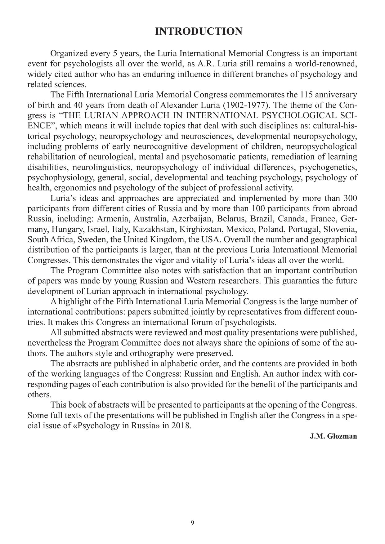 Организуемый раз в 5 лет Международный Конгресс памяти А.Р. Лурия является важнейшим событием в мировой психологии, ибо А.Р. Лурия, по общему признанию, внес огромный вклад в развитие самых разных областей психологии