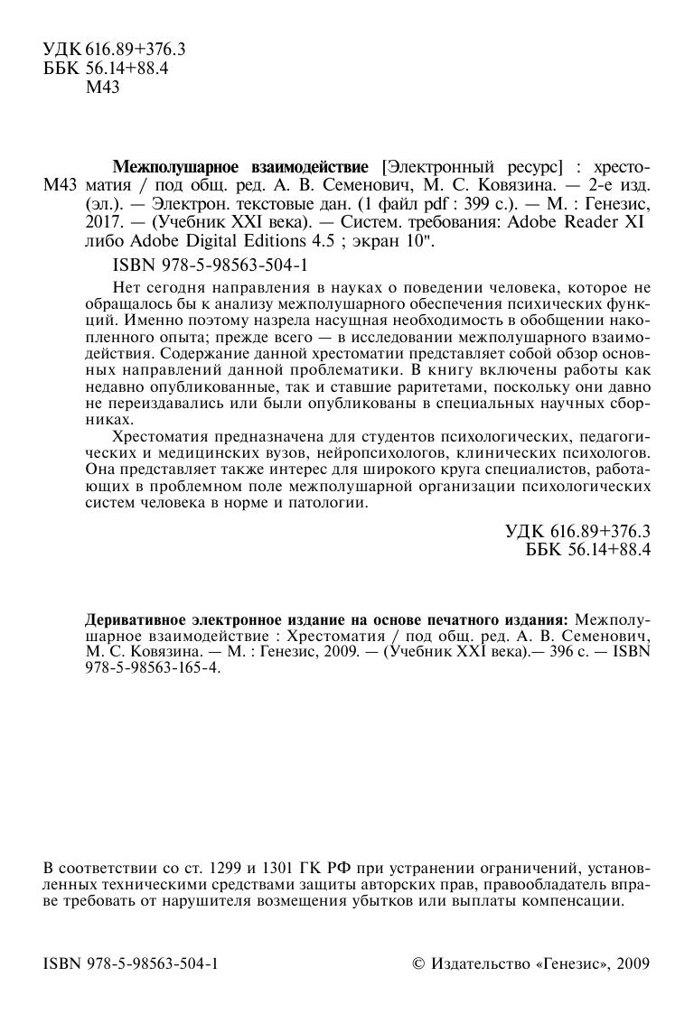 Хрестоматия предназначена для студентов психологических, педагогических и медицинских вузов, нейропсихологов, клинических психологов. Она представляет также интерес для широкого круга специалистов, работающих в проблемном поле межполушарной организации психологических систем человека в норме и патологии.