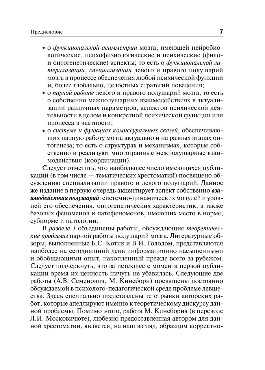 Нет сегодня направления в науках о поведении человека, которое не обращалось бы к анализу межполушарного обеспечения психических функций. Именно поэтому назрела насущная необходимость в обобщении накопленного опыта; прежде всего — в исследовании межполушарного взаимодействия. Содержание данной хрестоматии представляет собой обзор основных направлений данной проблематики. В книгу включены работы как недавно опубликованные, так и ставшие раритетами, поскольку они давно не переиздавались или были опубликованы в специальных научных сборниках.