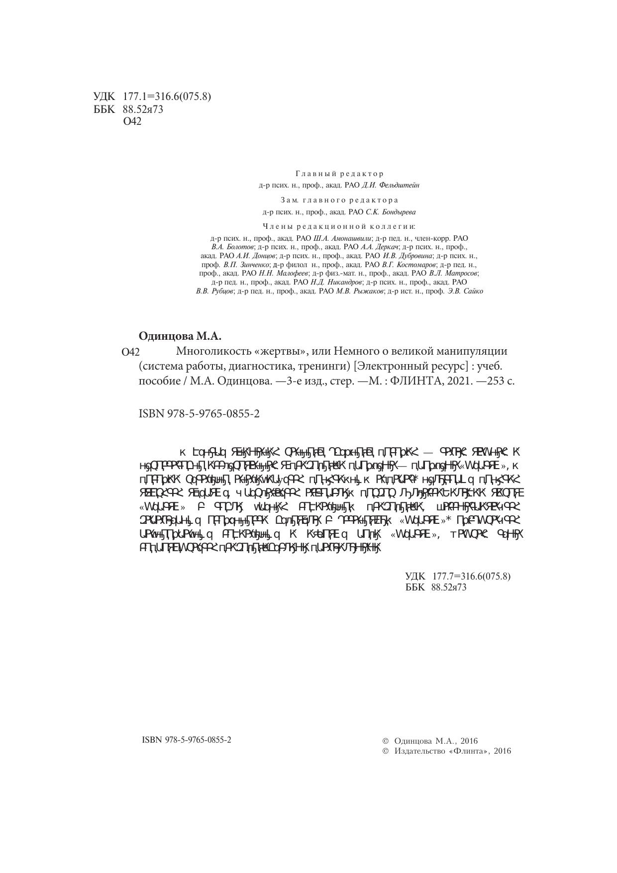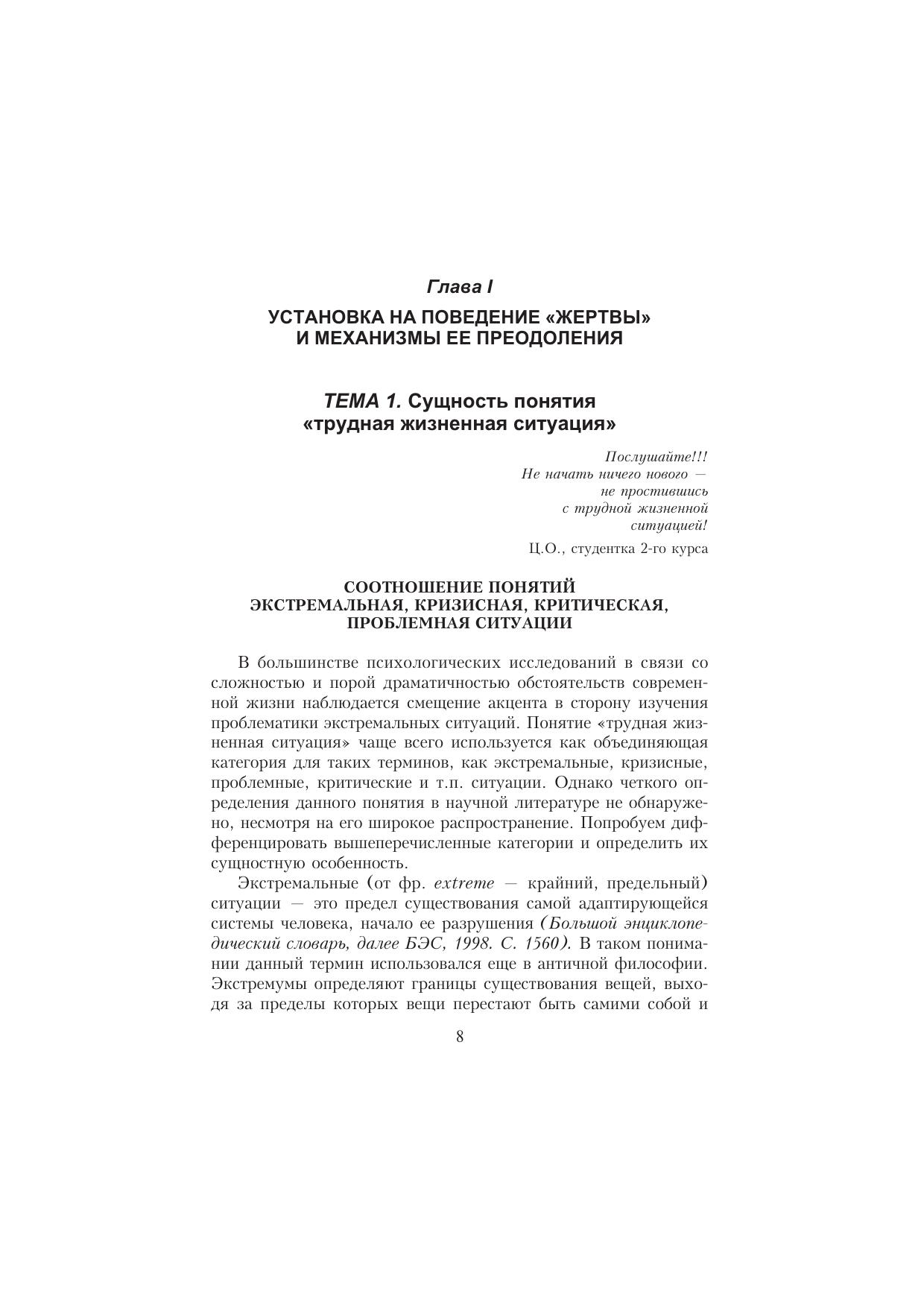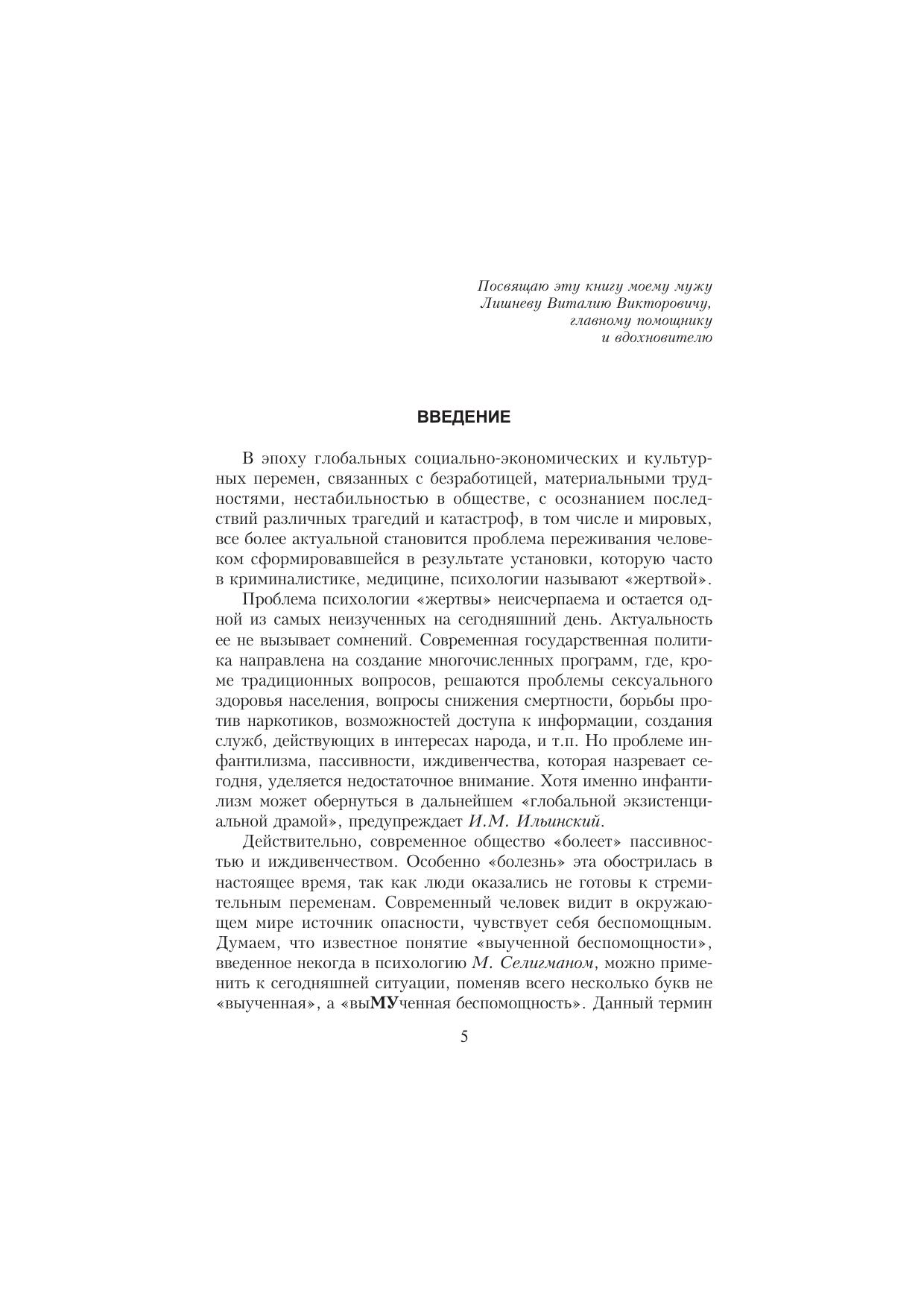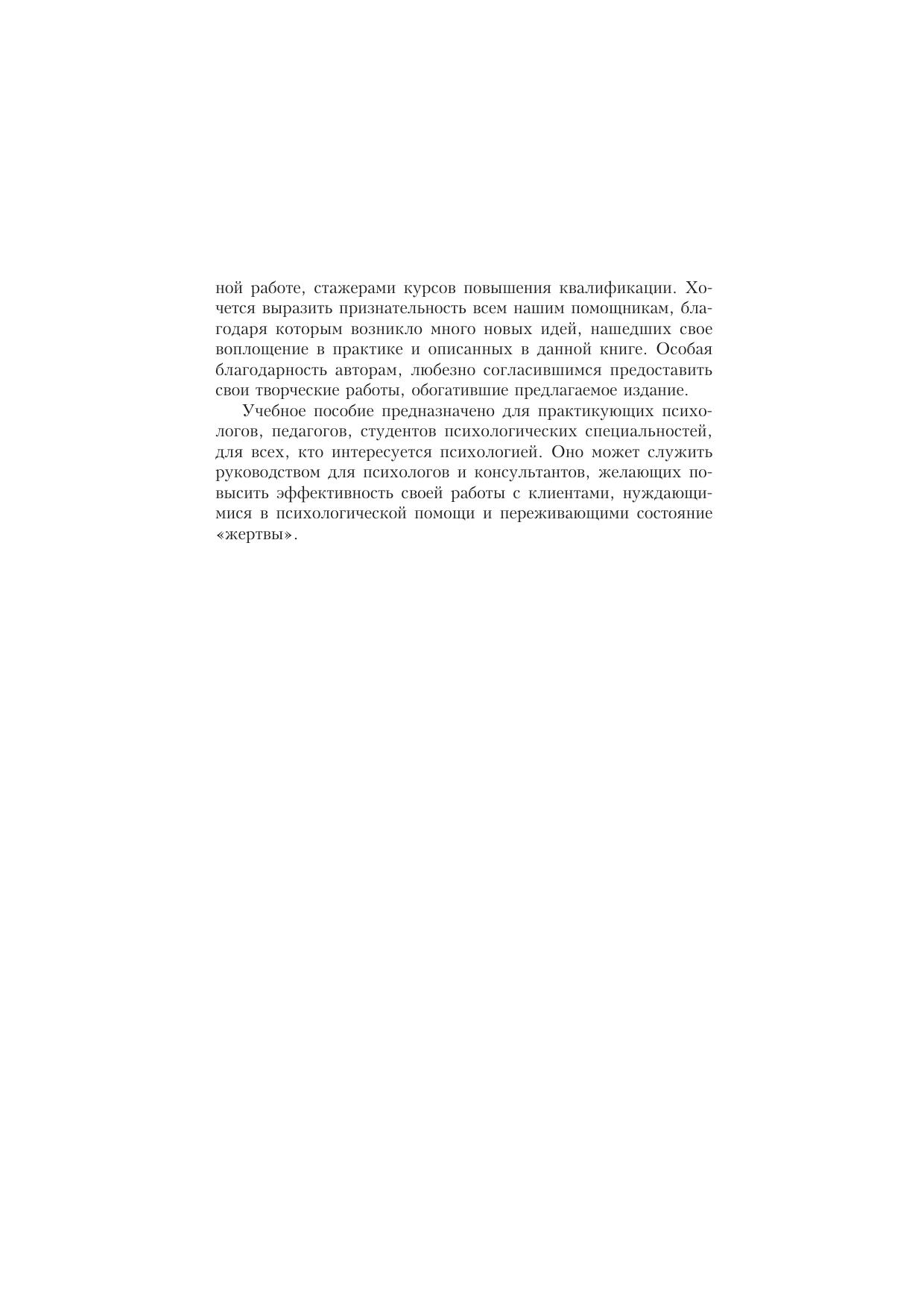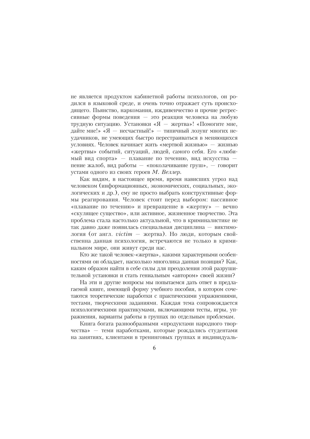 В центре внимания данного учебного пособия — такая важная и недостаточно исследованная в психологии проблема — проблема «жертвы». В пособии детально анализируется понятийный аппарат, некоторые понятия вводятся впервые. Предлагается авторский подход к классификации видов «жертвы» с точки зрения социальной психологии. Рассматриваются характерные особенности человека с установкой «жертвы», обсуждаются разнообразные социальные и игровые роли «жертвы». Каждая тема сопровождается психологическими практикумами, включающими тестовые задания, игры, упражнения, работу в группах по отдельным проблемам. Для студентов, преподавателей, практикующих психологов.