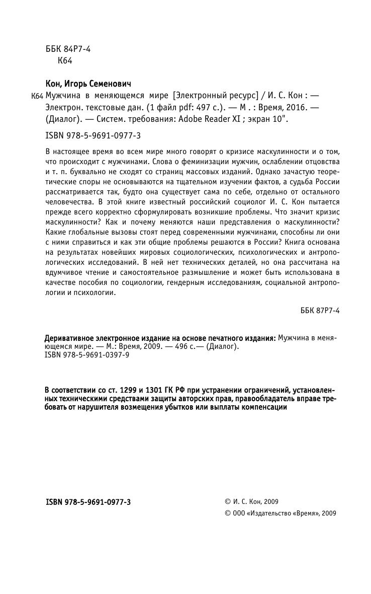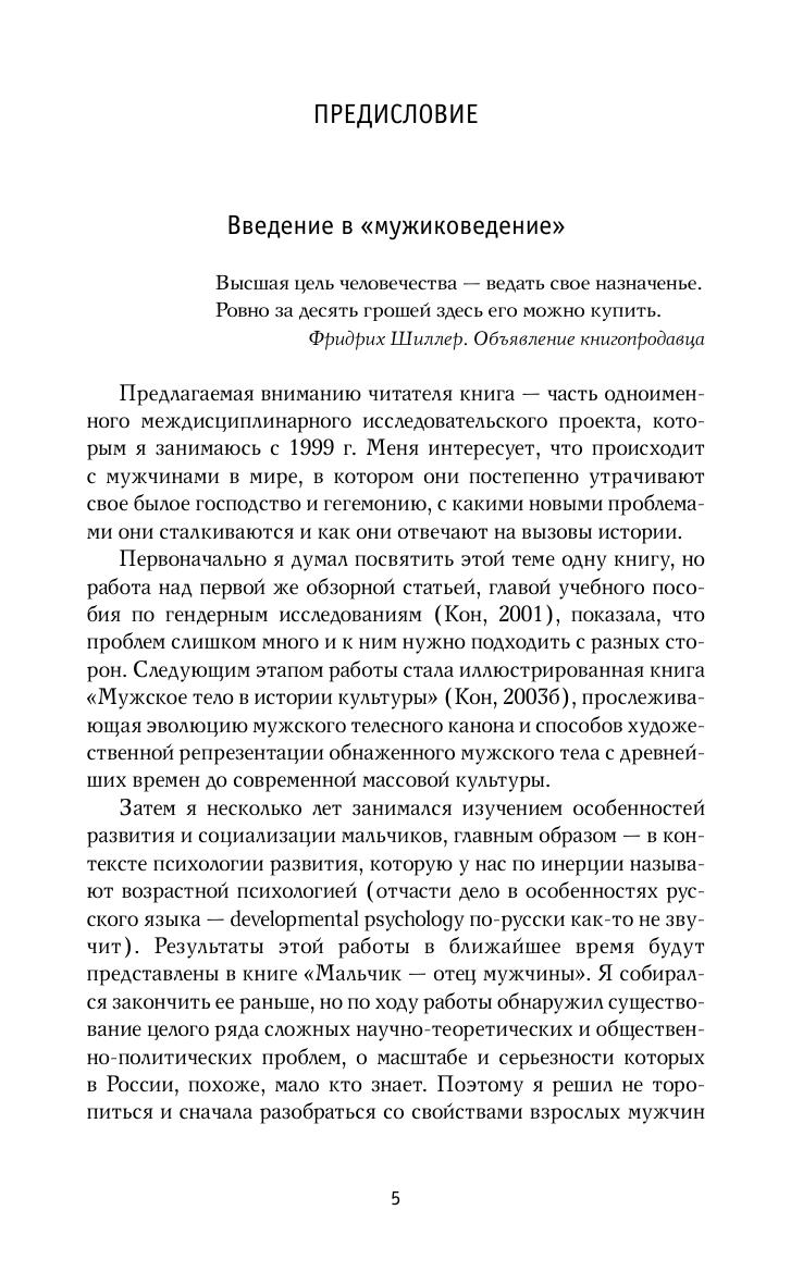В настоящее время во всем мире много говорят о кризисе маскулинности и о том, что происходит с мужчинами. Слова о феминизации мужчин, ослаблении отцовства и т. п. буквально не сходят со страниц массовых изданий. Однако зачастую теоретические споры не основываются на тщательном изучении фактов, а судьба России рассматривается так, будто она существует сама по себе, отдельно от остального человечества. В этой книге известный российский социолог И. С. Кон пытается прежде всего корректно сформулировать возникшие проблемы. Что значит кризис маскулинности? Как и почему меняются наши представления о маскулинности? Какие глобальные вызовы стоят перед современными мужчинами, способны ли они с ними справиться и как эти общие проблемы решаются в России? Книга основана на результатах новейших мировых социологических, психологических и антропологических исследований. В ней нет технических деталей, но она рассчитана на вдумчивое чтение и самостоятельное размышление и может быть использована в качестве пособия по социологии, гендерным исследованиям, социальной антропологии и психологии.