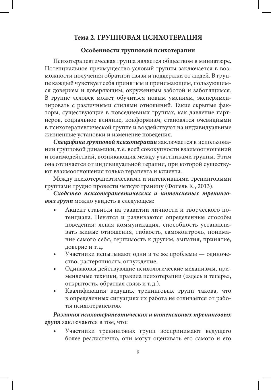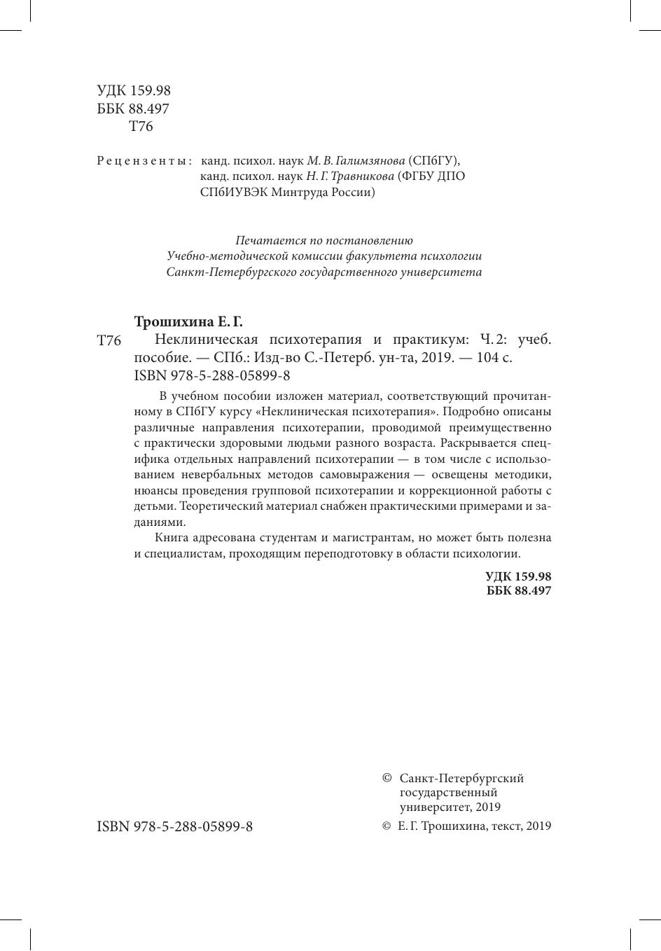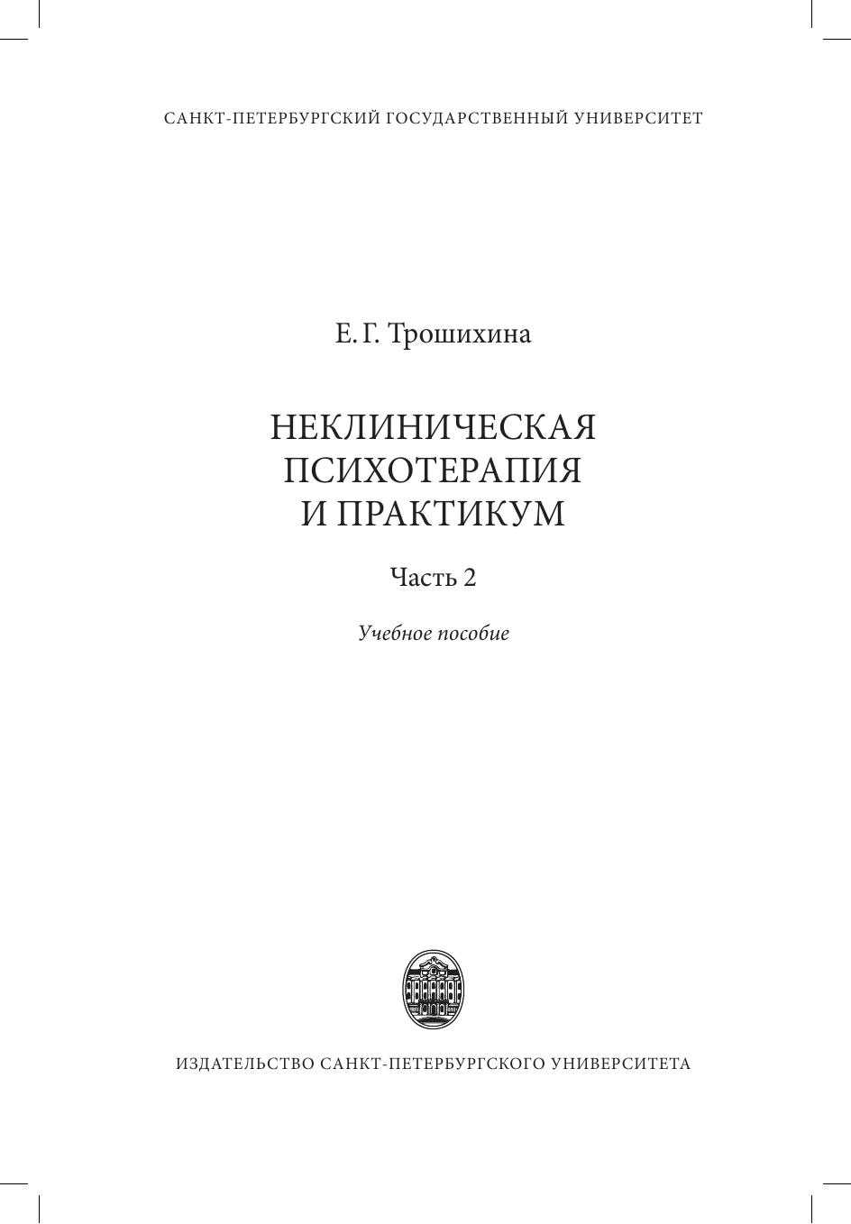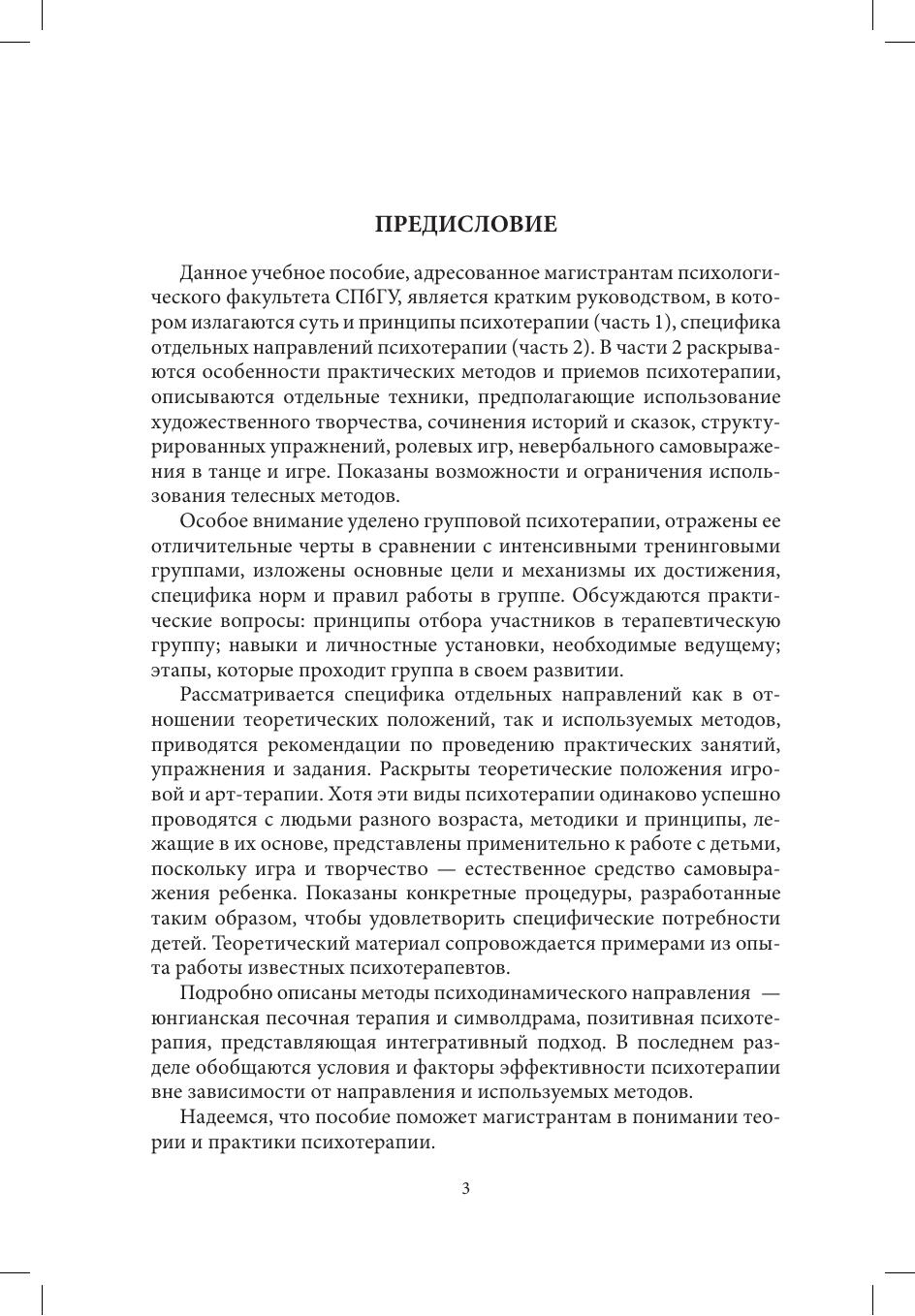 В учебном пособии изложен материал, соответствующий прочитанному в СПбГУ курсу «Неклиническая психотерапия». Подробно описаны различные направления психотерапии, проводимой преимущественно с практически здоровыми людьми разного возраста. Раскрывается специфика отдельных направлений психотерапии — в том числе с использованием невербальных методов самовыражения — освещены методики, нюансы проведения групповой психотерапии и коррекционной работы с детьми. Теоретический материал снабжен практическими примерами и заданиями. Книга адресована студентам и магистрантам, но может быть полезна и специалистам, проходящим переподготовку в области психологии.