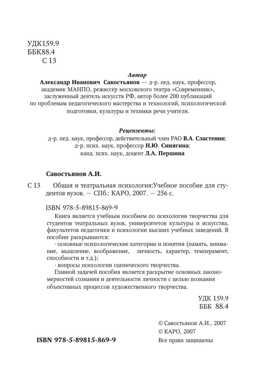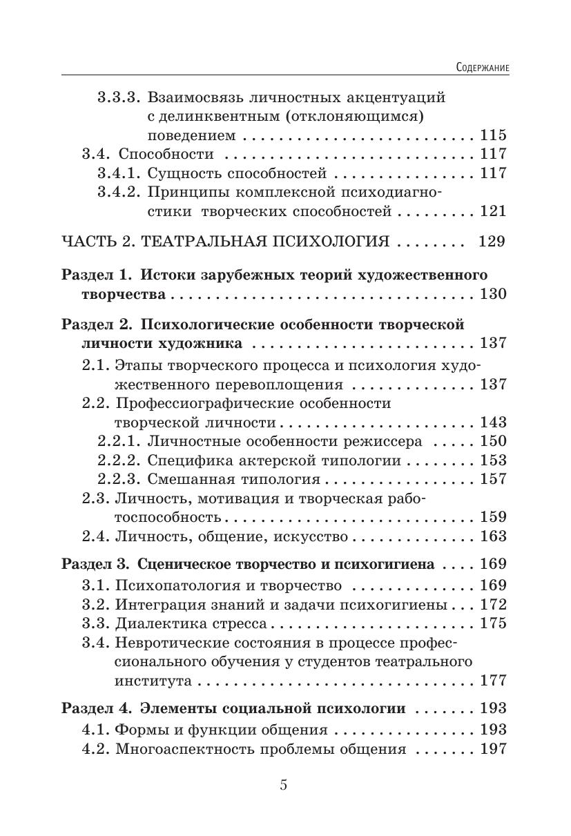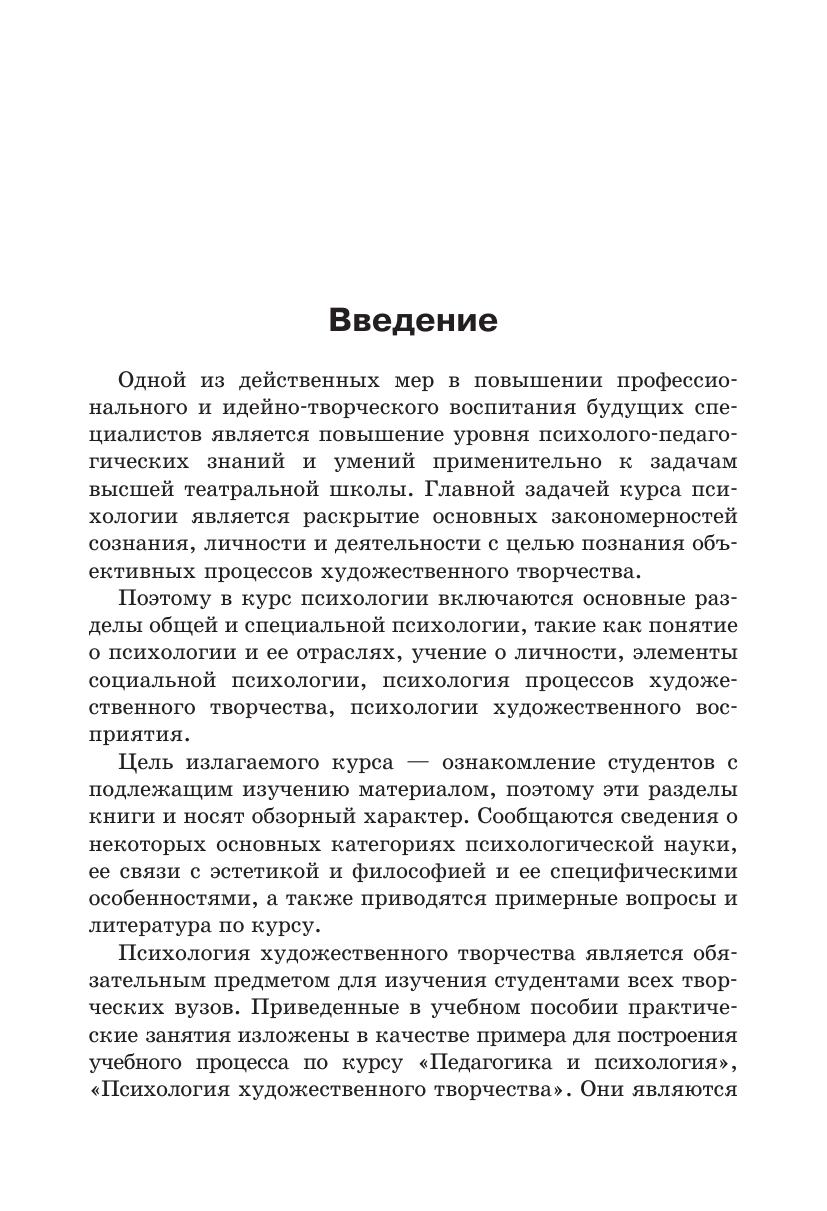 Книга является учебным пособием по психологии творчества для студентов театральных вузов, университетов культуры и искусства, факультетов педагогики и психологии высших учебных заведений. В пособии раскрываются: • основные психологические категории и понятия (память, внимание, мышление, воображение, личность, характер, темперамент, способности и т.д.) • вопросы психологии сценического творчества. Главной задачей пособия является раскрытие основных закономерностей сознания и деятельности личности с целью познания объективных процессов художественного творчества.