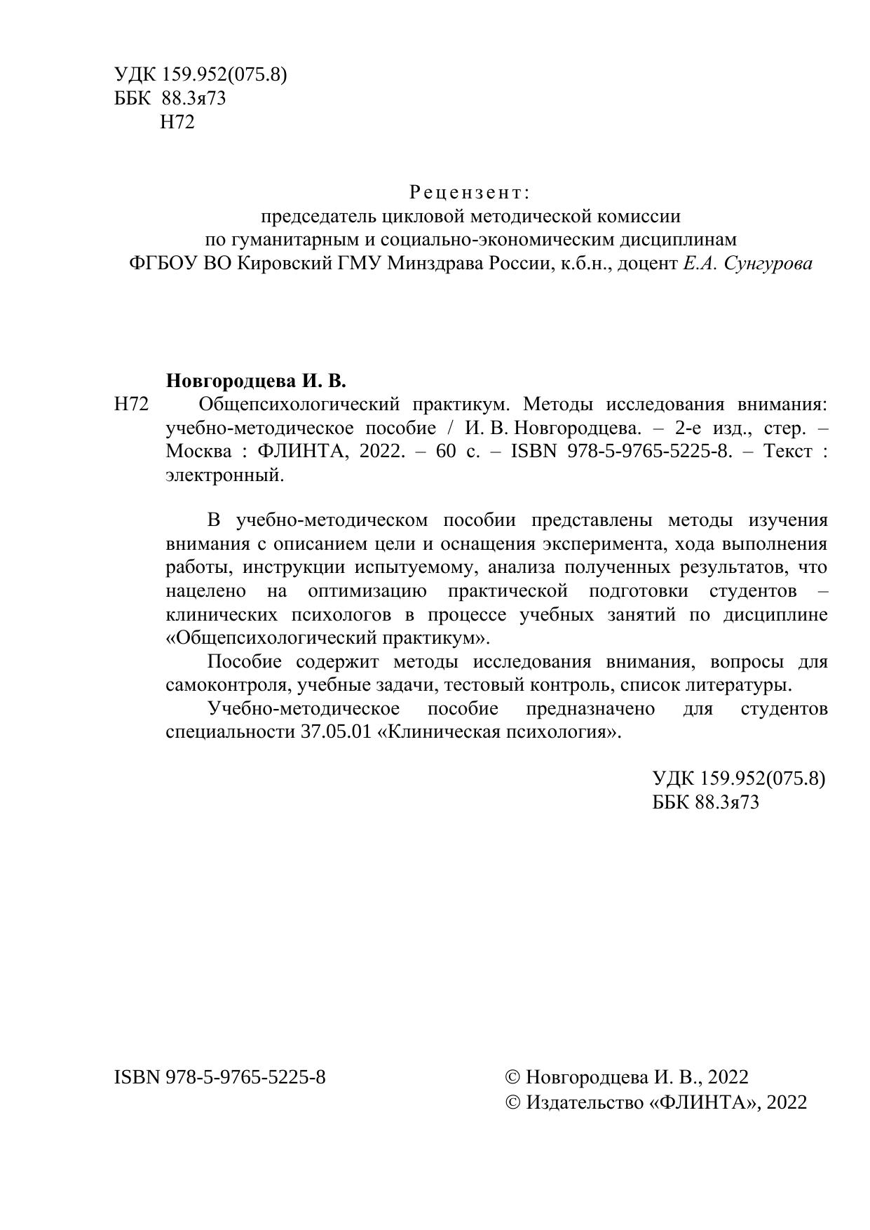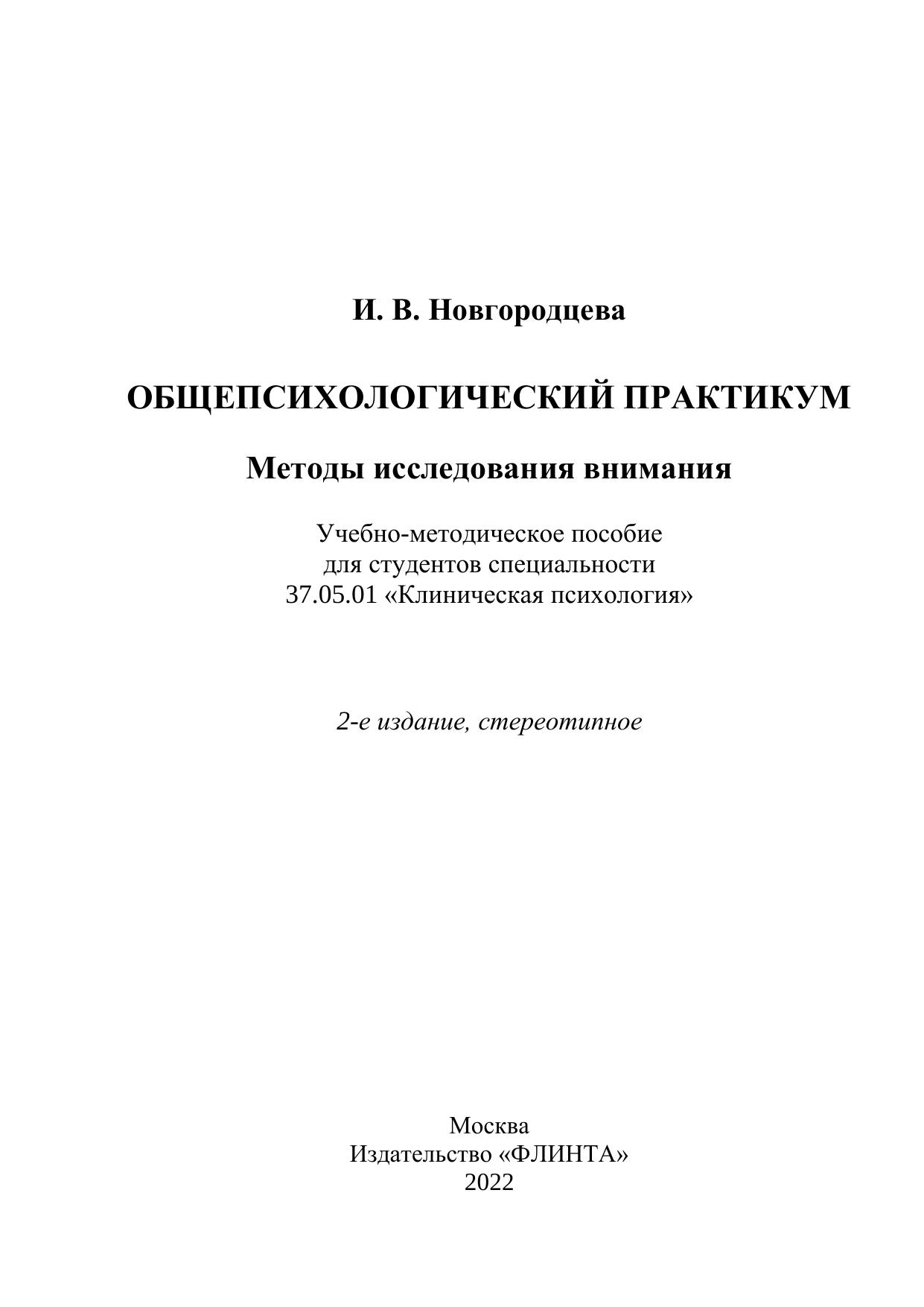 В учебно-методическом пособии представлены методы изучения внимания с описанием цели и оснащения эксперимента, хода выполнения работы, инструкции испытуемому, анализа полученных результатов, что нацелено на оптимизацию практической подготовки студентов – клинических психологов в процессе учебных занятий по дисциплине «Общепсихологический практикум».