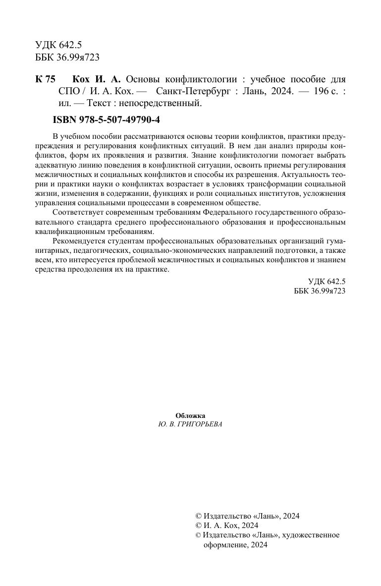 В учебном пособии рассматриваются основы теории конфликтов, практики предупреждения и регулирования конфликтных ситуаций. В нем дан анализ природы конфликтов, форм их проявления и развития. Знание конфликтологии помогает выбрать адекватную линию поведения в конфликтной ситуации, освоить приемы регулирования межличностных и социальных конфликтов и способы их разрешения. Актуальность теории и практики науки о конфликтах возрастает в условиях трансформации социальной жизни, изменения в содержании, функциях и роли социальных институтов, усложнения управления социальными процессами в современном обществе. Соответствует современным требованиям Федерального государственного образовательного стандарта среднего профессионального образования и профессиональным квалификационным требованиям. Рекомендуется студентам профессиональных образовательных организаций гуманитарных, педагогических, социально-экономических направлений подготовки, а также всем, кто интересуется проблемой межличностных и социальных конфликтов и знанием средства преодоления их на практике.